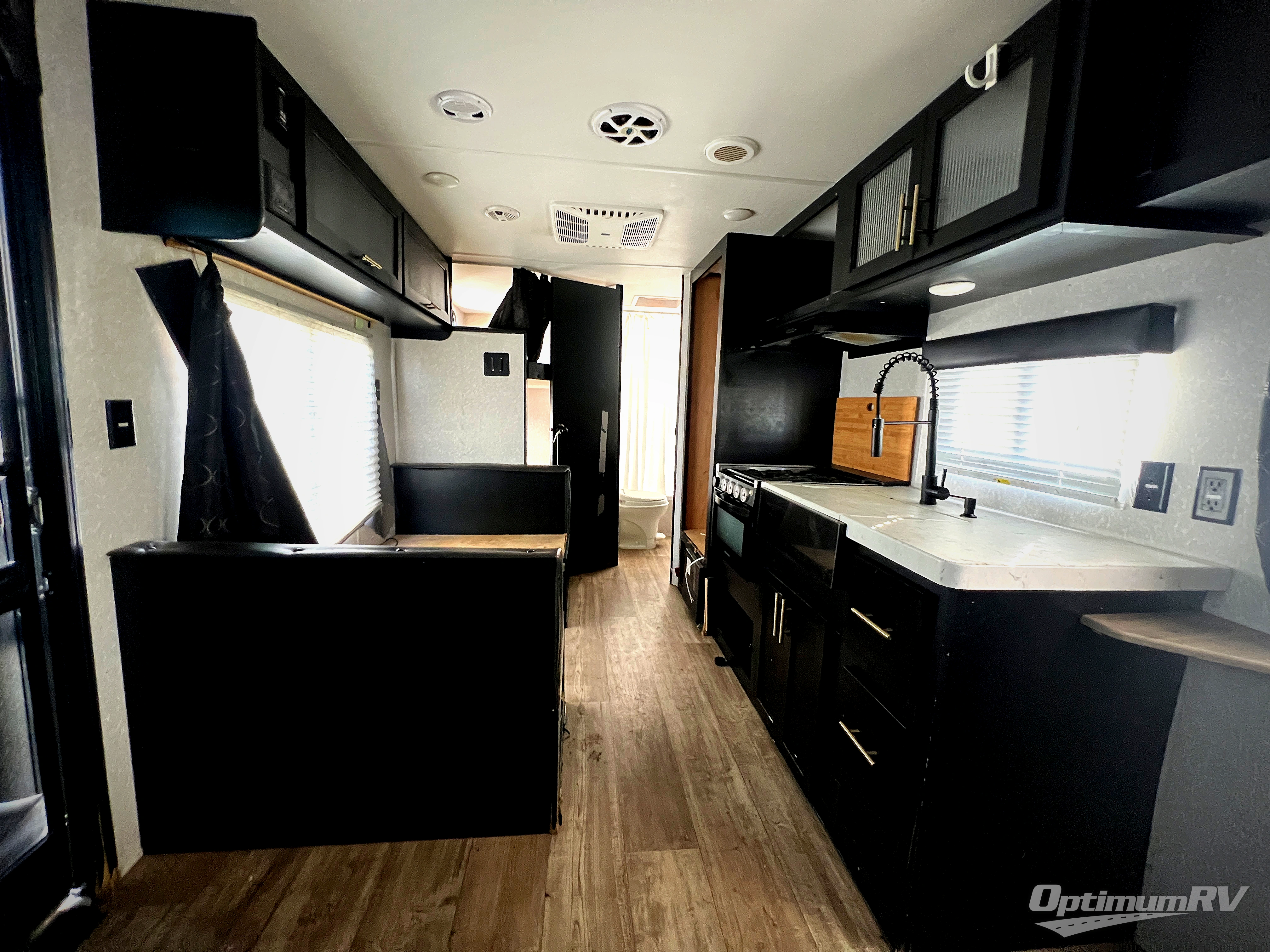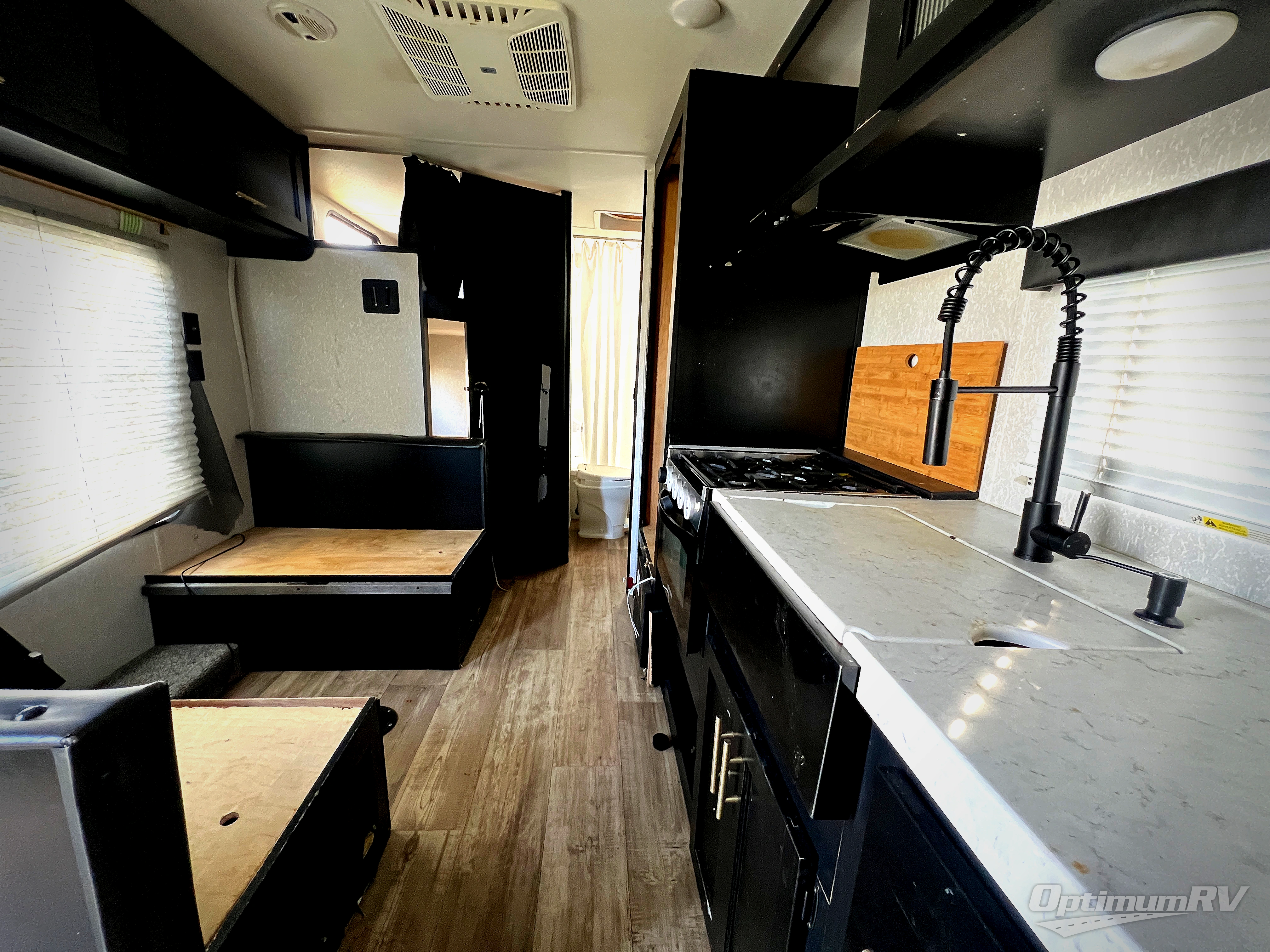 Enjoy cooking for nine in this Cherokee Grey Wolf travel trailer. With a three-burner cooktop, an overhead microwave, and an oven, you can easily cook just like home. The residential farm-style stainless steel sink makes cleaning your larger pots and pans quite simple, and the large overhead cabinets make storage an easy task as well. There is plenty of seating for the whole gang with the sofa and the booth dinette to play a game or two after you have enjoyed your delicious meal. Your kiddos are sure to love having their own set of double-size bunks conveniently located next to the rear bath, and you will love having your own front semi-private bedroom when you close the privacy curtain. You can also create some outdoor living space beneath the 15' power awning so that you can enjoy the great outdoors whether rain or shine!