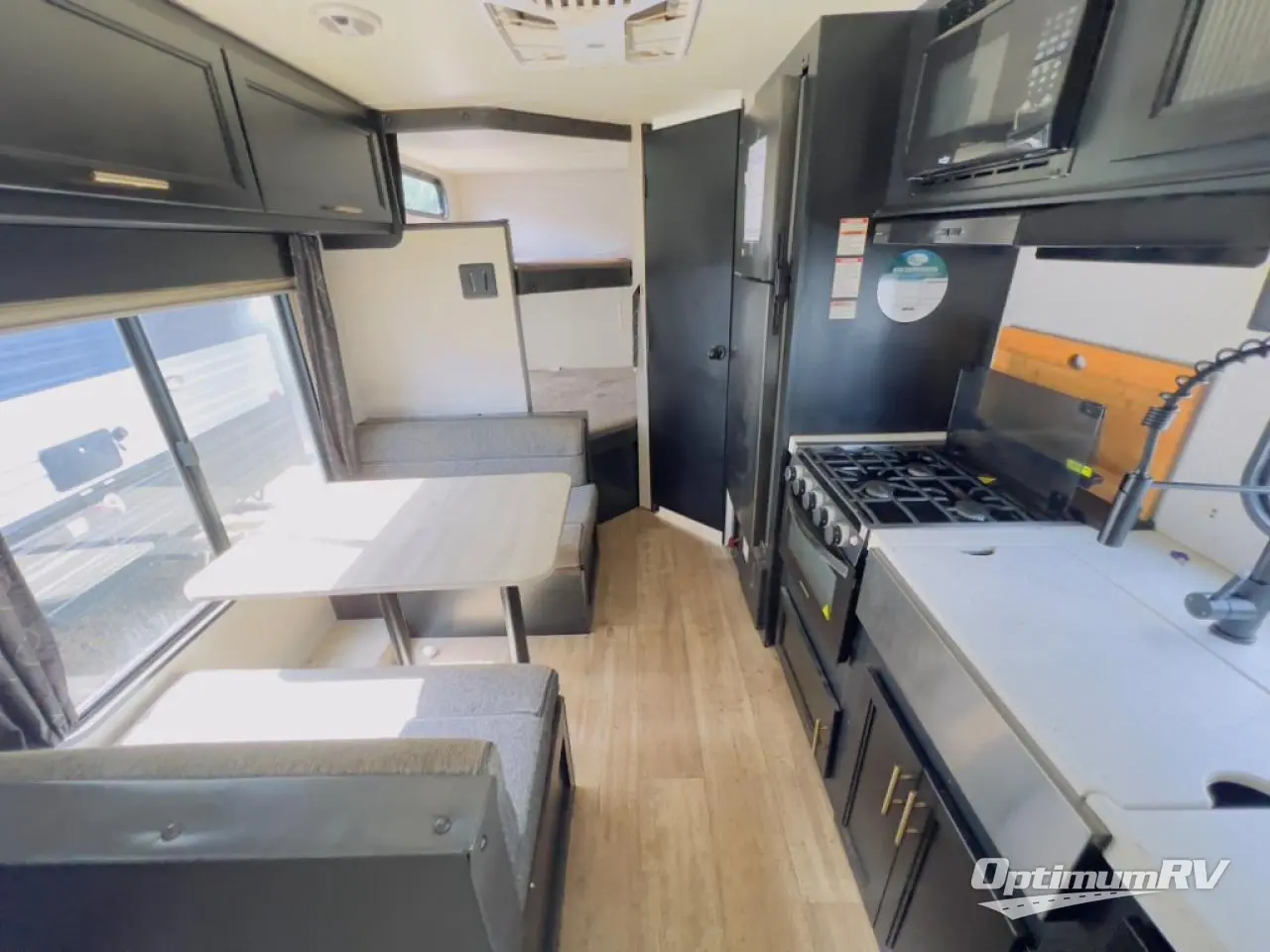 Enjoy cooking for nine in this Cherokee Grey Wolf travel trailer. With a three-burner cooktop, an overhead microwave, and an oven, you can easily cook just like home. The residential farm-style stainless steel sink makes cleaning your larger pots and pans quite simple, and the large overhead cabinets make storage an easy task as well. There is plenty of seating for the whole gang with the sofa and the booth dinette to play a game or two after you have enjoyed your delicious meal. Your kiddos are sure to love having their own set of double-size bunks conveniently located next to the rear bath, and you will love having your own front semi-private bedroom when you close the privacy curtain. You can also create some outdoor living space beneath the 15' power awning so that you can enjoy the great outdoors whether rain or shine!
