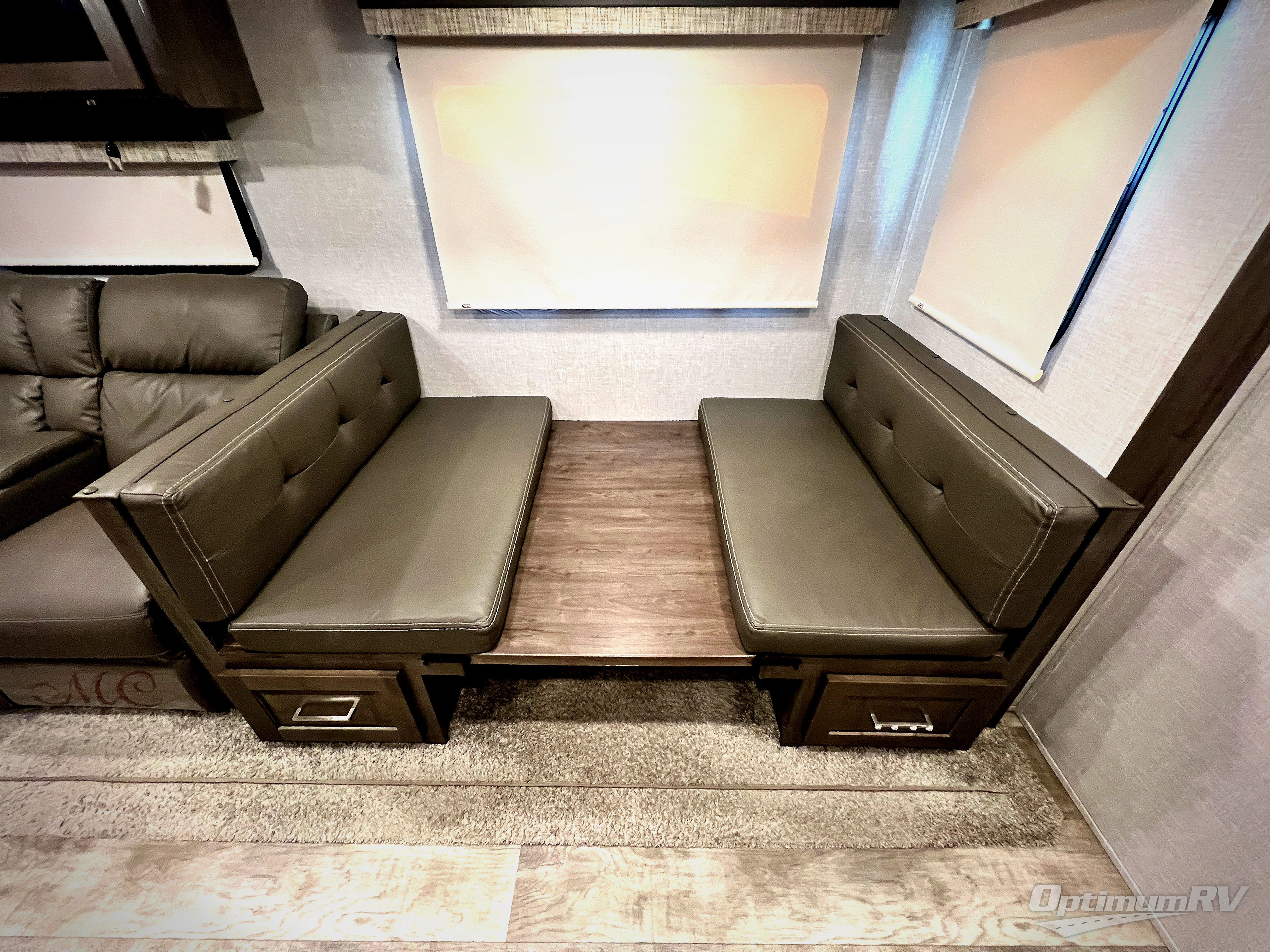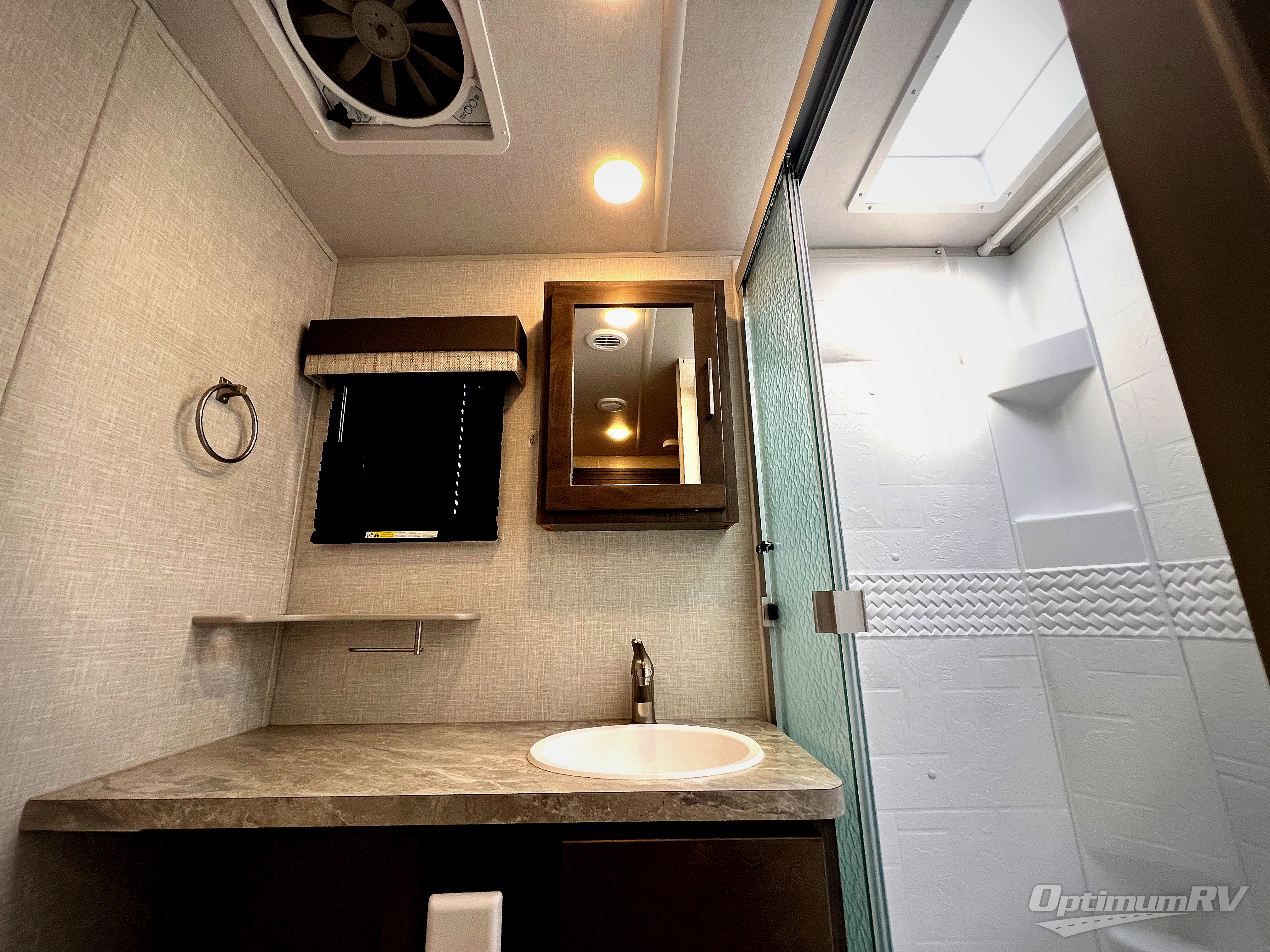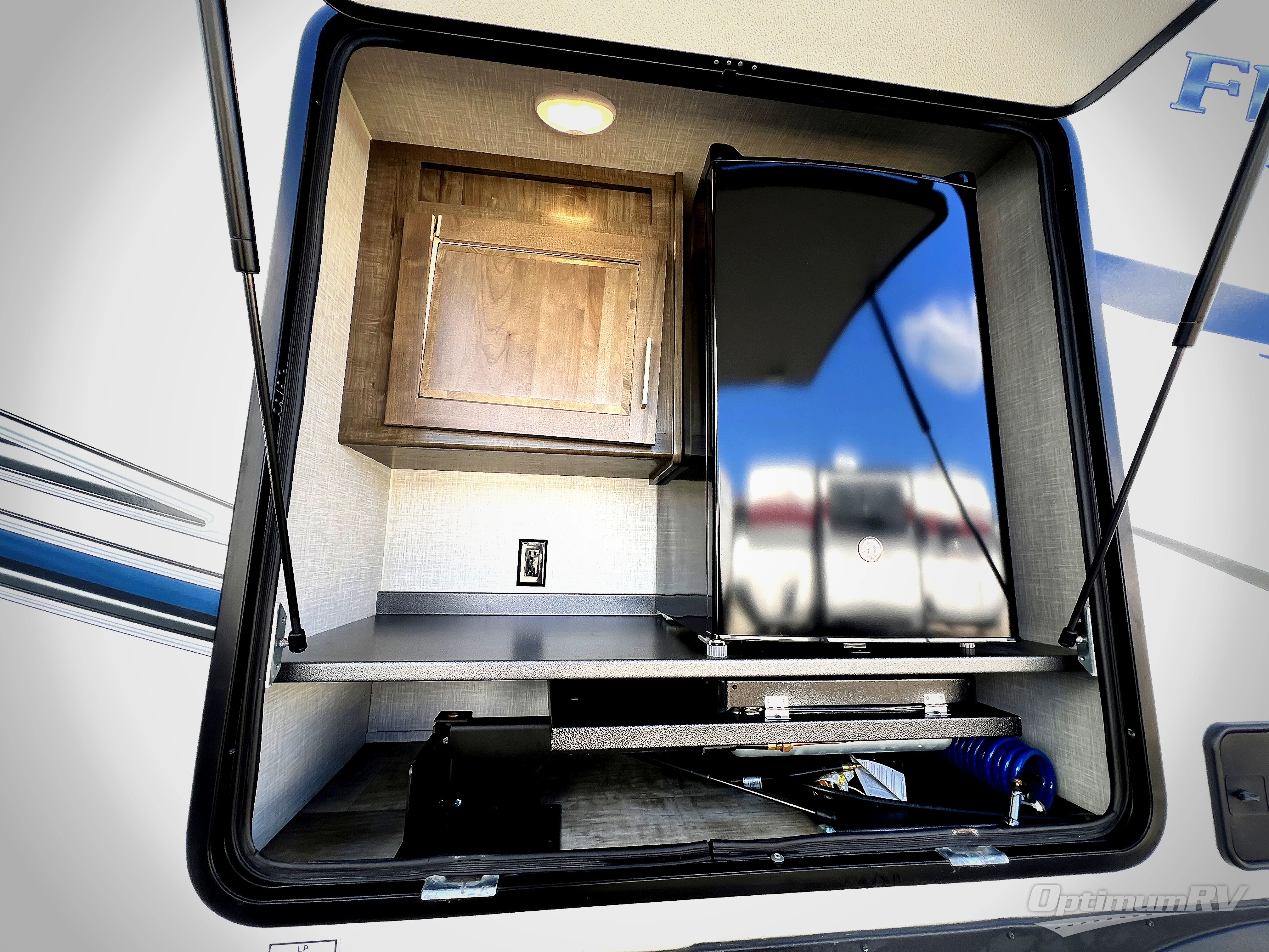 Whether you camp at state parks, National forests or on your friend's land, this trailer offers you plenty of floor space thanks to the two slide outs! As you enter the main entrance near the rear kitchen you can grab a drink from the refrigerator or a snack from the pantry and relax on the 60" theater seating or sit at the booth dinette. The LED TV offers entertainment while the fireplace will keep you cozy during the cooler months. Everyone will appreciate having a full bathroom to get cleaned up in, and the front bedroom gives you privacy and a queen bed slide, plus storage and the second exterior entry.