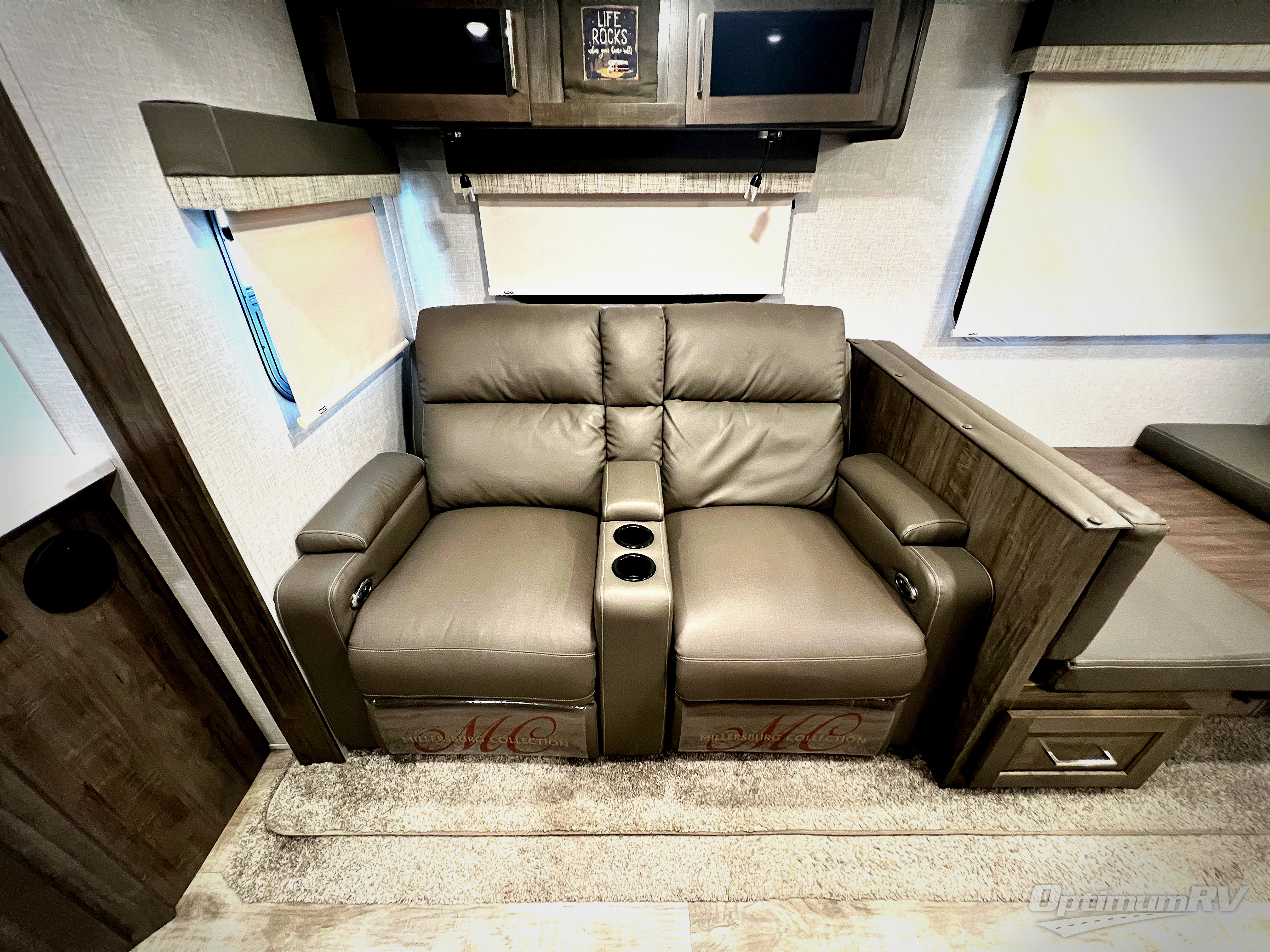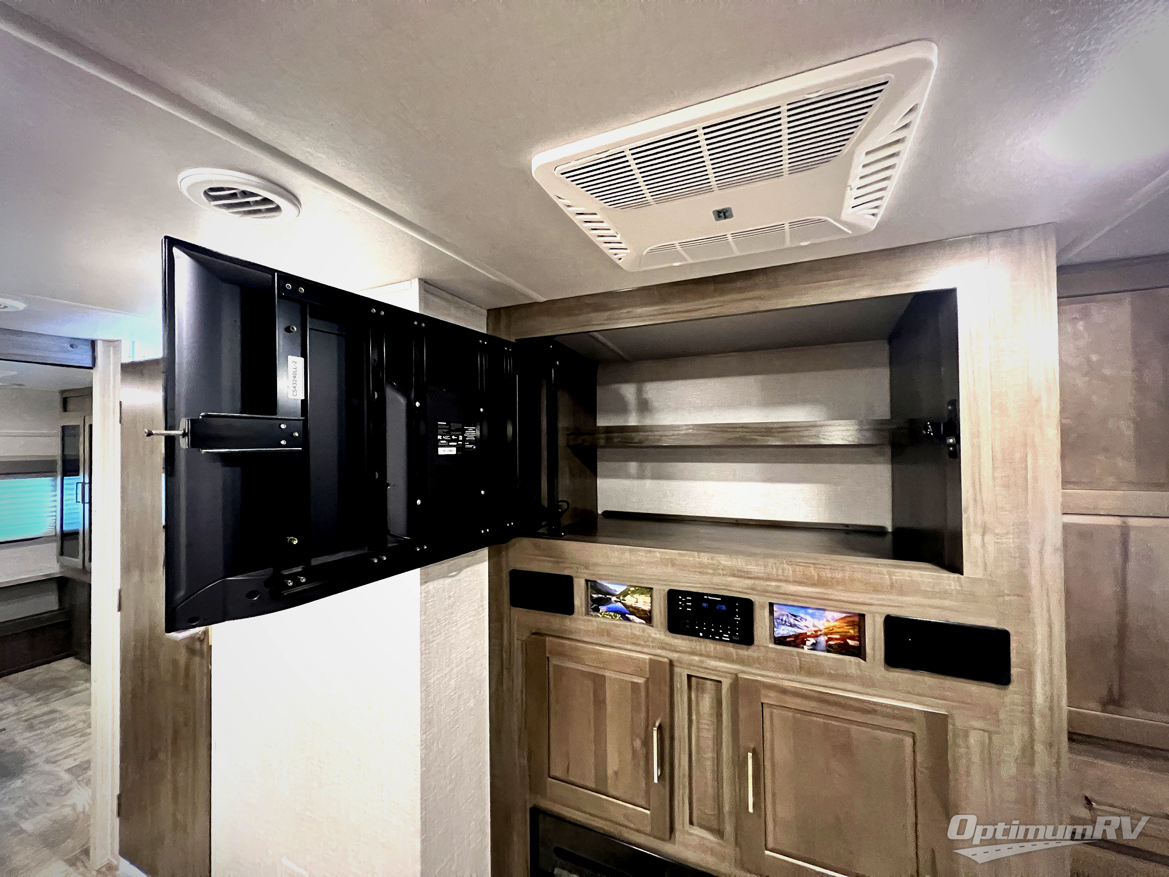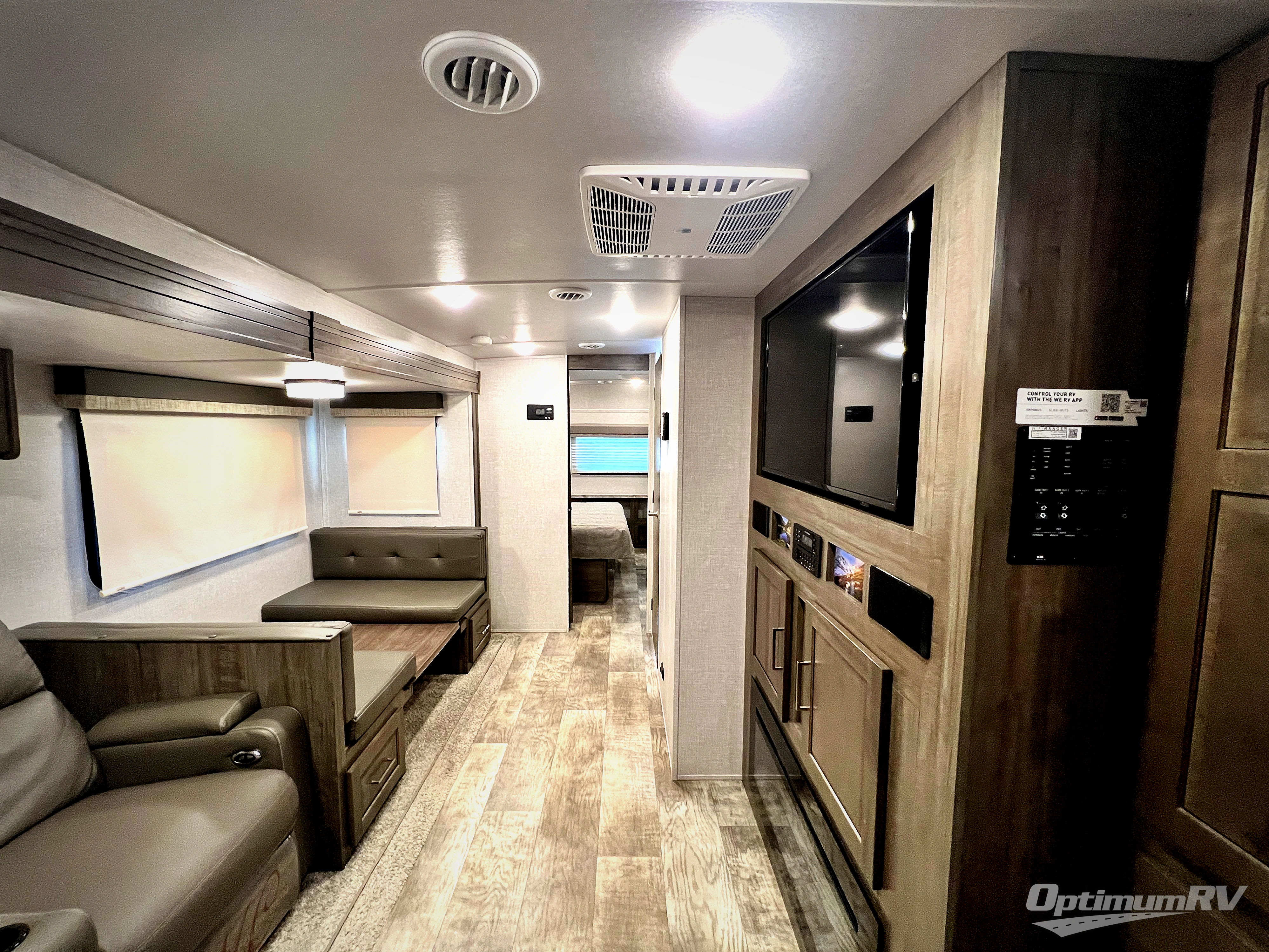 Whether you camp at state parks, National forests or on your friend's land, this trailer offers you plenty of floor space thanks to the two slide outs! As you enter the main entrance near the rear kitchen you can grab a drink from the refrigerator or a snack from the pantry and relax on the 60" theater seating or sit at the booth dinette. The LED TV offers entertainment while the fireplace will keep you cozy during the cooler months. Everyone will appreciate having a full bathroom to get cleaned up in, and the front bedroom gives you privacy and a queen bed slide, plus storage and the second exterior entry.