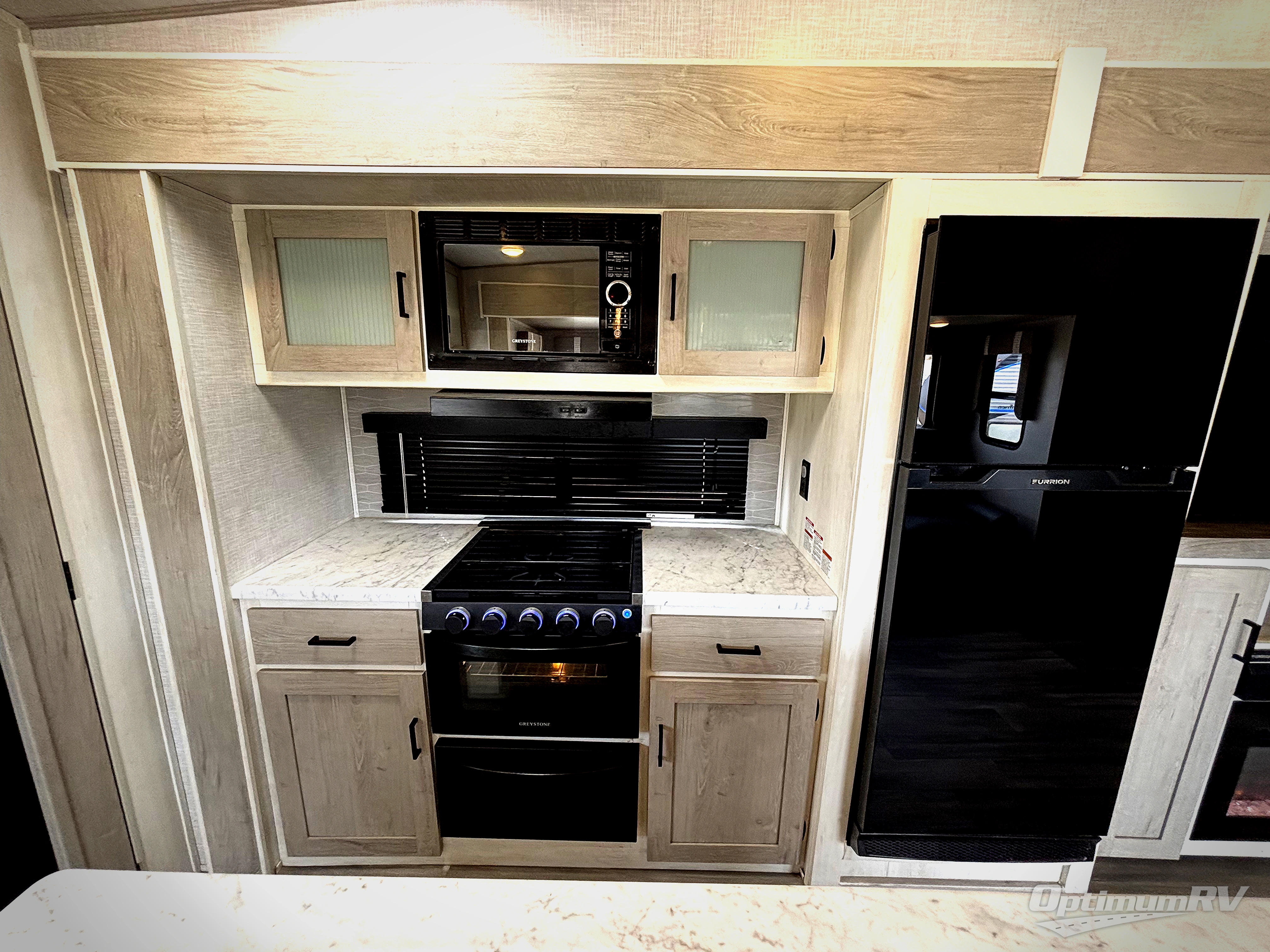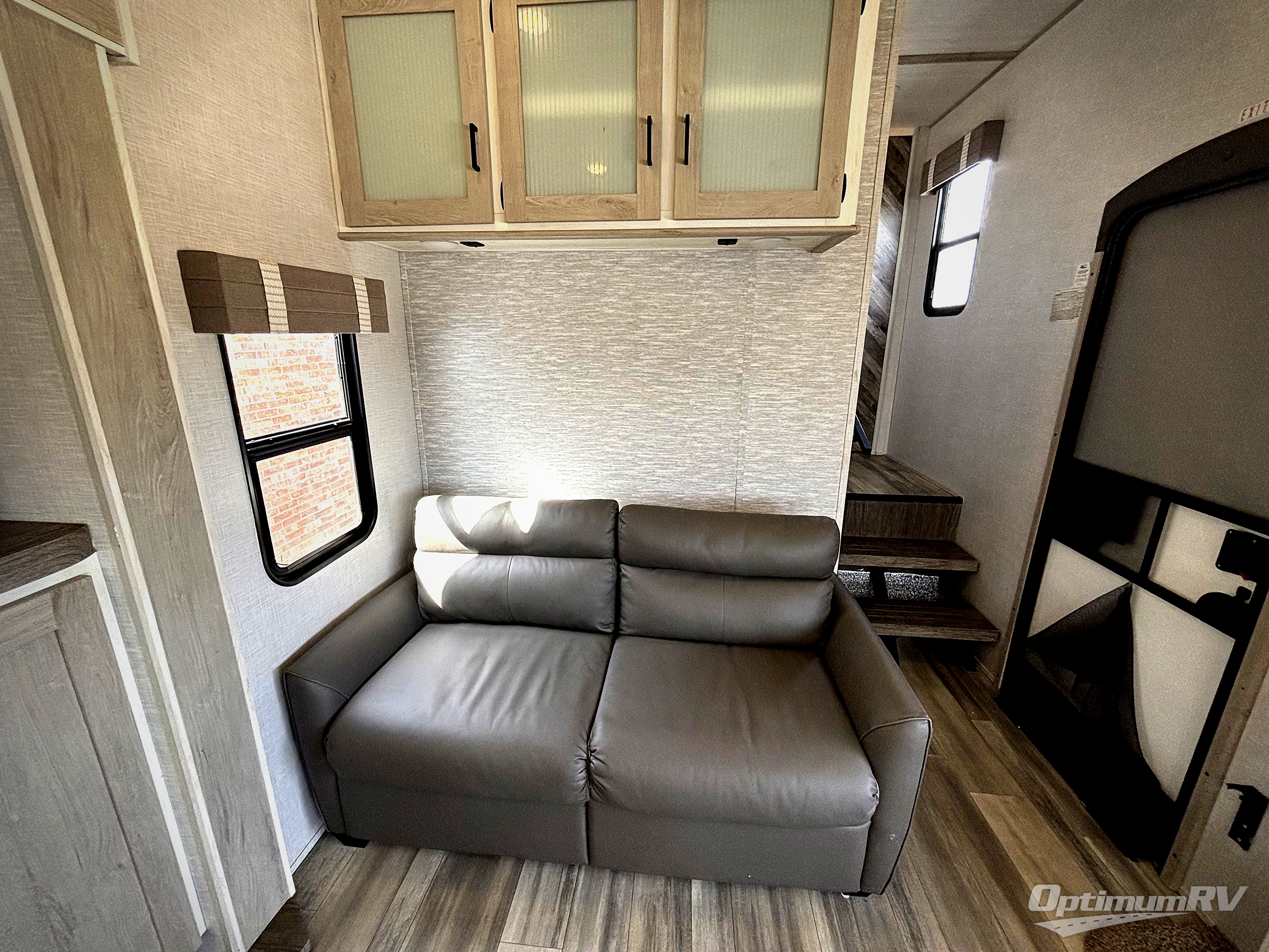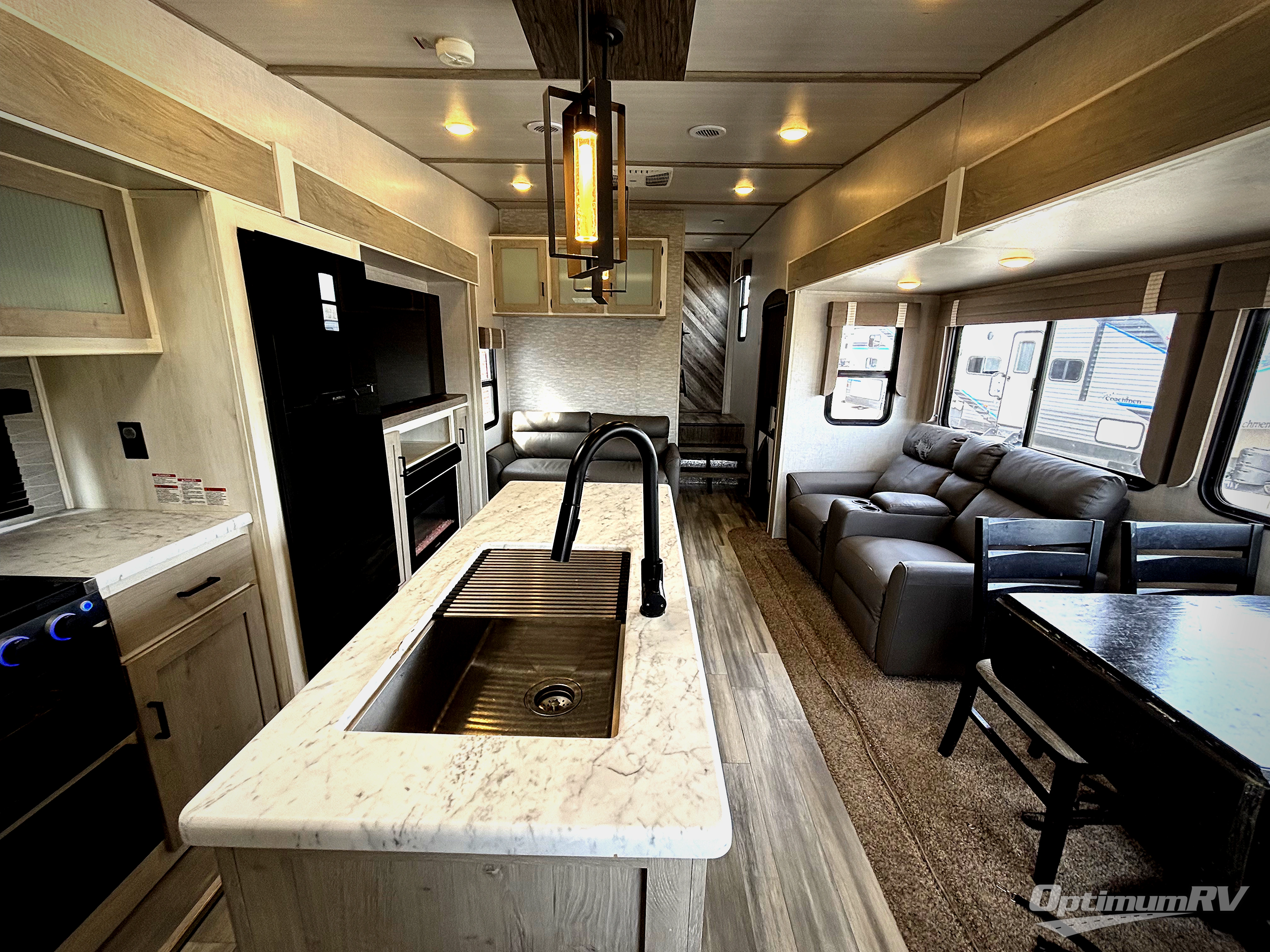 This fifth wheel is spacious, inviting and comfortable! Walk right inside to the combined kitchen and living area with two opposing slides, or walk around the kitchen island to access the floor-to-ceiling pantry. There is a large counter space plus lots of upper and lower cabinets for your dishes, games, and such. You can dine or even work at the free standing dinette with chairs, and relax on the theater seats with USB ports or the tri-fold hide-a-bed sofa while watching the 50" LED TV with soundbar and enjoying the fireplace below. Get cleaned up in the full bathroom and fall quickly to sleep on the walk-around queen bed in the front bedroom that includes three wardrobes, a space prepped for a washer/dryer option, plus nightstands.