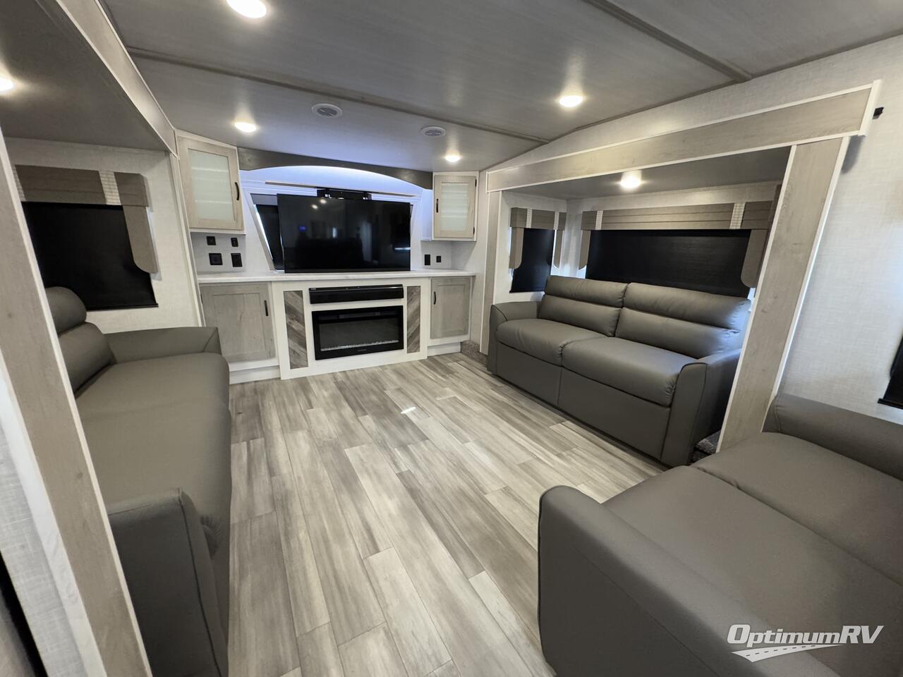 Looking for a separate living area from the kitchen in your next fifth wheel? Would you like to have a private bedroom with a rear window for more natural lighting and beautiful views of your campsite? Stop your search! This Impression includes both of your wishes, plus so much more. The front living area offers dual opposing slides for more floor space, theater seating, and a front wall with a 50" LED TV with soundbar, a fireplace, a front windshield plus storage for games, and such. The separate kitchen is centrally located and offers a slide out with kitchen appliances and a large pantry, and there is an L-shaped kitchen counter for more prep space and the single bowl sink, plus there is a breakfast bar with swivel bar stools to dine at. The full bathroom includes a walk-in shower, and the rear bedroom allows you to sleep like a queen and hang lots of clothes in the four wardrobes. You might even like to add a washer/dryer option in the prepped space to keep the linens clean the whole trip.