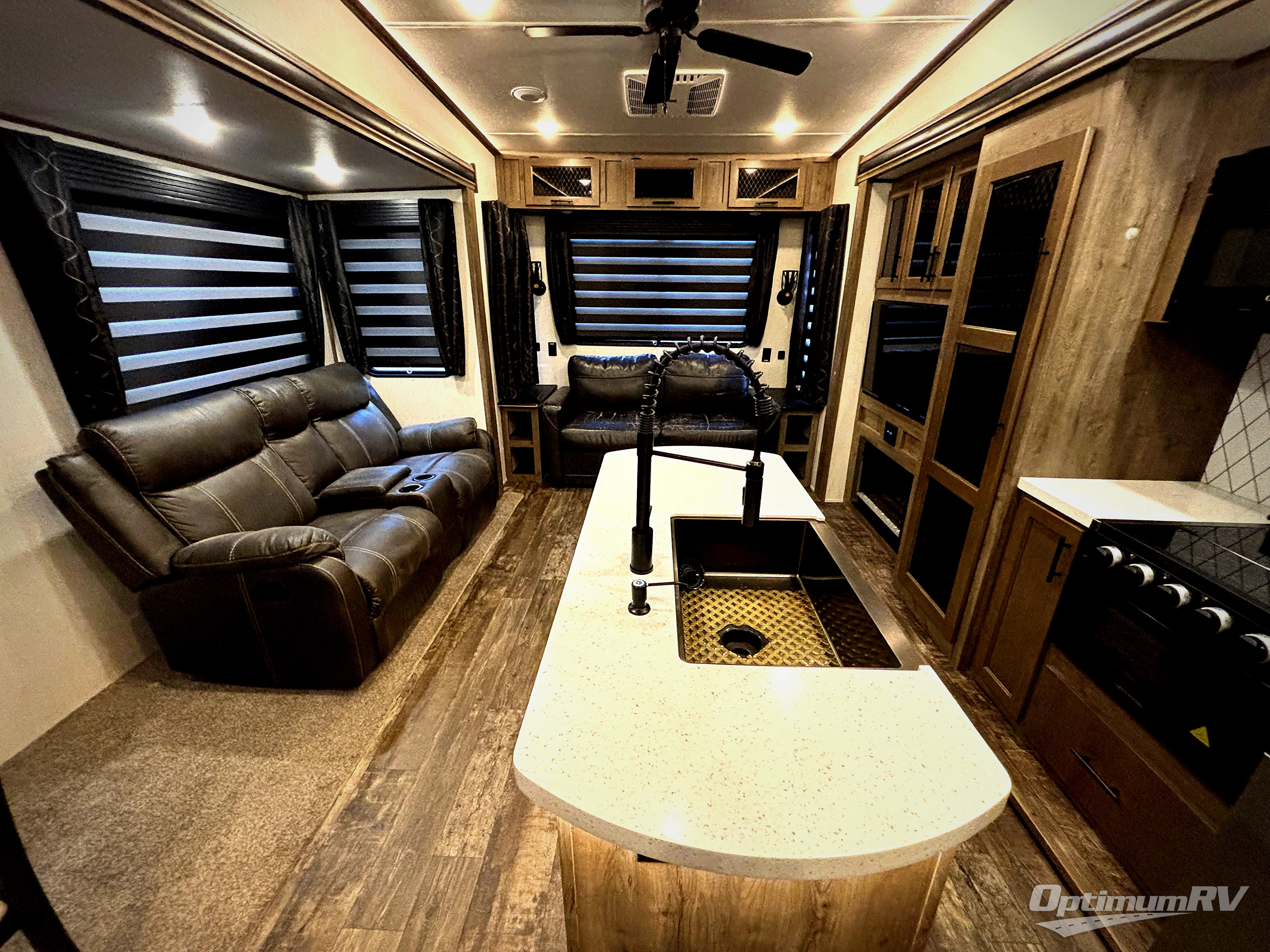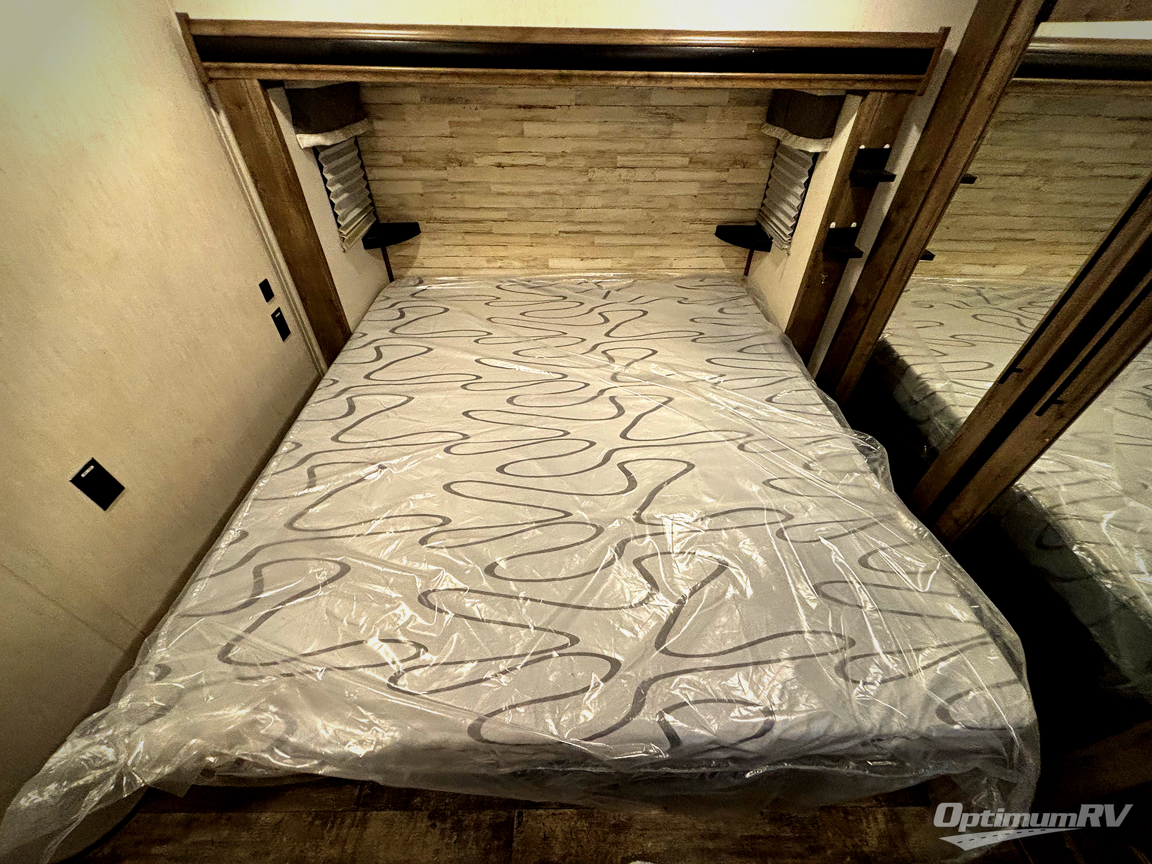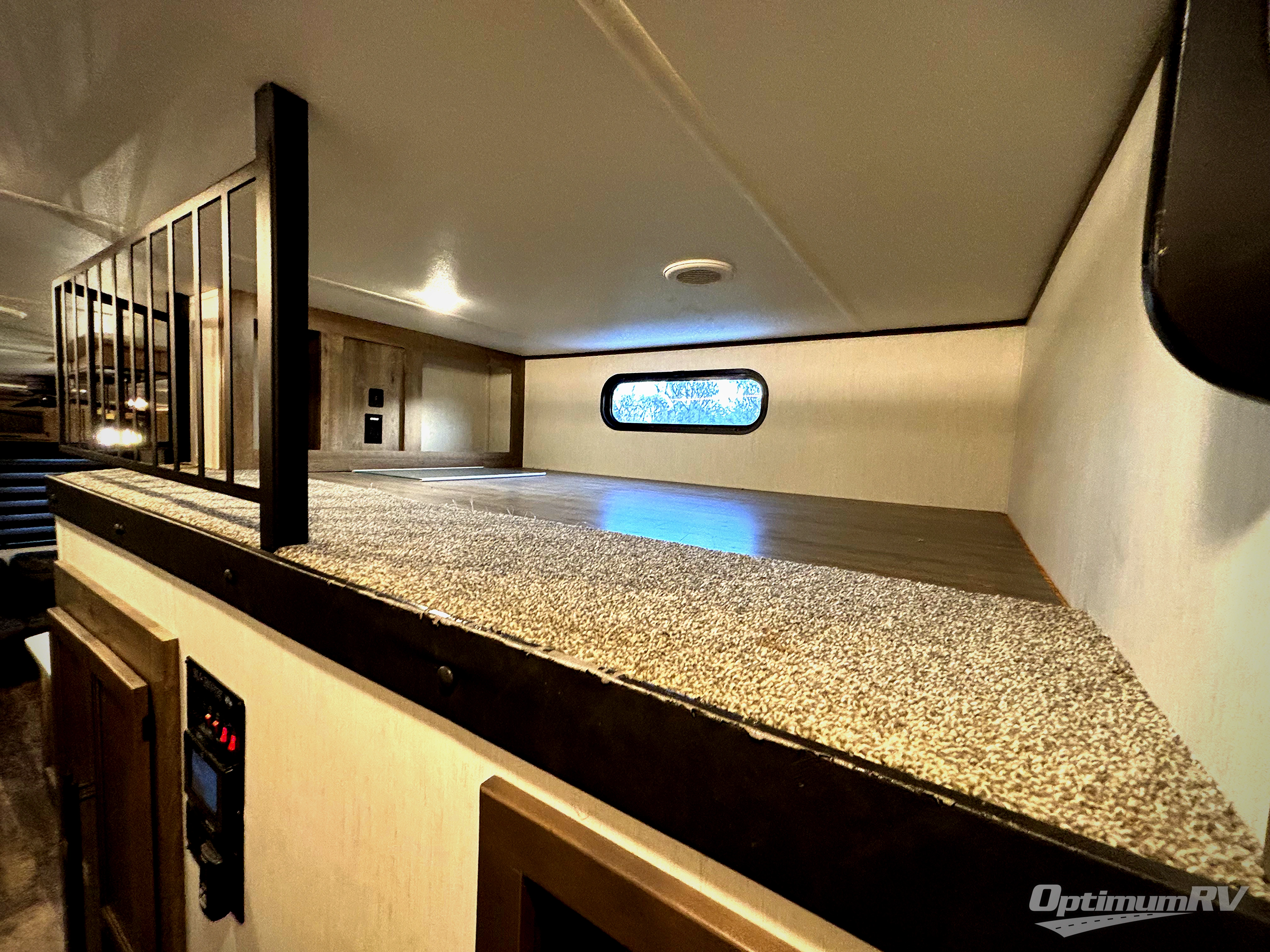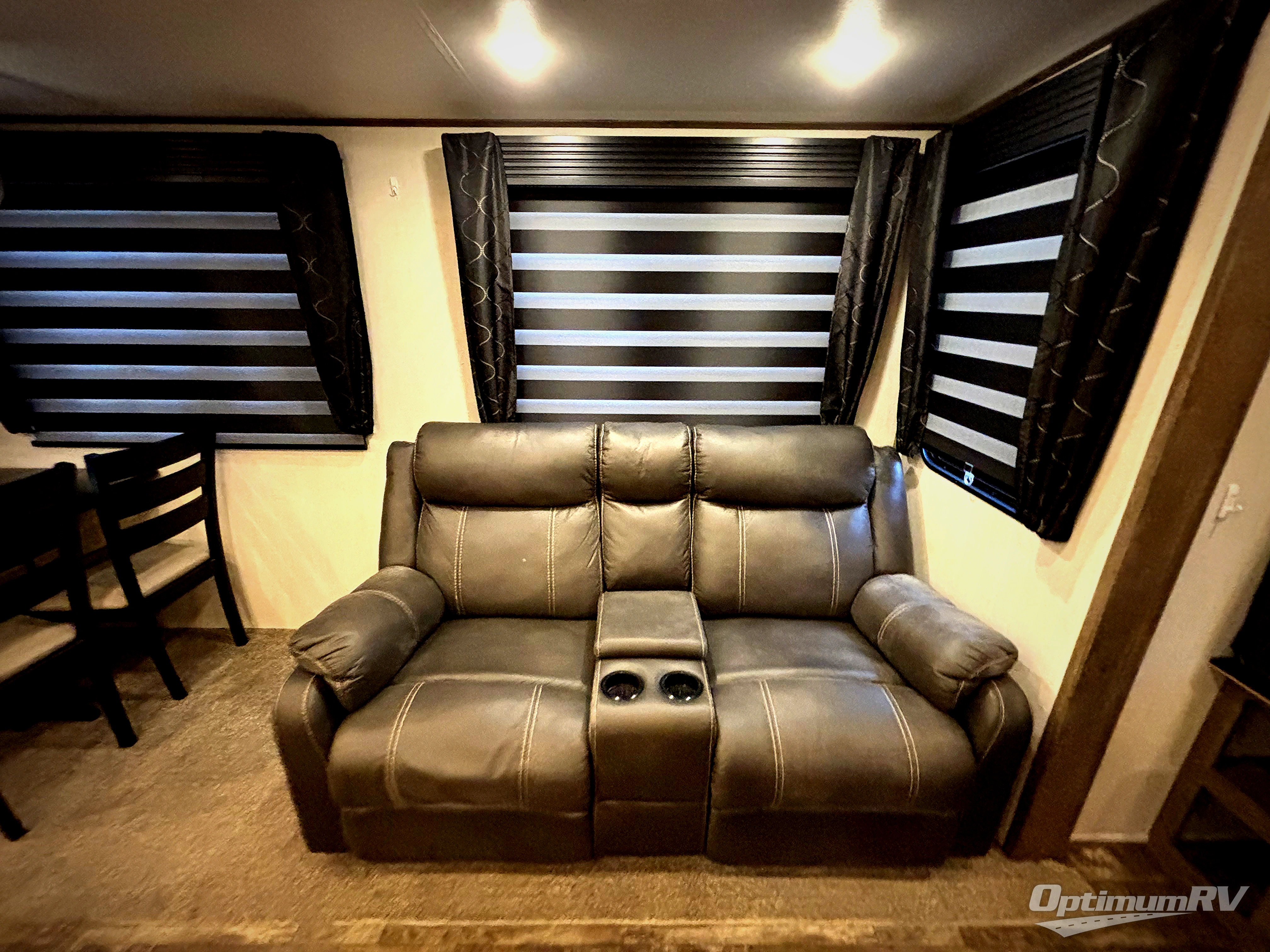 There's something for everyone in this Sabre fifth wheel! The front private bedroom includes king bed for maximum comfort and a front closet with an area prepped for the optional washer and dryer. Your guests will feel right at home in the second bedroom with a tri-fold sofa, plus a closet, dresser, and wardrobe for their clothes. There is even a loft above this room for the kids. The kitchen island not only provides extra counter and storage space, but is also makes cleaning up even easier with the farm-style sink and deluxe pull-down faucet. After you have spent a fun day in the sun, head to the rear living area and relax on either the tri-fold sofa which can be transformed into an extra sleeping space or on the theatre seating with heat and massage. As you sit back and relax, you'll find a fireplace directly across with a large residential TV above it for you to watch your favorite movie!
