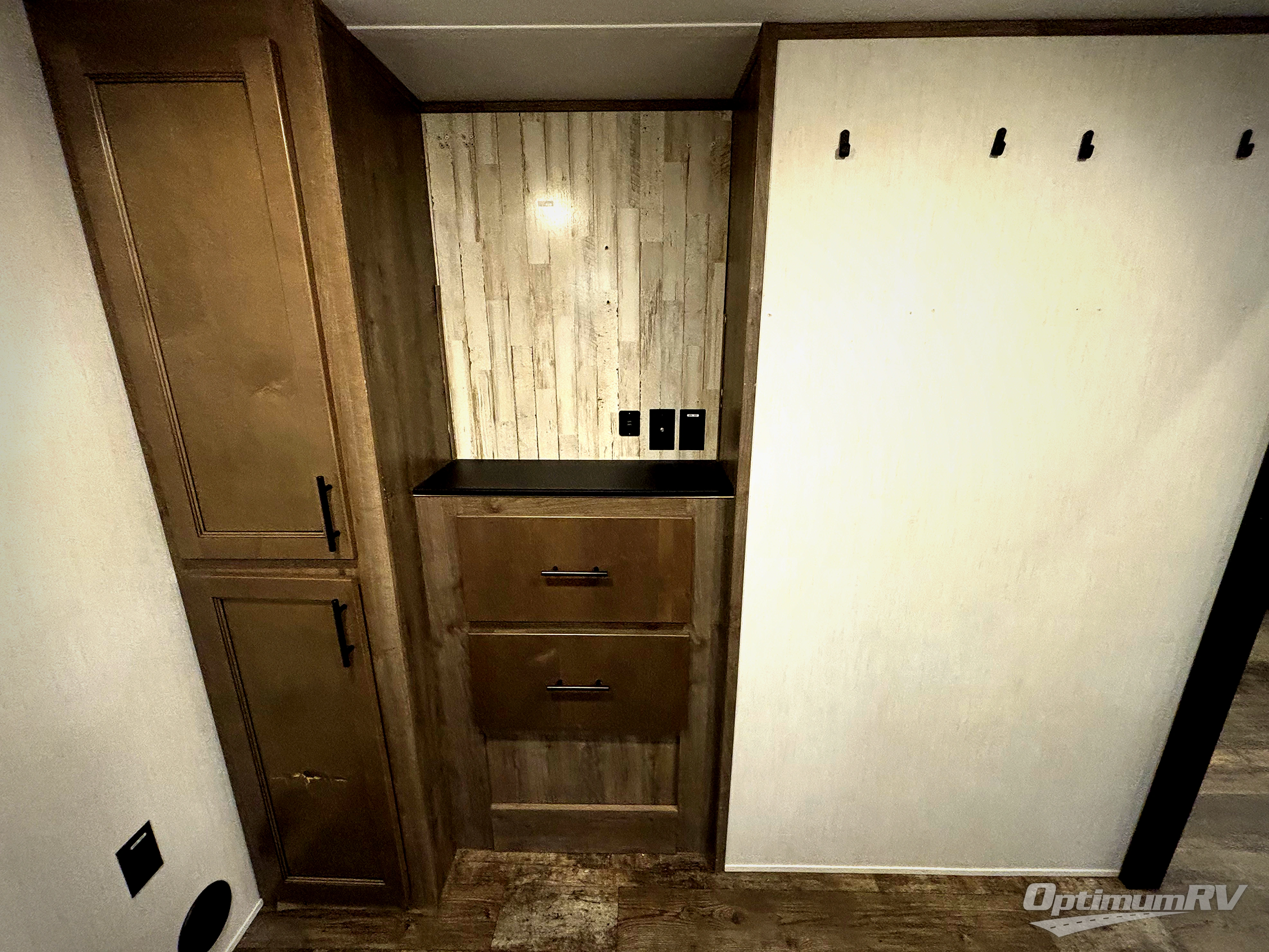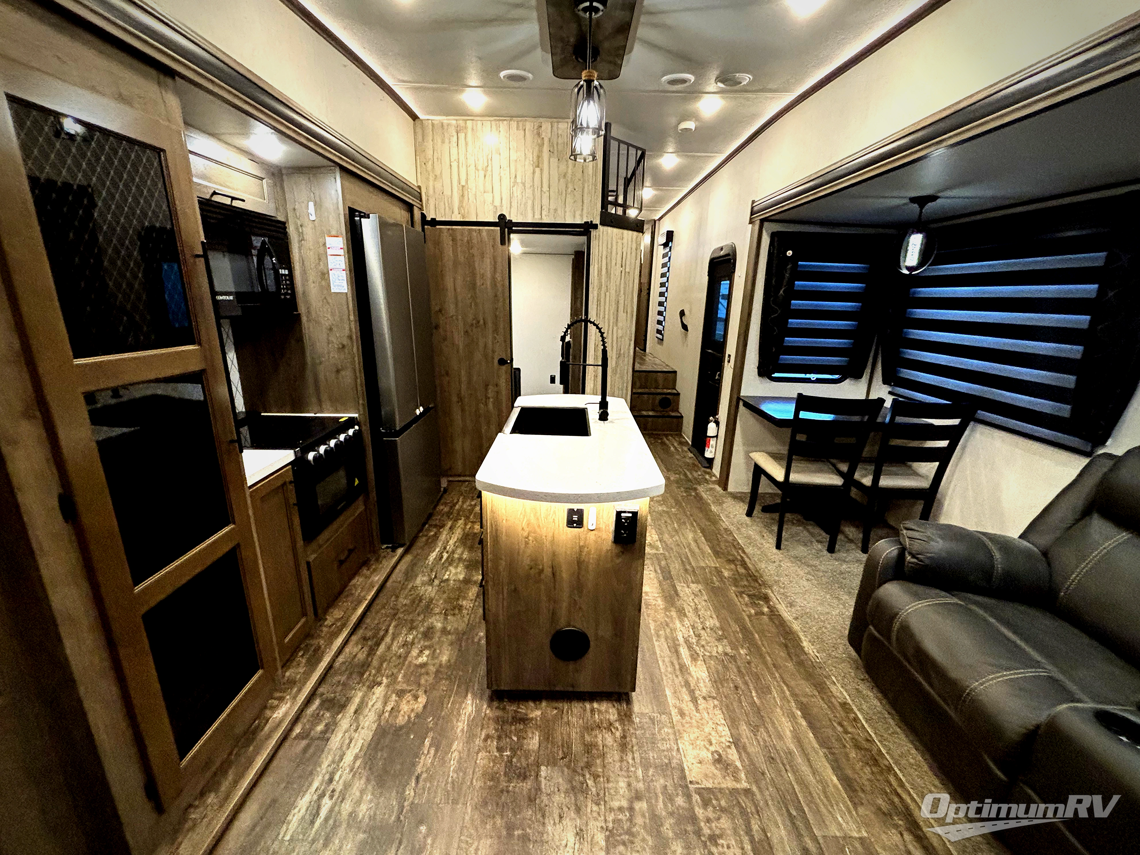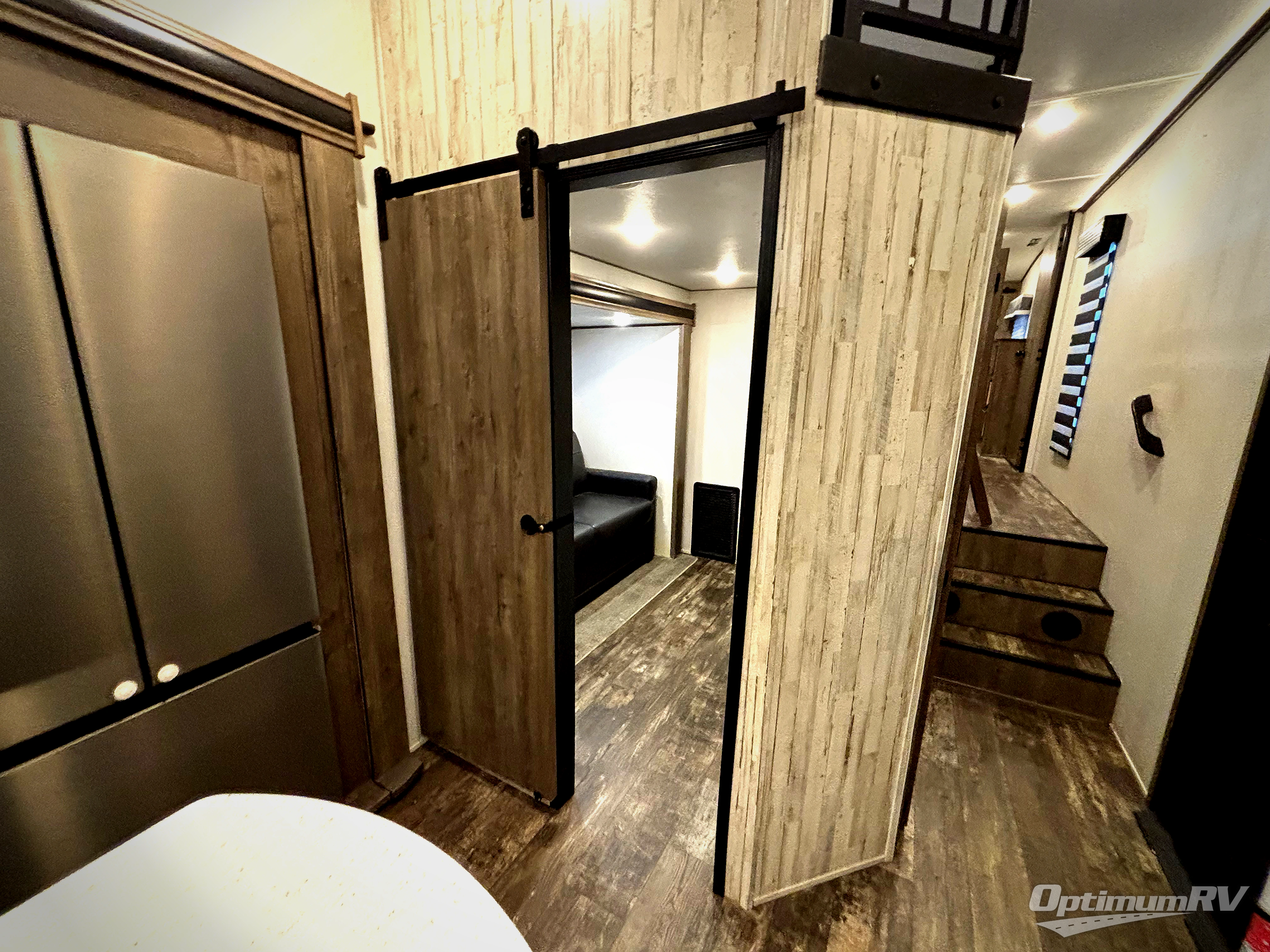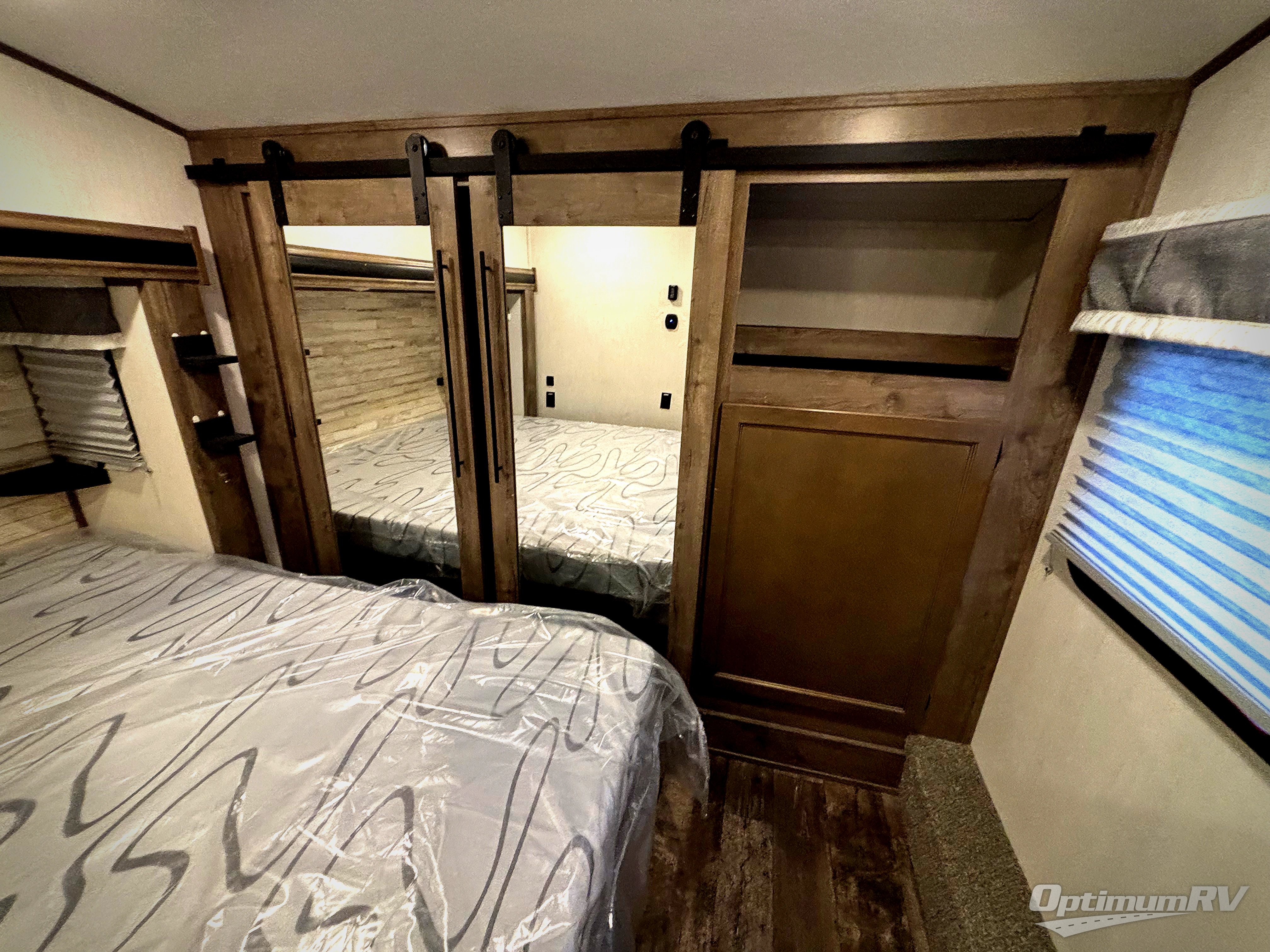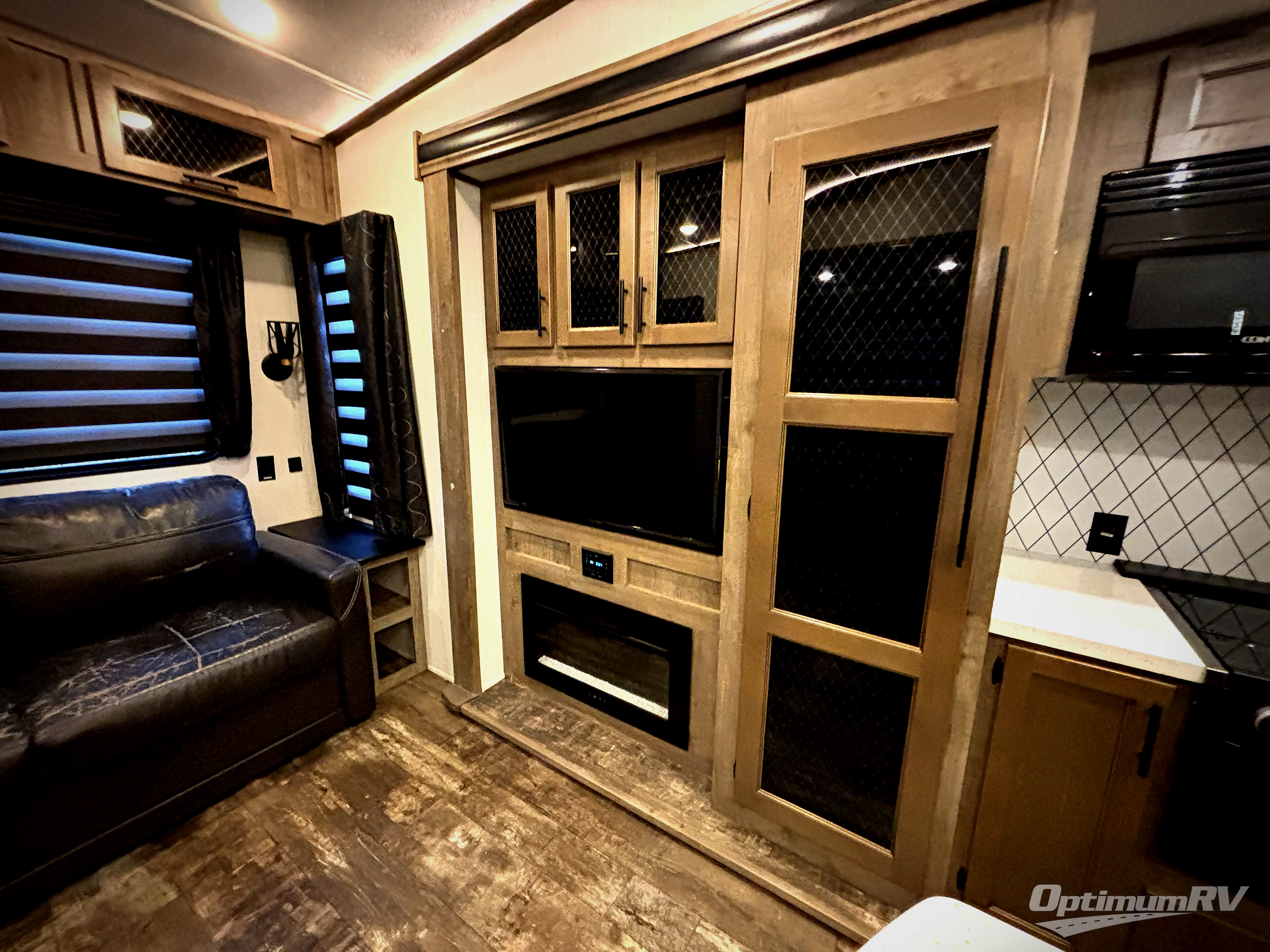 There's something for everyone in this Sabre fifth wheel! The front private bedroom includes king bed for maximum comfort and a front closet with an area prepped for the optional washer and dryer. Your guests will feel right at home in the second bedroom with a tri-fold sofa, plus a closet, dresser, and wardrobe for their clothes. There is even a loft above this room for the kids. The kitchen island not only provides extra counter and storage space, but is also makes cleaning up even easier with the farm-style sink and deluxe pull-down faucet. After you have spent a fun day in the sun, head to the rear living area and relax on either the tri-fold sofa which can be transformed into an extra sleeping space or on the theatre seating with heat and massage. As you sit back and relax, you'll find a fireplace directly across with a large residential TV above it for you to watch your favorite movie!