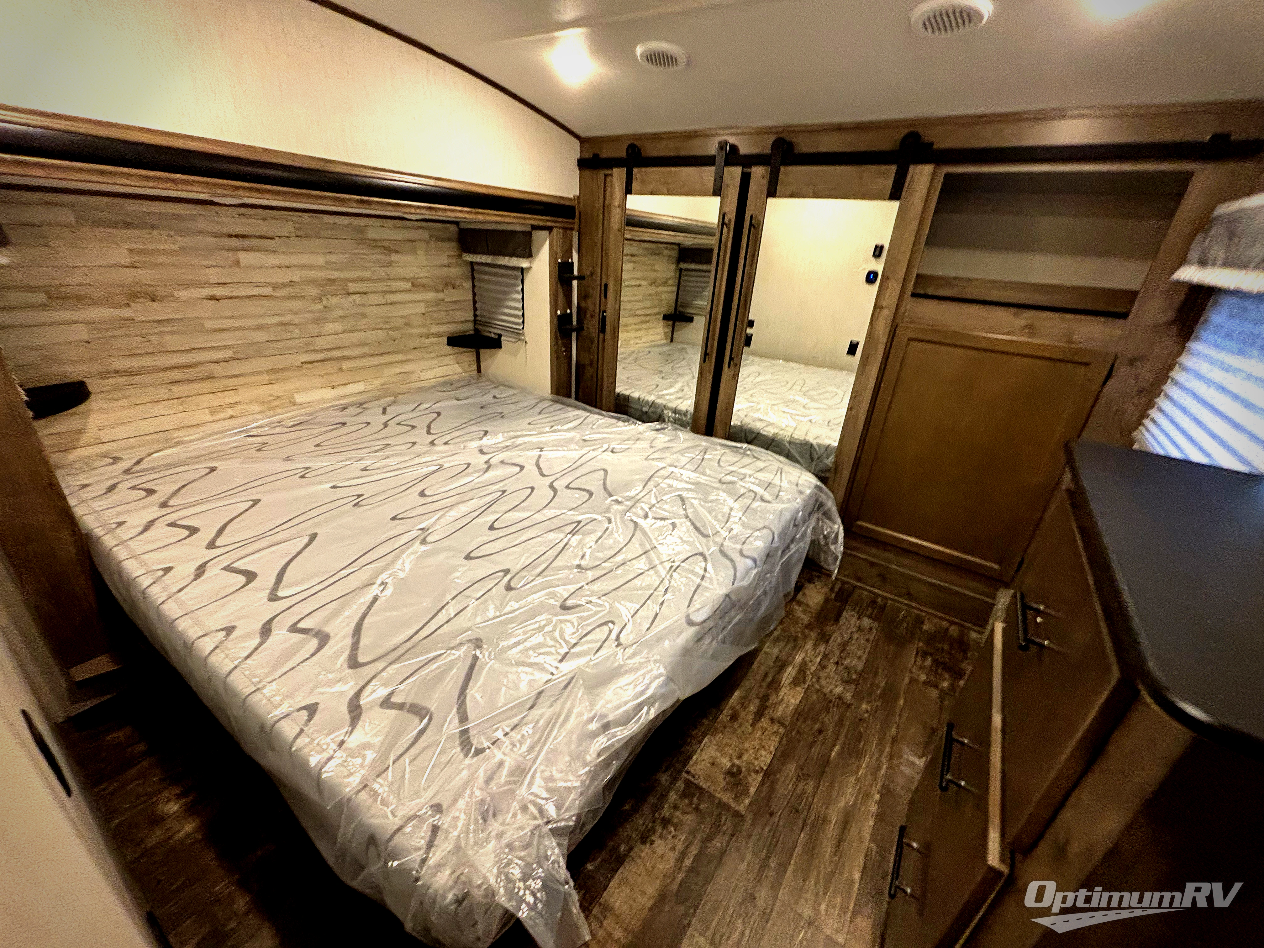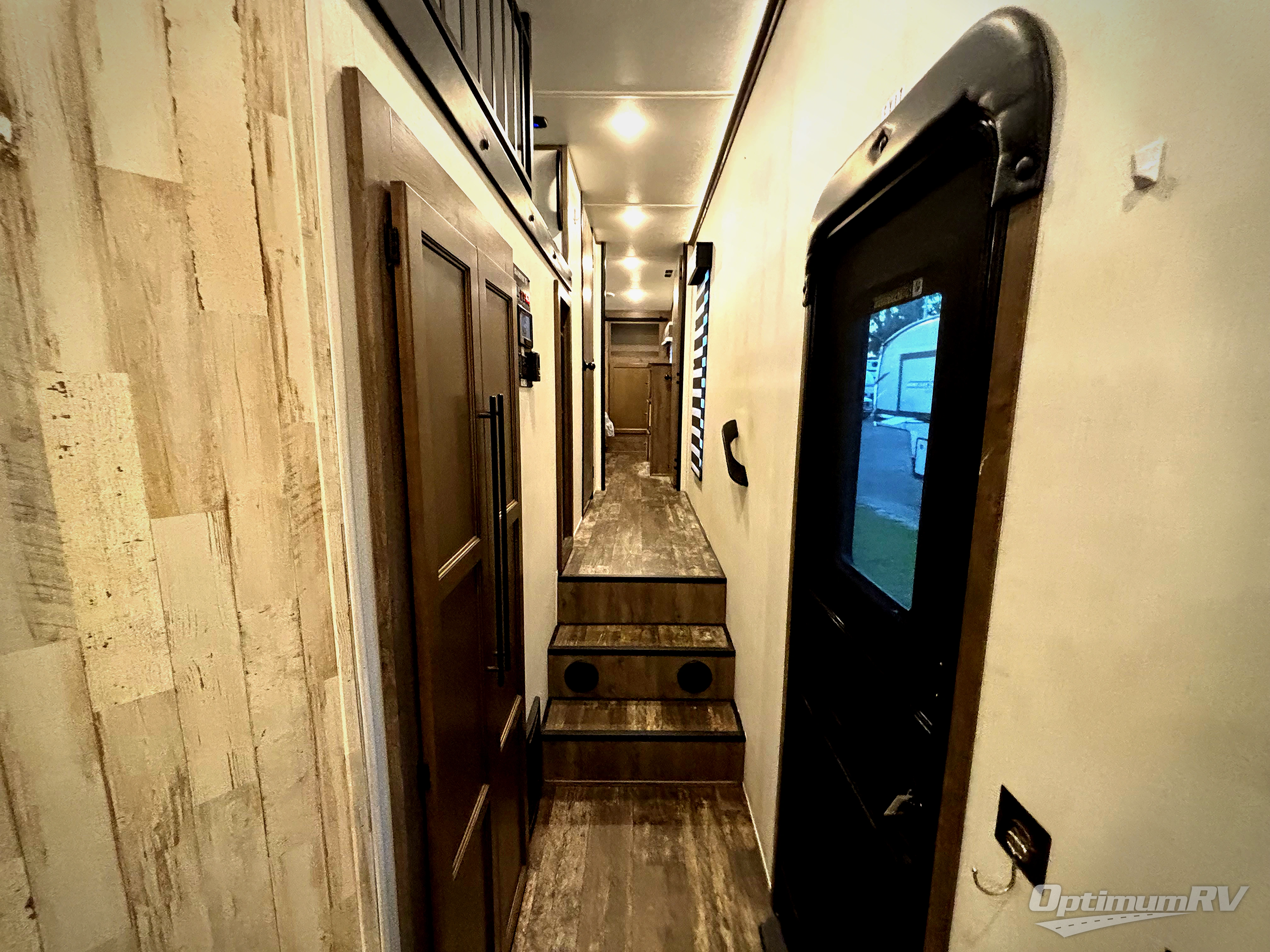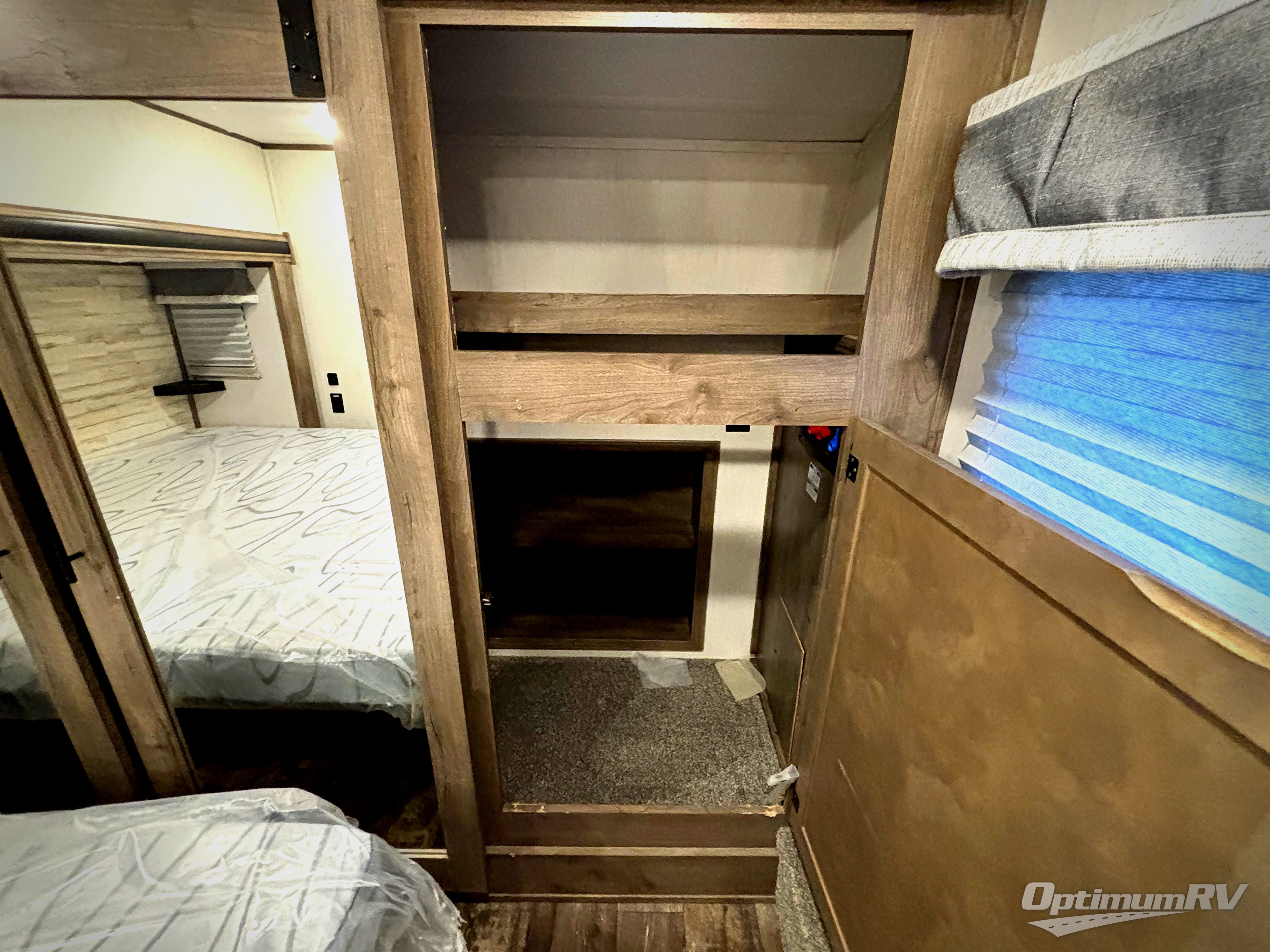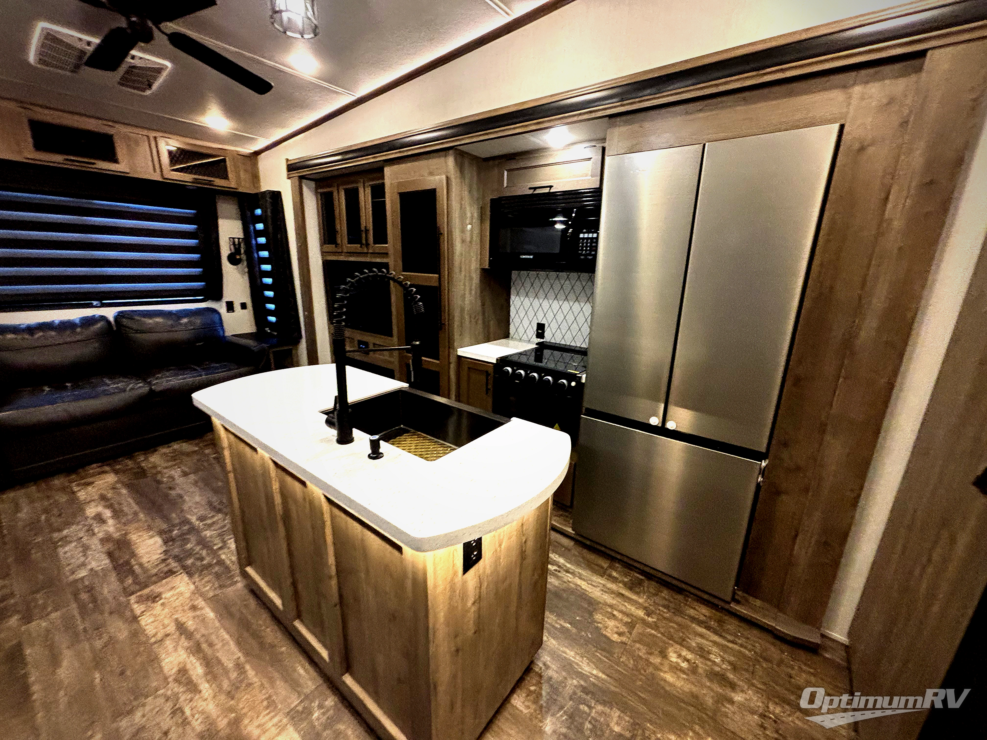 There's something for everyone in this Sabre fifth wheel! The front private bedroom includes king bed for maximum comfort and a front closet with an area prepped for the optional washer and dryer. Your guests will feel right at home in the second bedroom with a tri-fold sofa, plus a closet, dresser, and wardrobe for their clothes. There is even a loft above this room for the kids. The kitchen island not only provides extra counter and storage space, but is also makes cleaning up even easier with the farm-style sink and deluxe pull-down faucet. After you have spent a fun day in the sun, head to the rear living area and relax on either the tri-fold sofa which can be transformed into an extra sleeping space or on the theatre seating with heat and massage. As you sit back and relax, you'll find a fireplace directly across with a large residential TV above it for you to watch your favorite movie!
