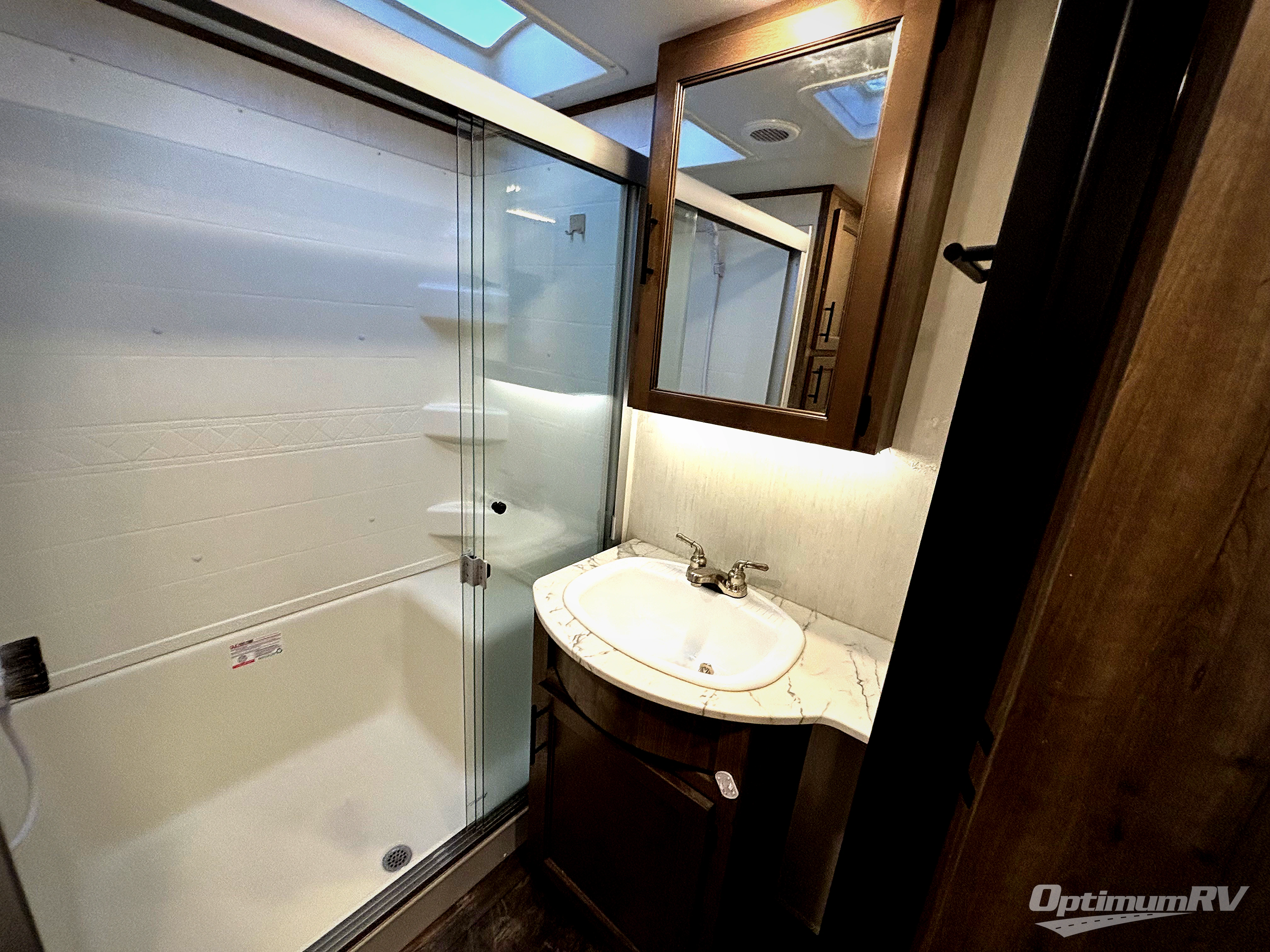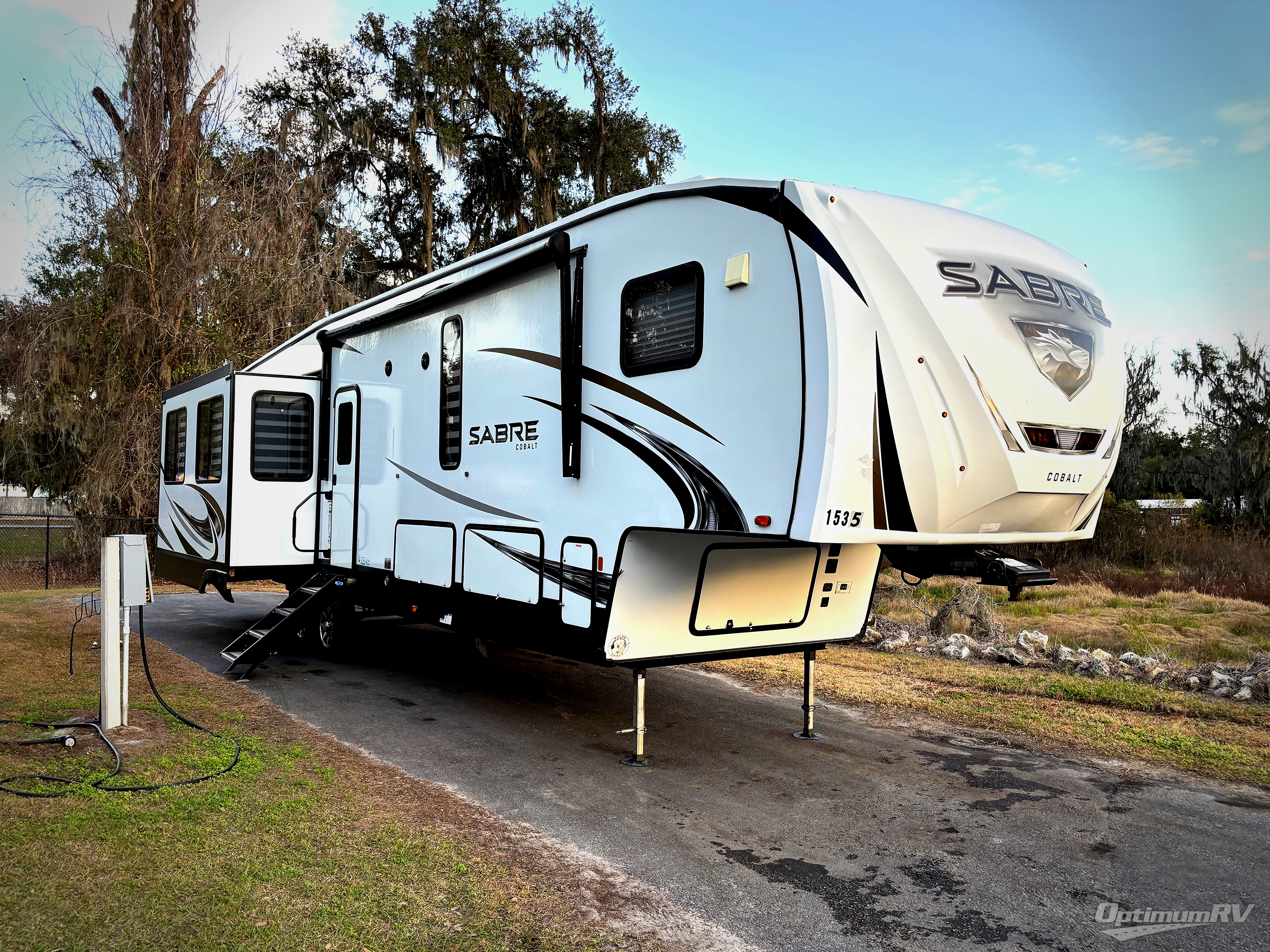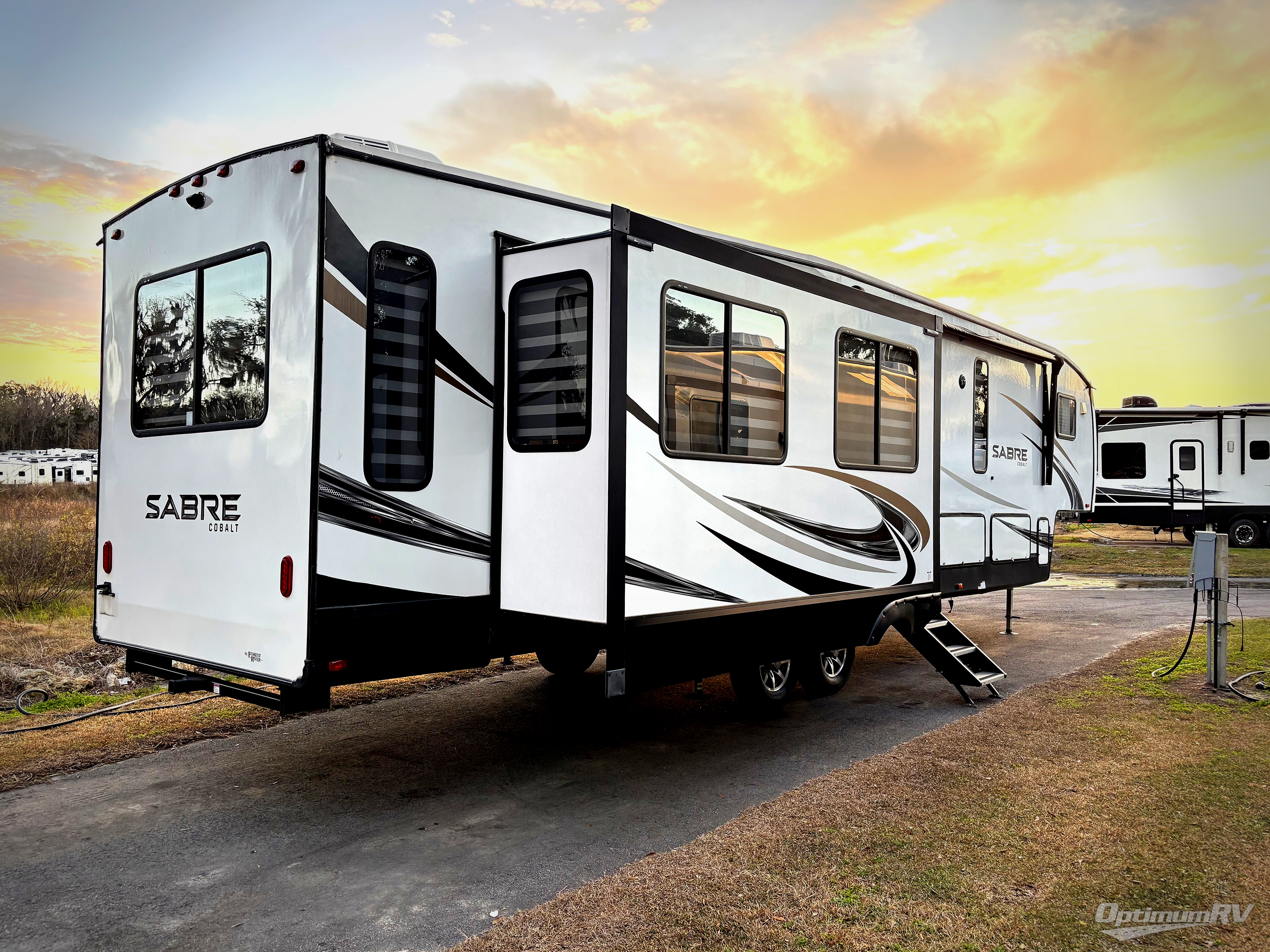 You will experience luxurious camping trips at an affordable price with any one of these Forest River Sabre fifth wheels! These models are durable and ready to travel anytime of the year thanks to features like the high-gloss gel-coat front cap with LED lighting, the PVC roof membrane, and the forced air underbelly with enclosed gate valves. The electric auto-leveling system makes setting up easy and safe, and the adjustable power awning with LED lighting will create an inviting outdoor living space. Each model includes a universal docking station which includes a black tank flush and an outside shower, and the backlit "Secure Step" landing for you to enter and exit the unit safely. Inside, you will love the design of the ambient accent lighting above the crown molding in the living area, the real wood lumbercore cabinetry, and the vintage gaslight decorative lighting!