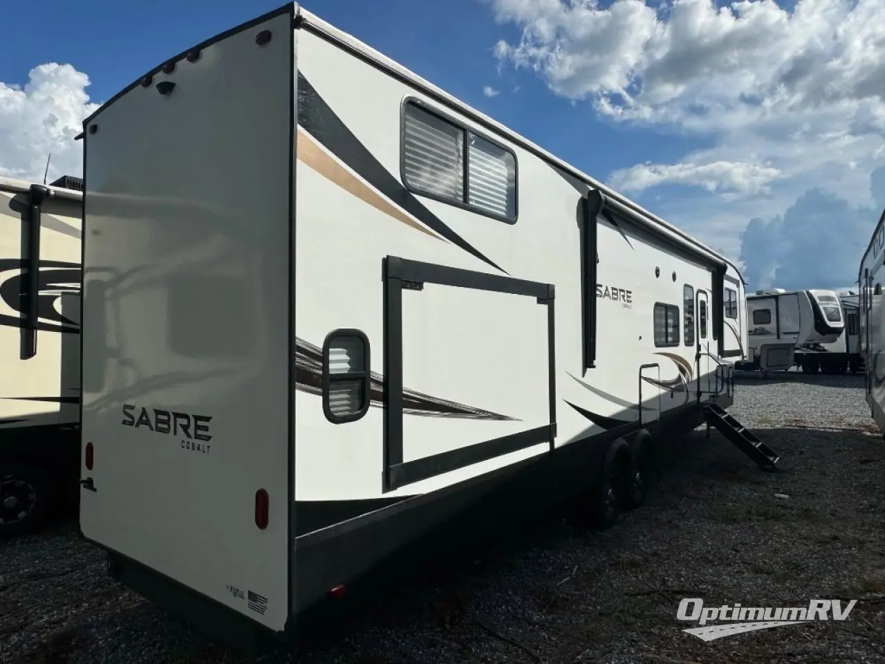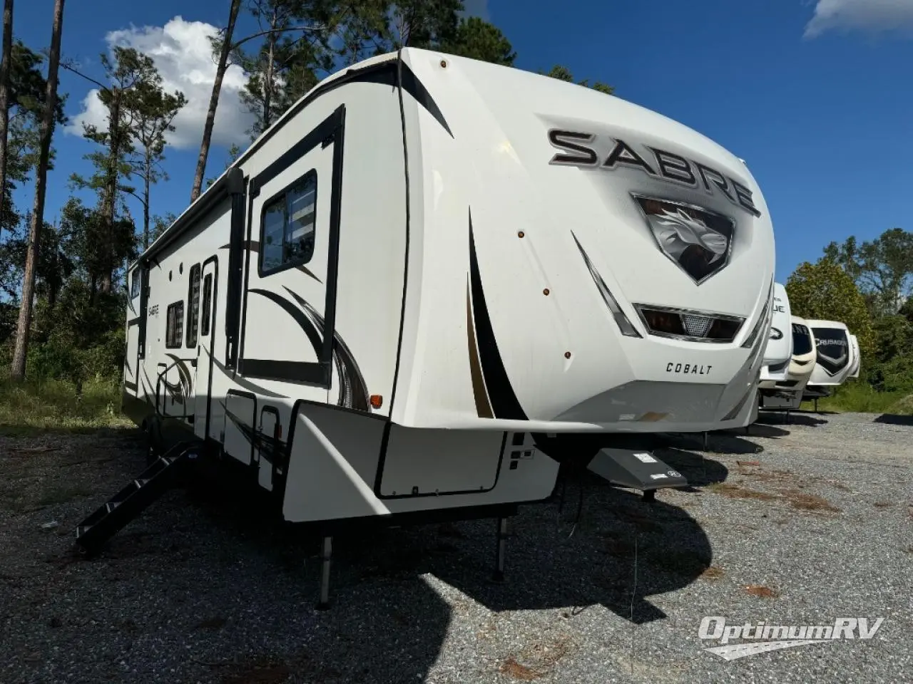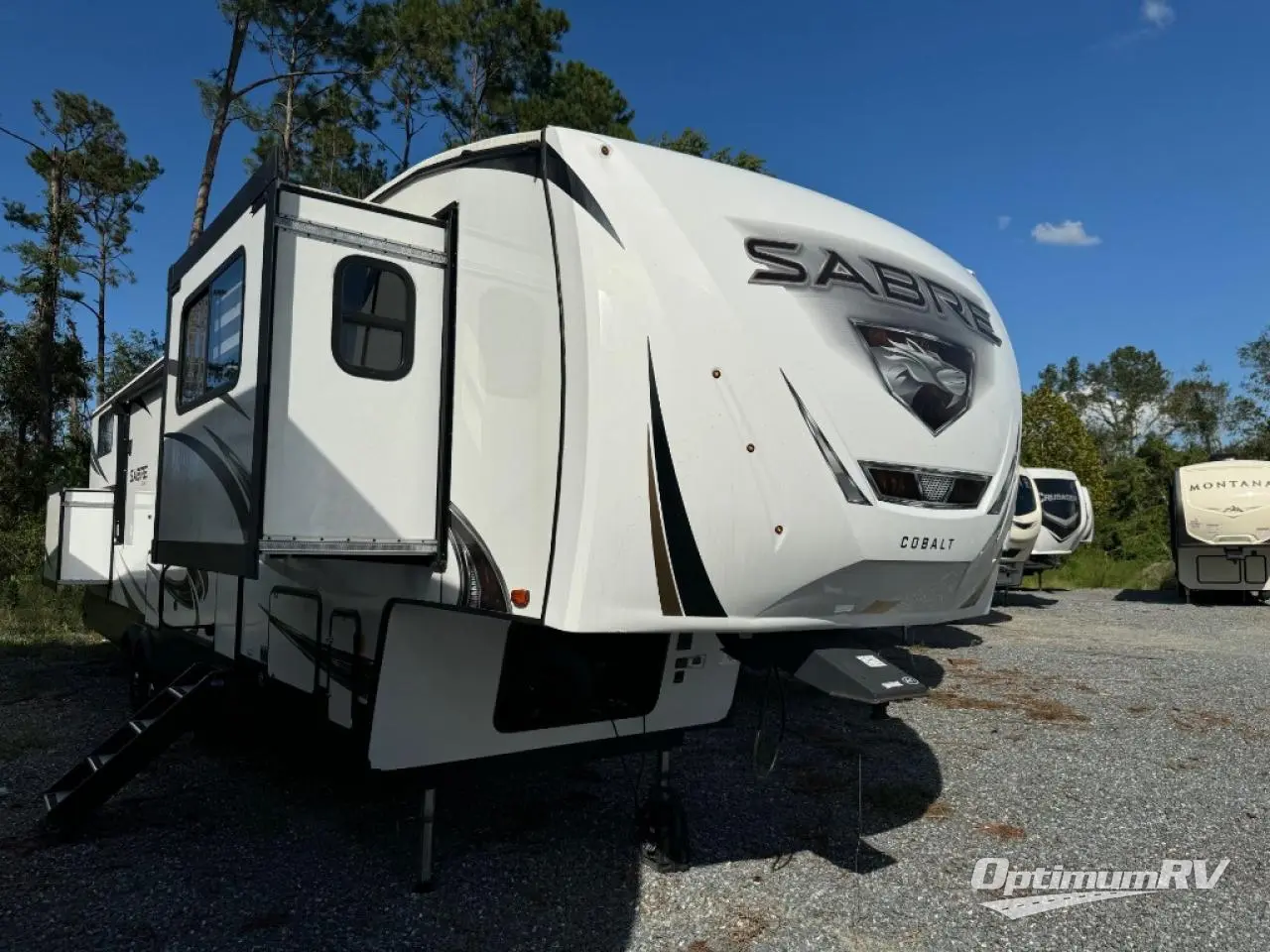 You will experience luxurious camping trips at an affordable price with any one of these Forest River Sabre fifth wheels! These models are durable and ready to travel anytime of the year thanks to features like the high-gloss gel-coat front cap with LED lighting, the PVC roof membrane, and the forced air underbelly with enclosed gate valves. The electric auto-leveling system makes setting up easy and safe, and the adjustable power awning with LED lighting will create an inviting outdoor living space. Each model includes a universal docking station which includes a black tank flush and an outside shower, and the backlit "Secure Step" landing for you to enter and exit the unit safely. Inside, you will love the design of the ambient accent lighting above the crown molding in the living area, the real wood lumbercore cabinetry, and the vintage gaslight decorative lighting!