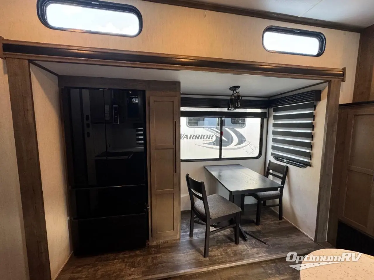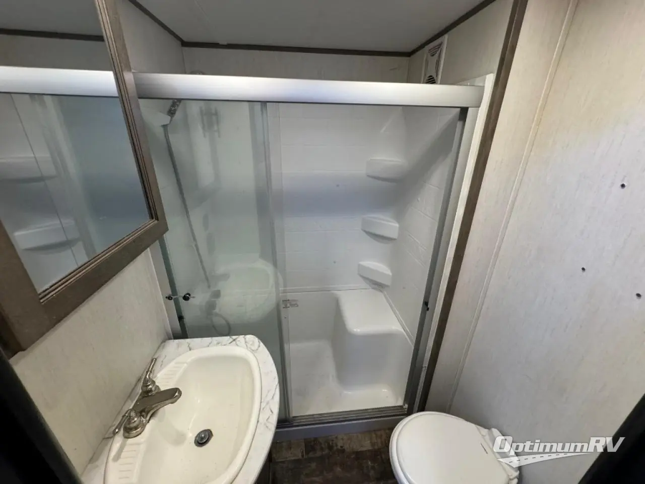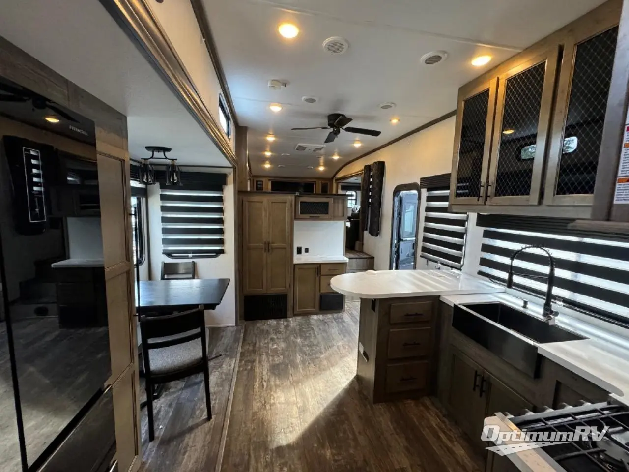There is only one word that can describe this Sabre fifth wheel: fabulous! You will be amazed by the amount of comfortable convenience that is scattered all throughout this model for you and your family or friends. From the tri-fold sofa slides, the theater seats, the fireplace and entertainment center in the front living room to the rear bedroom with its queen bed and wardrobe slide out, you will always have a place to relax and unwind. Not only that, but there is also a large loft area up above the bedroom and bath which has sleeping space, storage, a wardrobe, and railing. The cook will enjoy the 12V refrigerator with French doors and pantry for all of your food storage needs, and the free-standing table with chairs is the perfect place to sit down and enjoy a delicious meal or play board games.