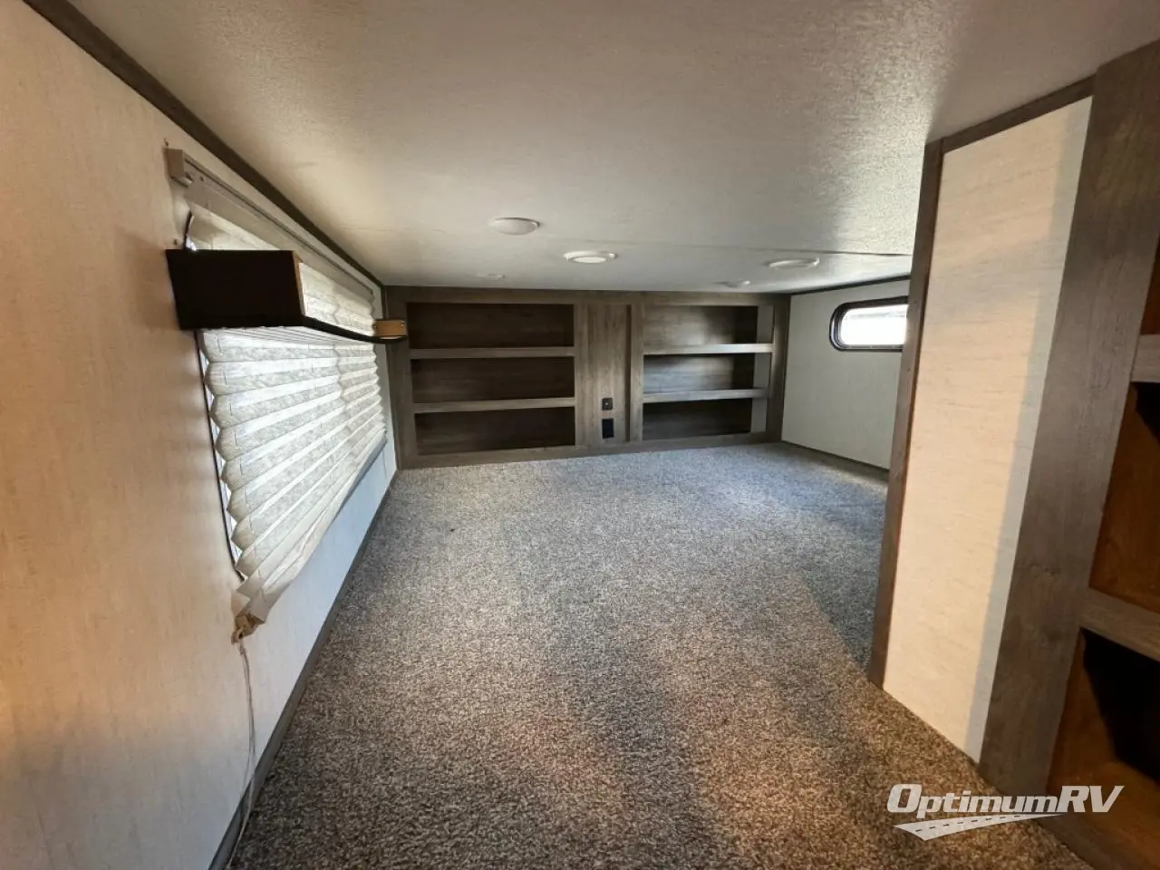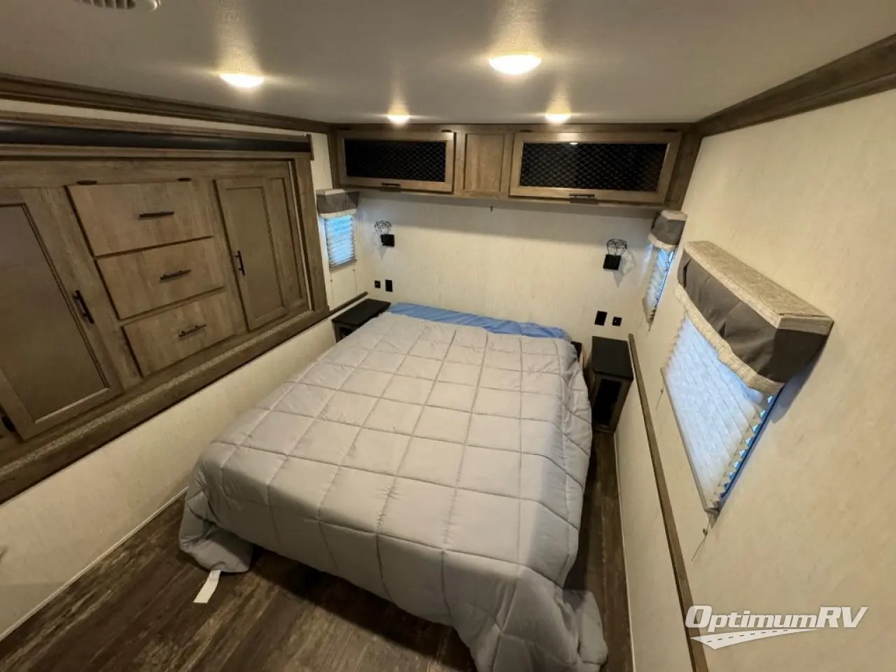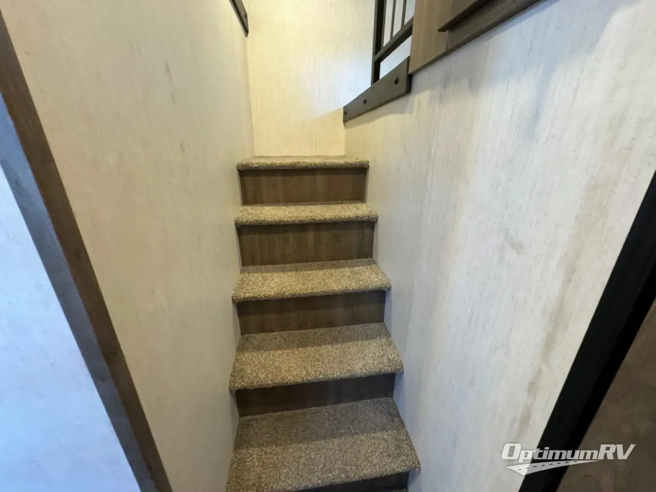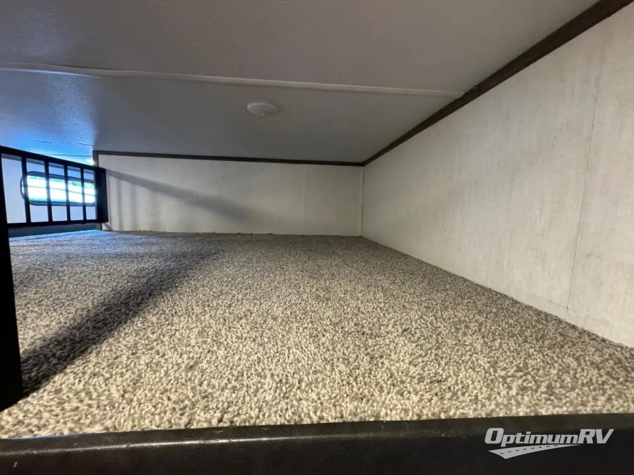 There is only one word that can describe this Sabre fifth wheel: fabulous! You will be amazed by the amount of comfortable convenience that is scattered all throughout this model for you and your family or friends. From the tri-fold sofa slides, the theater seats, the fireplace and entertainment center in the front living room to the rear bedroom with its queen bed and wardrobe slide out, you will always have a place to relax and unwind. Not only that, but there is also a large loft area up above the bedroom and bath which has sleeping space, storage, a wardrobe, and railing. The cook will enjoy the 12V refrigerator with French doors and pantry for all of your food storage needs, and the free-standing table with chairs is the perfect place to sit down and enjoy a delicious meal or play board games.