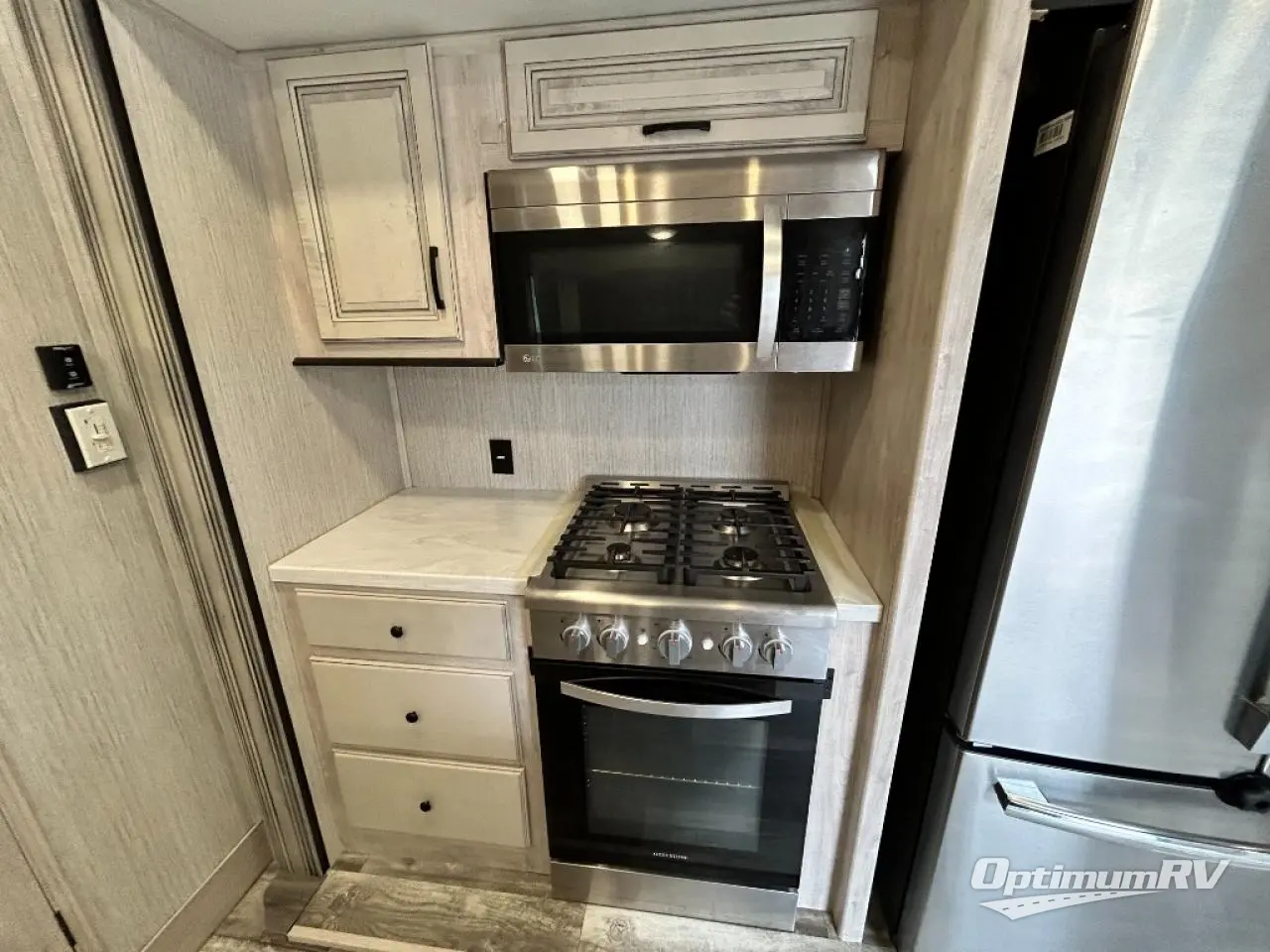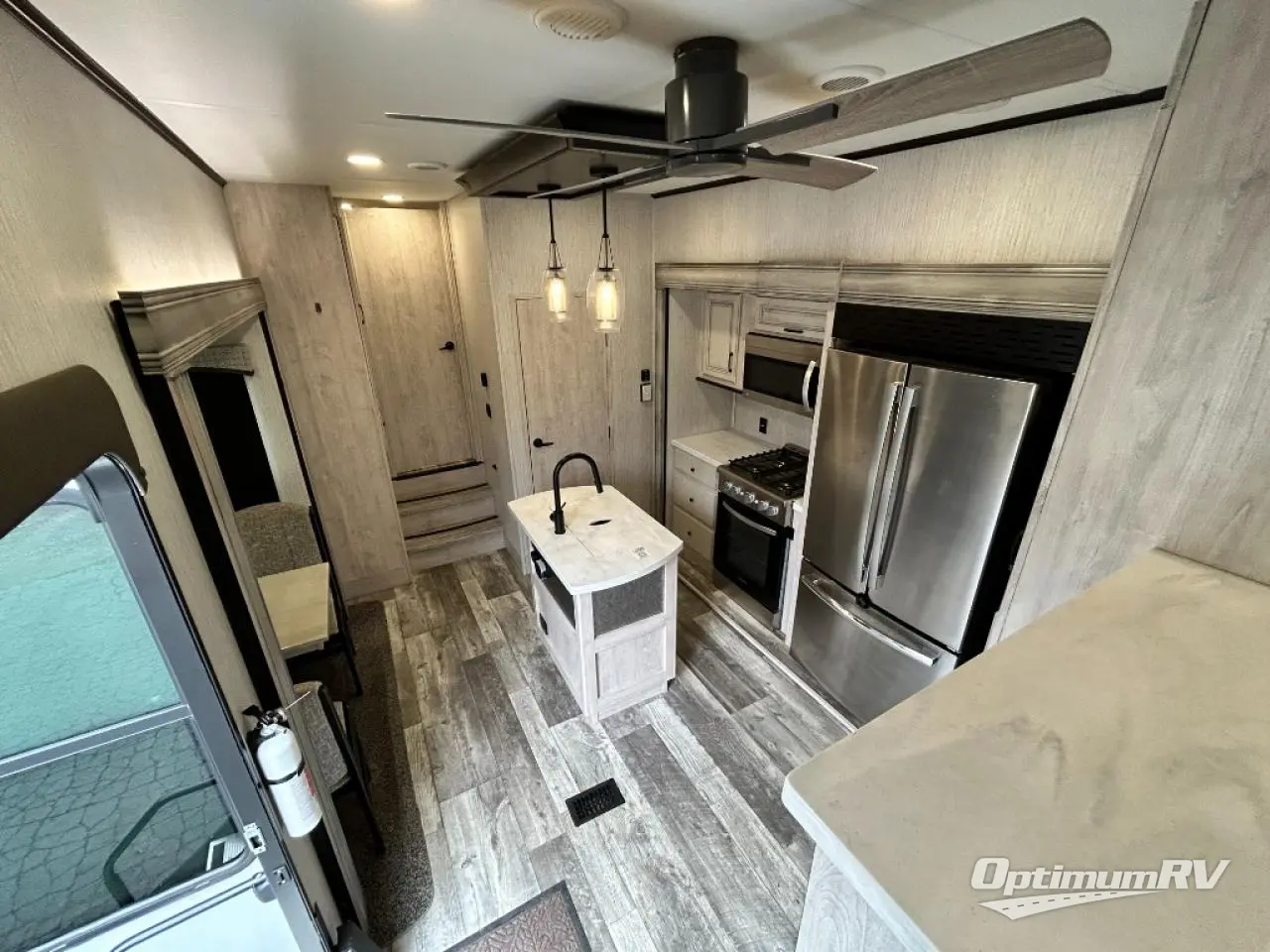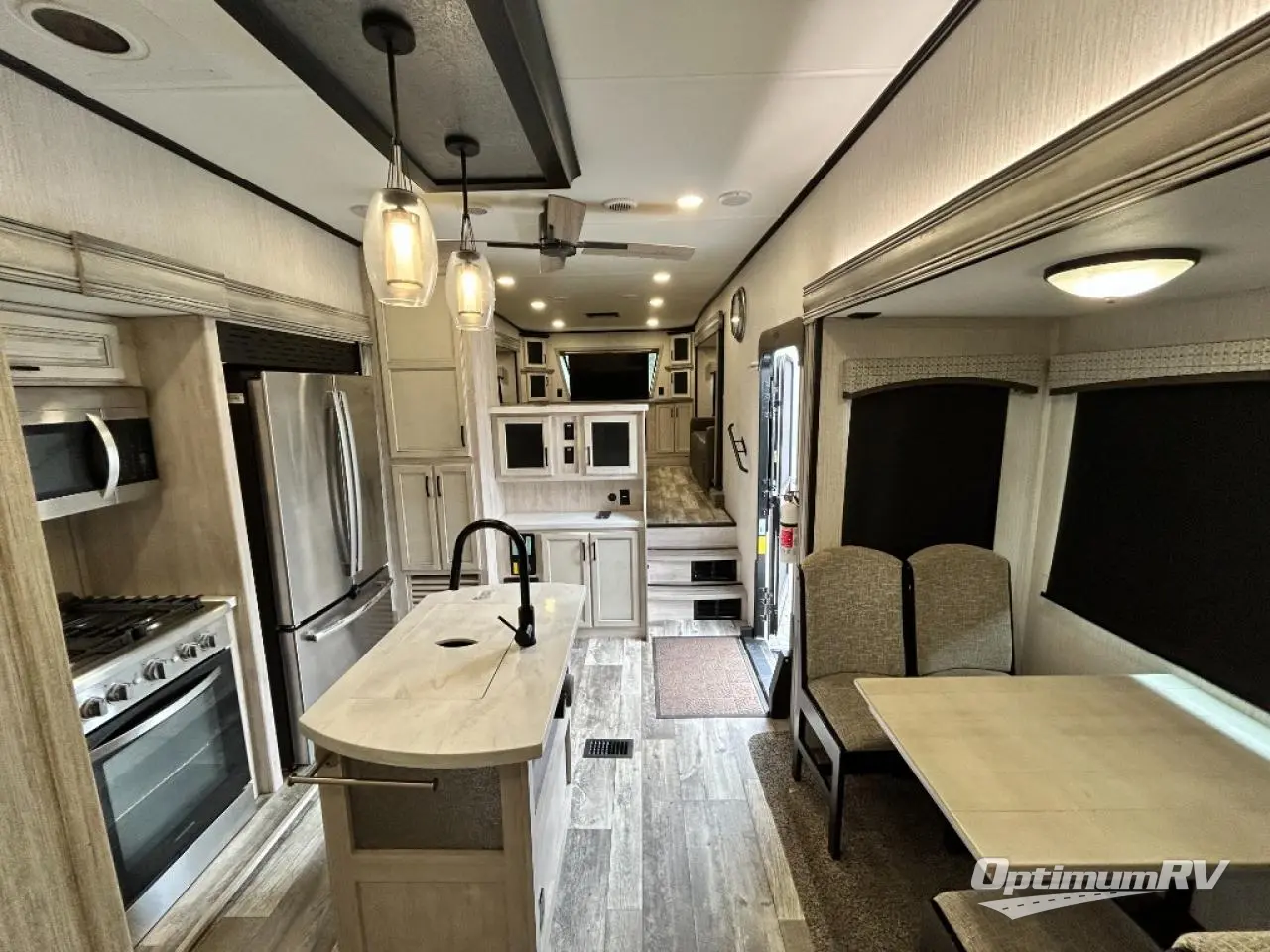 No vacation plan is complete without this Sandpiper Luxury fifth wheel! The master suite is the star of the show with its king bed slide and full bathroom with dual-sink vanity. There is another aspect of this unit that will also grab your attention, and that is the front separate living room. This room features a front entertainment center with fireplace and 50" flat screen LED HDTV, two opposing tri-fold hide-a-bed sofas, and theater seating. All of this makes the living room a perfect place to sit down with friends, and the sofas allow you to offer your friends a sleeping space if they choose to spend the night. The kitchen is centrally located, and it contains the half bathroom. As you work up a sweat cooking dinner on the four-burner range, you'll be able to switch on the ceiling fan to cool down, and you'll be able to store practically anything in the 22-cubic foot residential refrigerator.