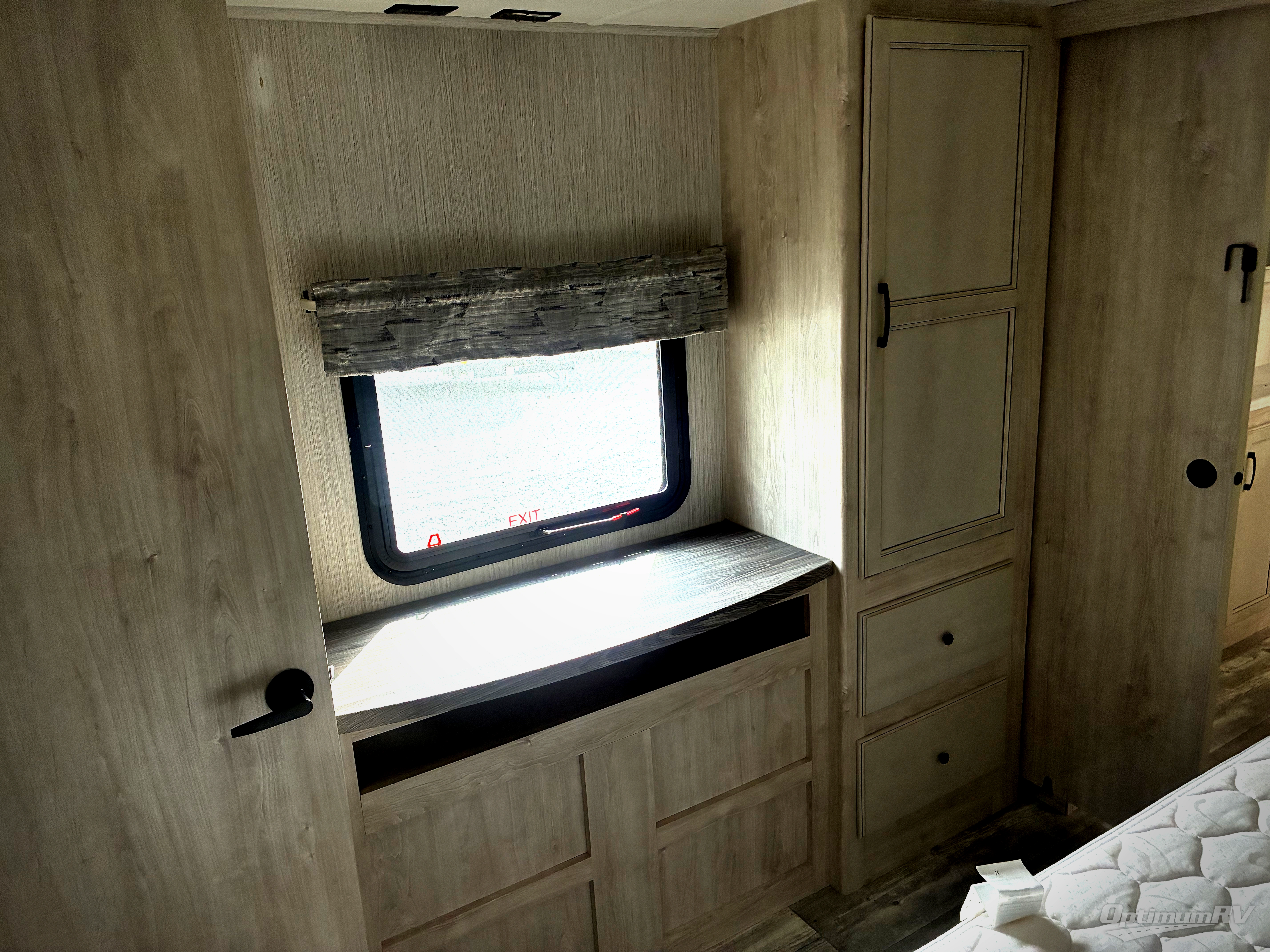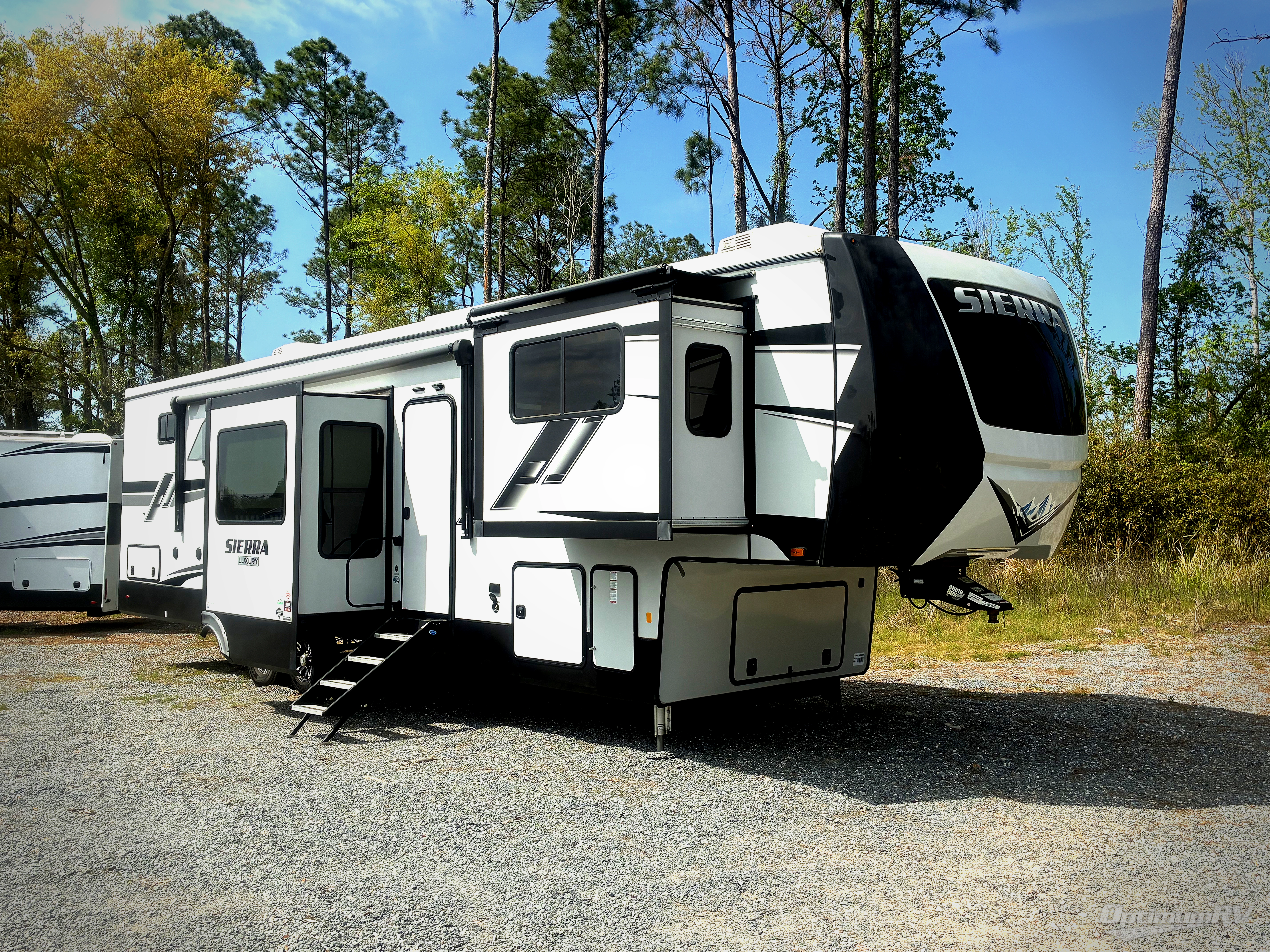 Are you looking to add a little glamour to your camping life? The Forest River Sierra Luxury fifth wheels are luxury units that bring all the fun. These models have an Underbelly Armor, a friction-hinge entry door, an exterior docking station, a high-gloss gel-coat fiberglass exterior, a six-point hydraulic leveling system, and high-efficiency radiant foil for the roof and floor. The interior is stylish and modern with its stainless steel appliances, decorative backsplash, rustic wood plank linoleum, handmade cabinetry, crown molding over the kitchen cabinets, and recessed residential lighting. There is a satellite and cable hookup as well as a King Wi-Fi extender system, and the premium sound bar with built-in flush-mounted DVD player will be great to have when you want to watch a movie.