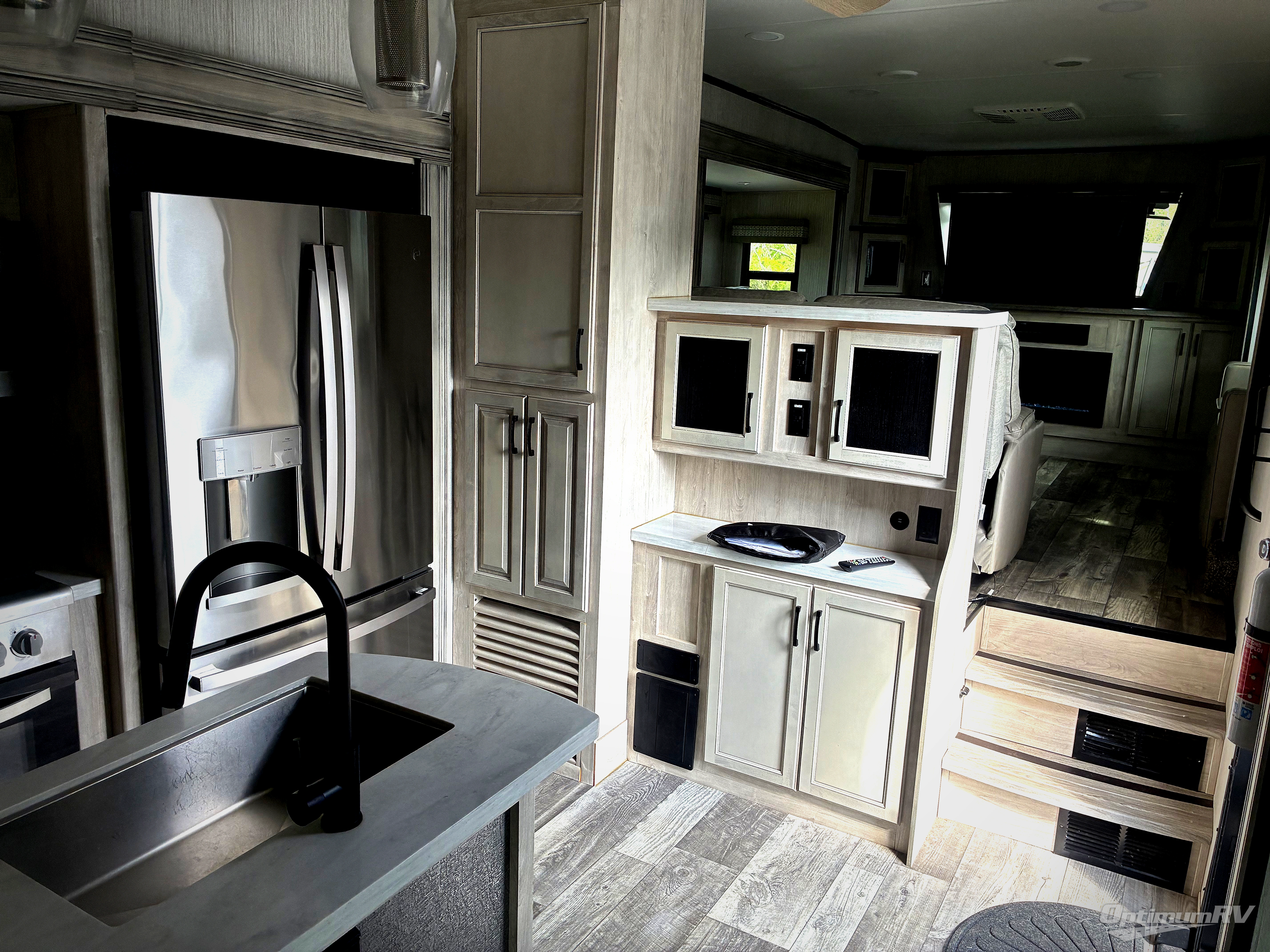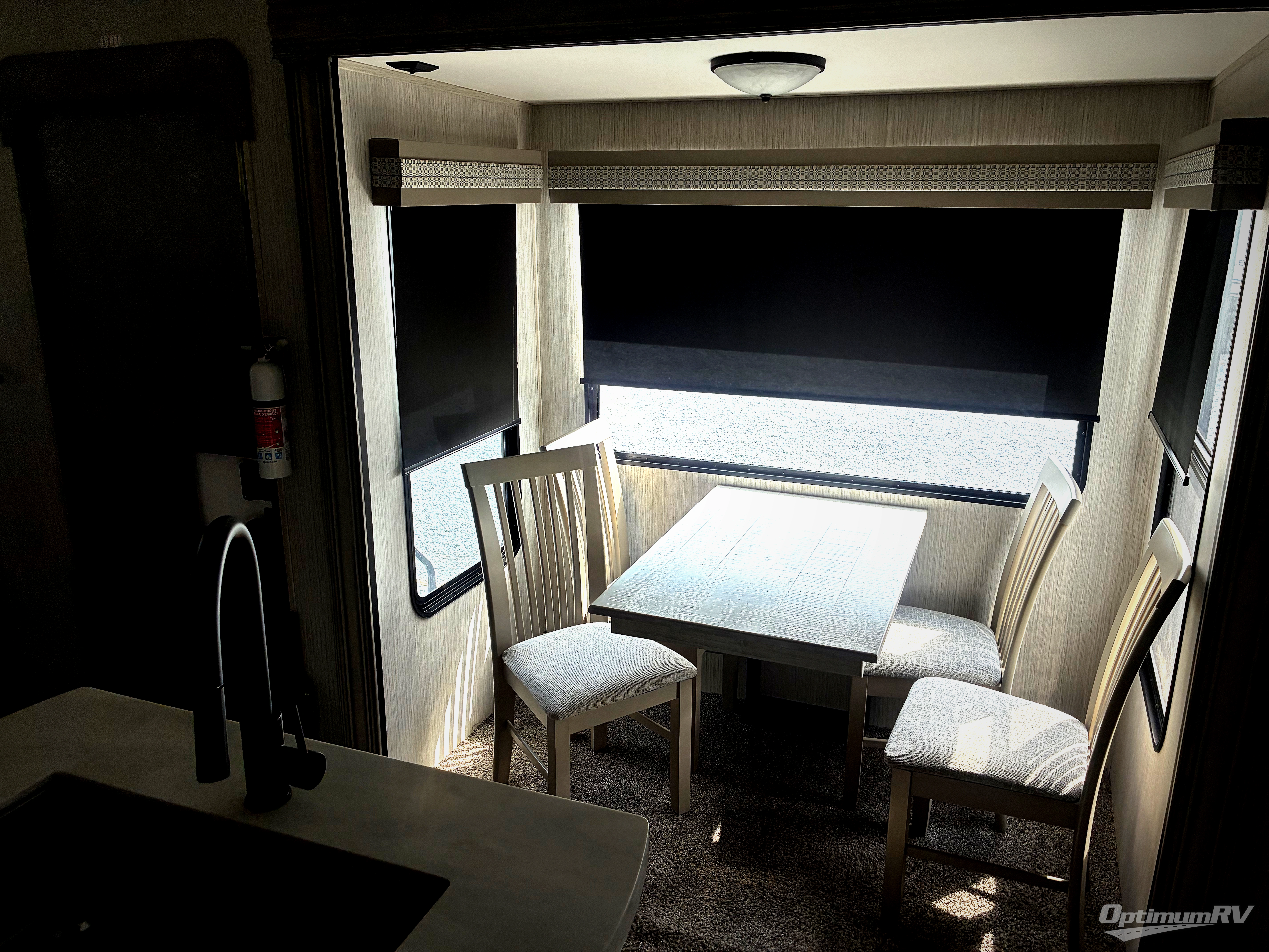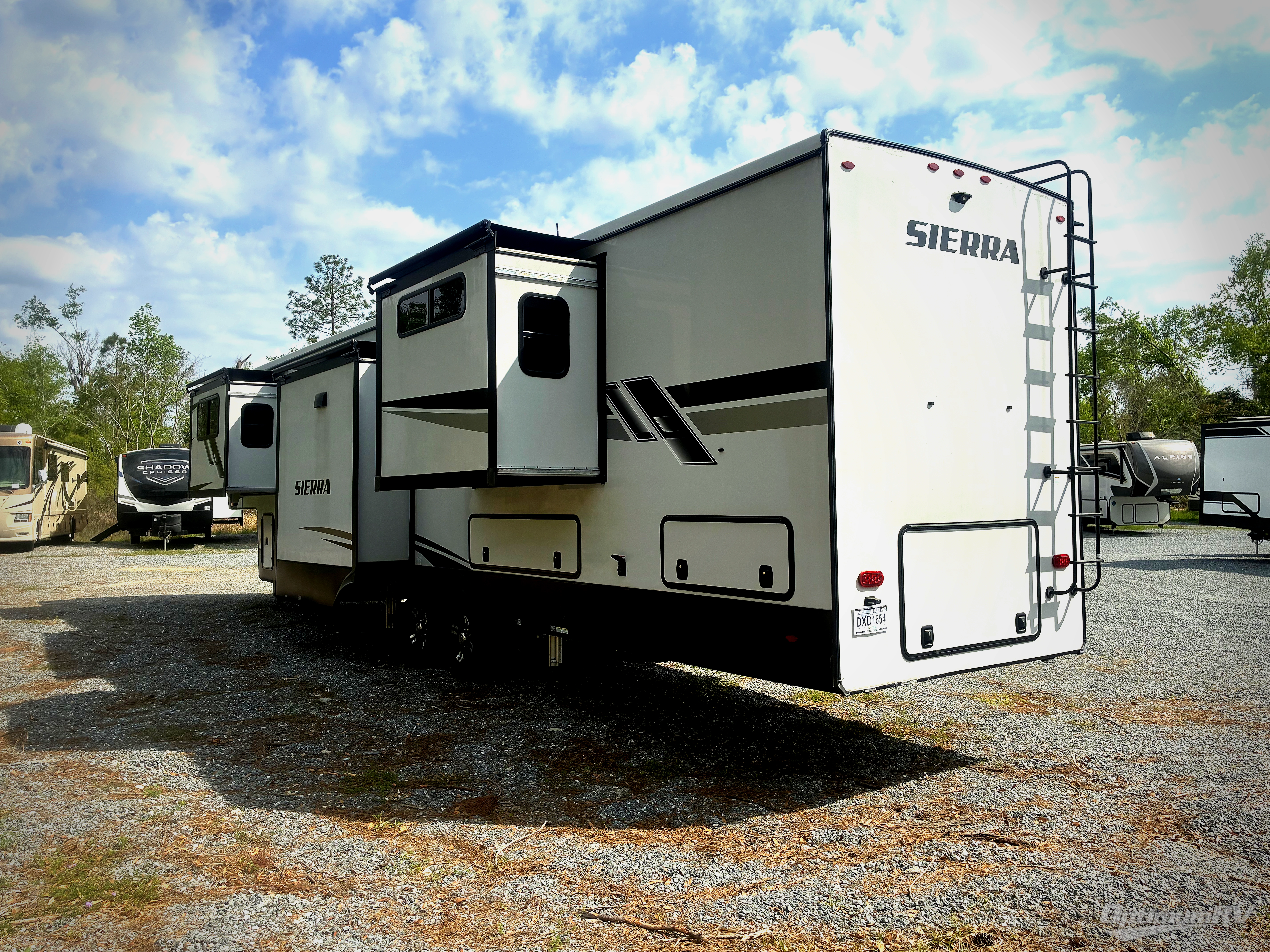 The best adventures will be had in this Sierra Luxury fifth wheel! The rear master suite is excellent because it has its own full bathroom with a dual-sink vanity, and the other half bathroom is located just off the kitchen so that everyone else can use it to freshen up. Above the kitchen is a ceiling fan which will be handy to use when you start working up a sweat while preparing dinner. The free-standing table with chairs is located here too so that you don't have to travel far to enjoy that freshly prepared meal. Head up to the front after dinner to lounge on the theater seating or one of the two tri-fold hide-a-bed sofas. You'll also be able to switch on the fireplace for a more cozy effect.