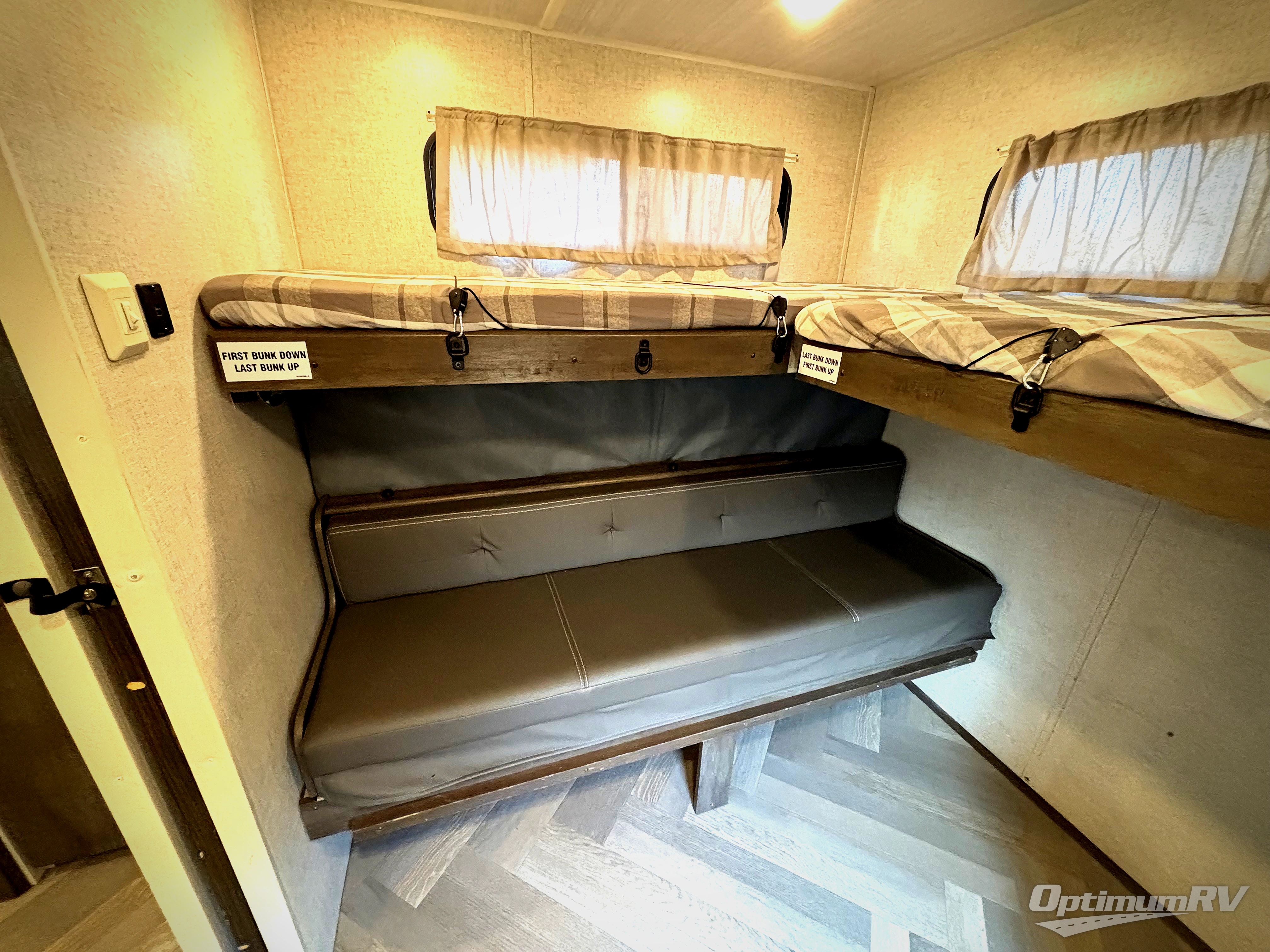 When you're ready to upgrade your RV to a unit with more sleeping space and comfort, choose this Wildwood travel trailer, and you'll never look back. After setting up camp, put out the large slide and prepare lunch indoors or outside at the exterior camp kitchen, and the 18' power awning will shade you from the sun. The kids will find all their snacks in the walk-in pantry, and they can grab a cold drink from the 11-cubic foot refrigerator. The U-shaped dinette is a part of the Versa Lounge, and it will provide comfortable seating space. This model features a rear private bunkhouse with a Versa queen bed and two Versa bunks, and you will love the front private bedroom that includes dual bedside closets.