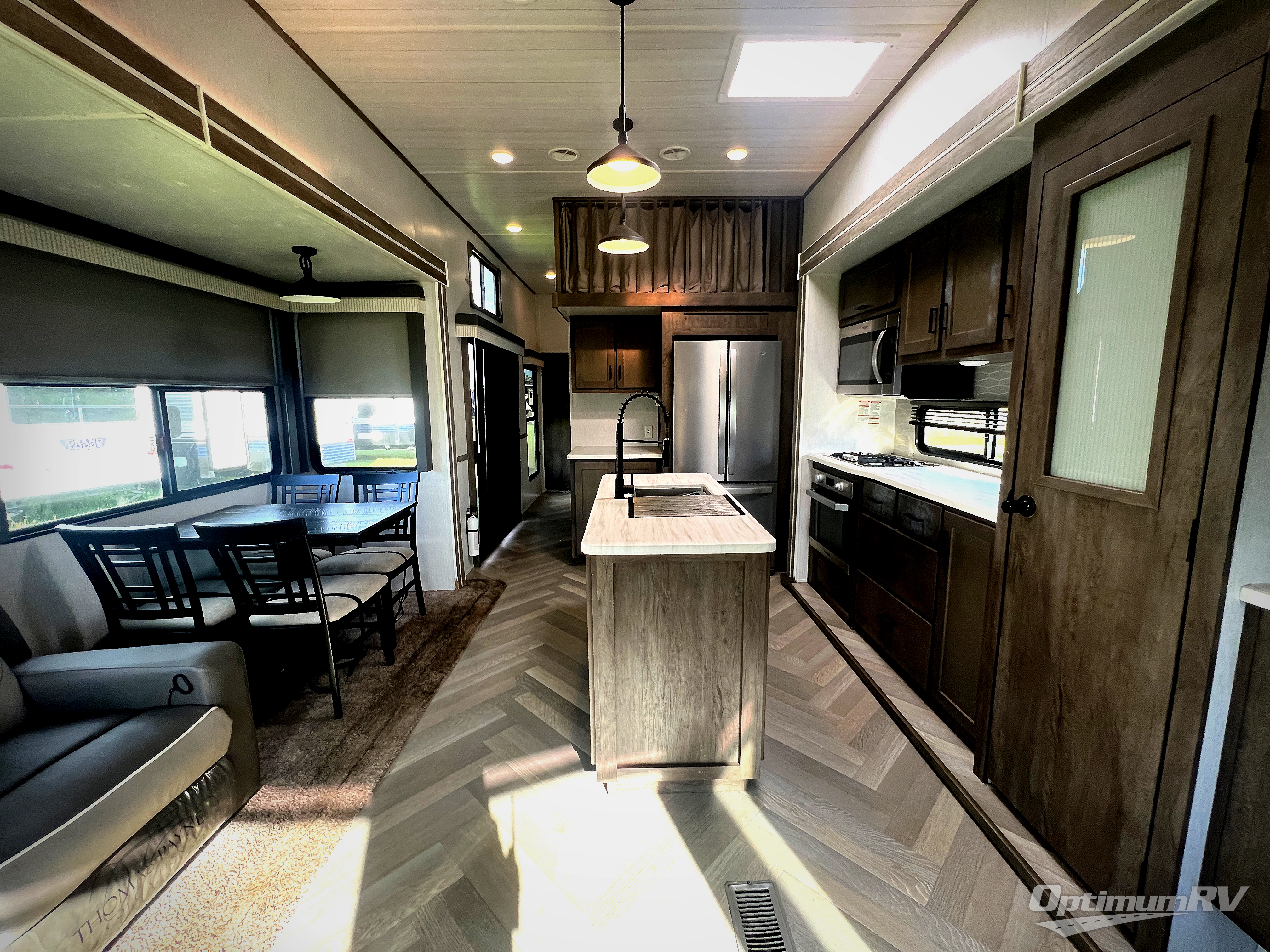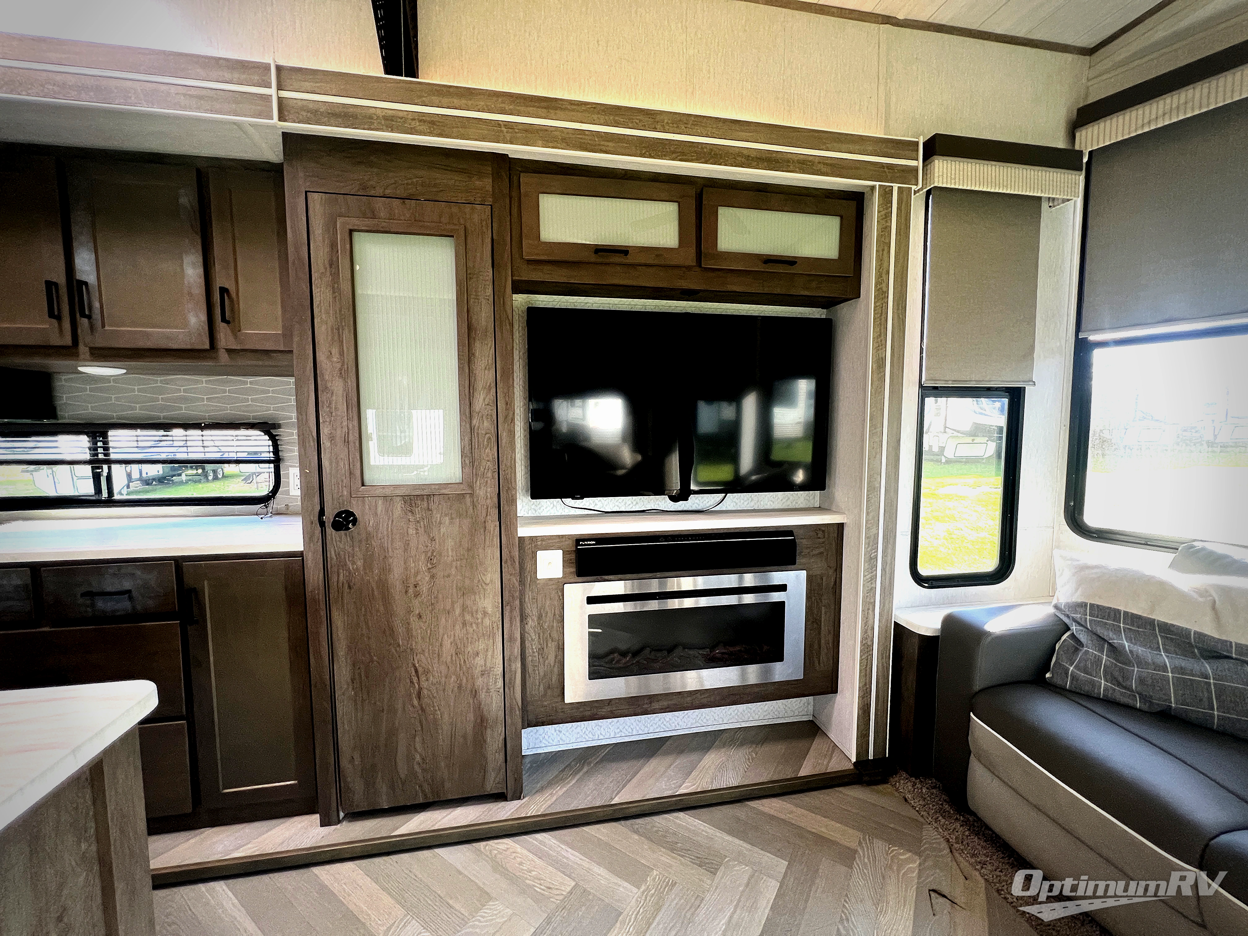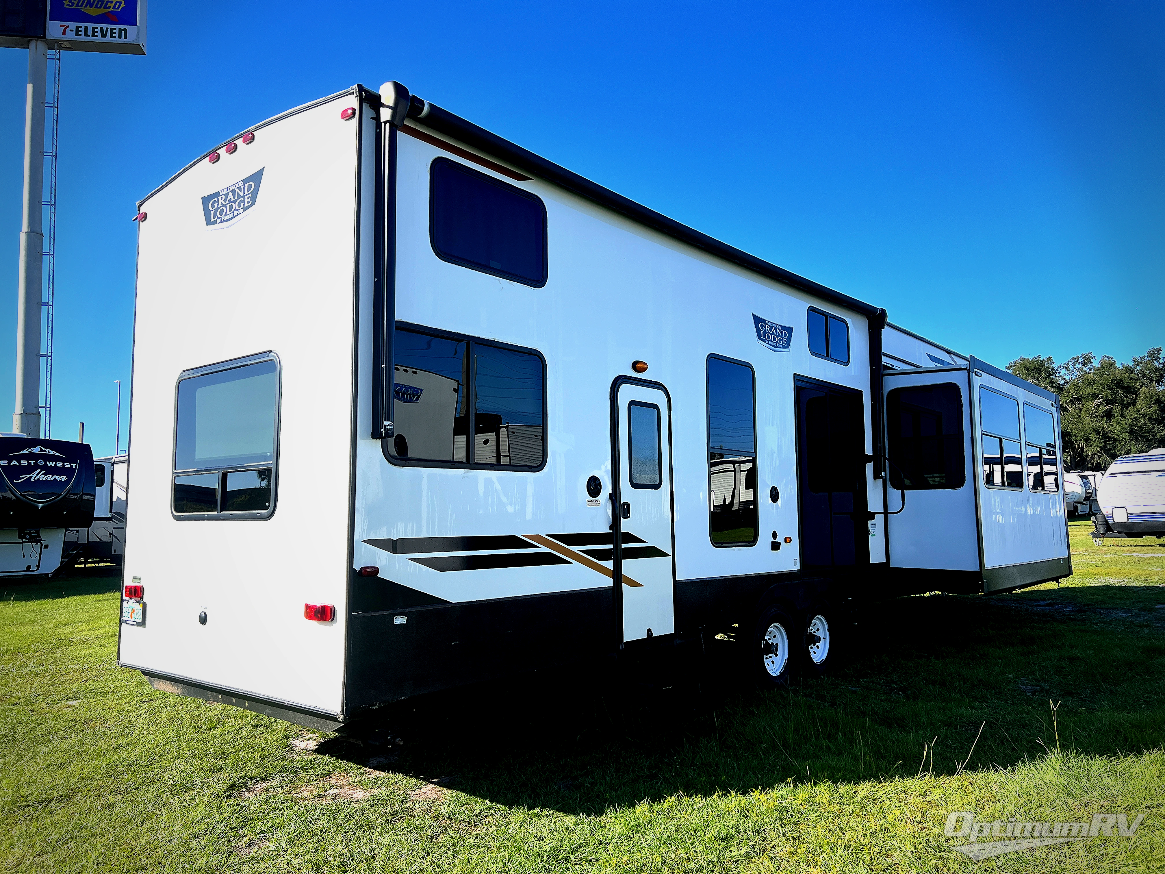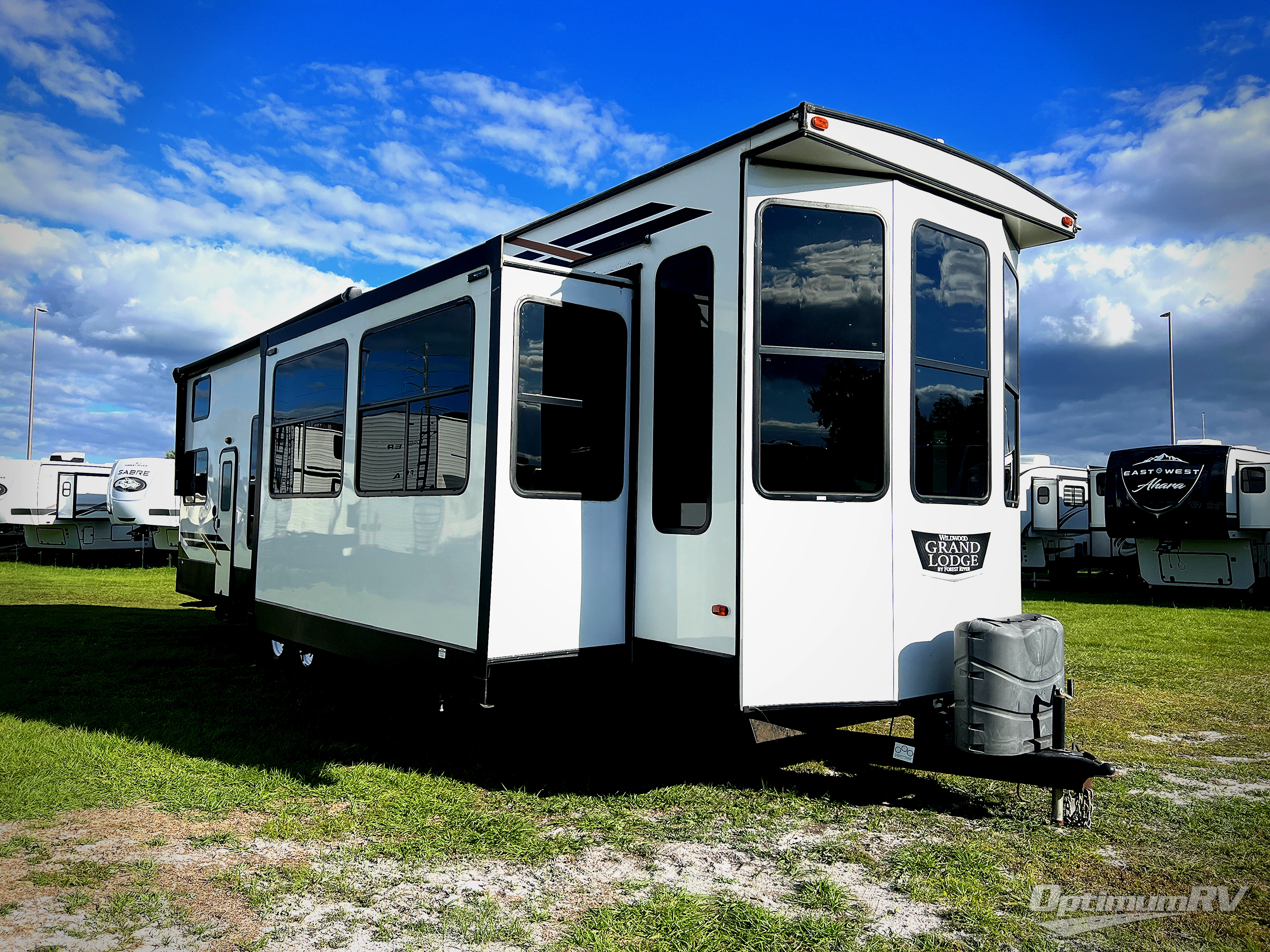 If you just need to get away from the busyness of life and need a little piece of home to escape to, the Forest River Wildwood Grand Lodge destination trailer is your ticket to paradise! The quality construction includes a 12" forged l-beam frame, 5-ply tongue and groove plywood floor decking, bowed truss roof rafters, plus more allowing you to own your trailer for many years to come! The interior is extremely beautiful and spacious with its 96" ceiling, upgraded designer furniture, stainless steel kitchen appliances, and a residential-inspired floating fireplace. The Bluetooth sound bar with a remote will provide endless nights of soothing music, and the ceiling fan in the living room is a residential touch that comes in handy when you don't want to blast the air conditioning to stay cool.