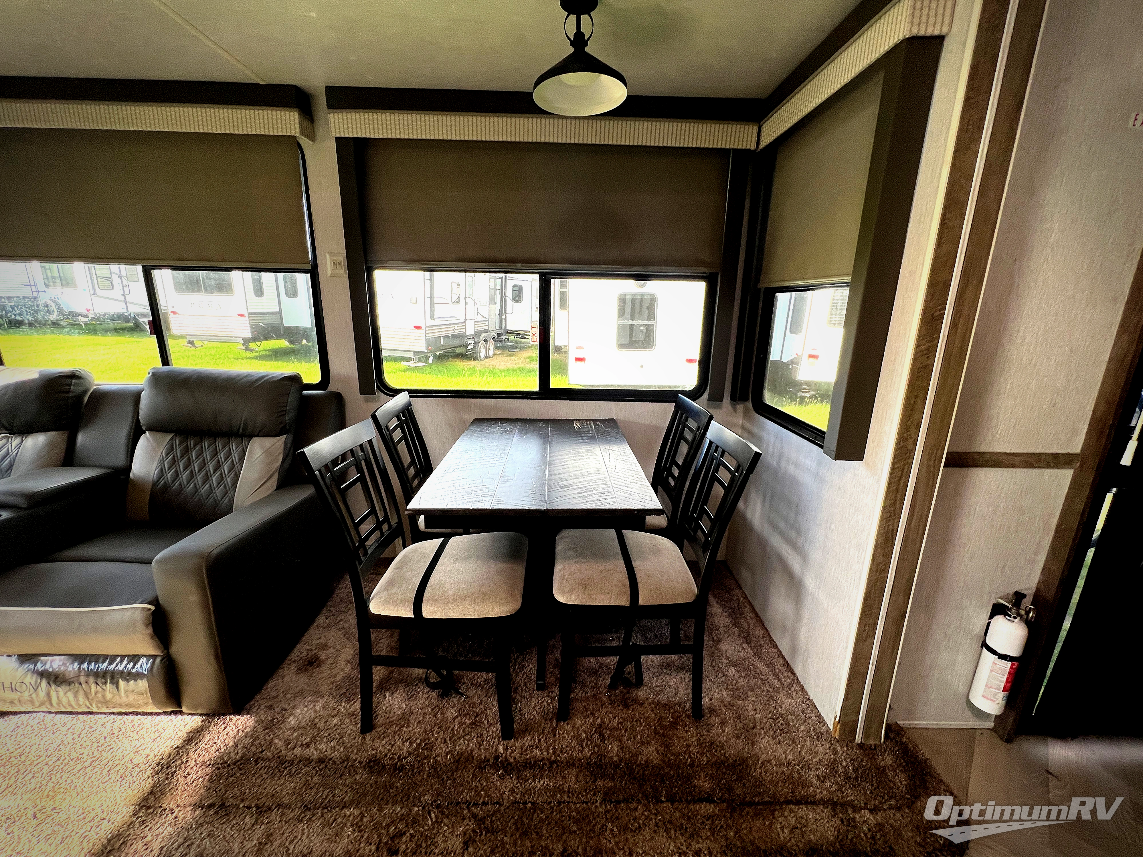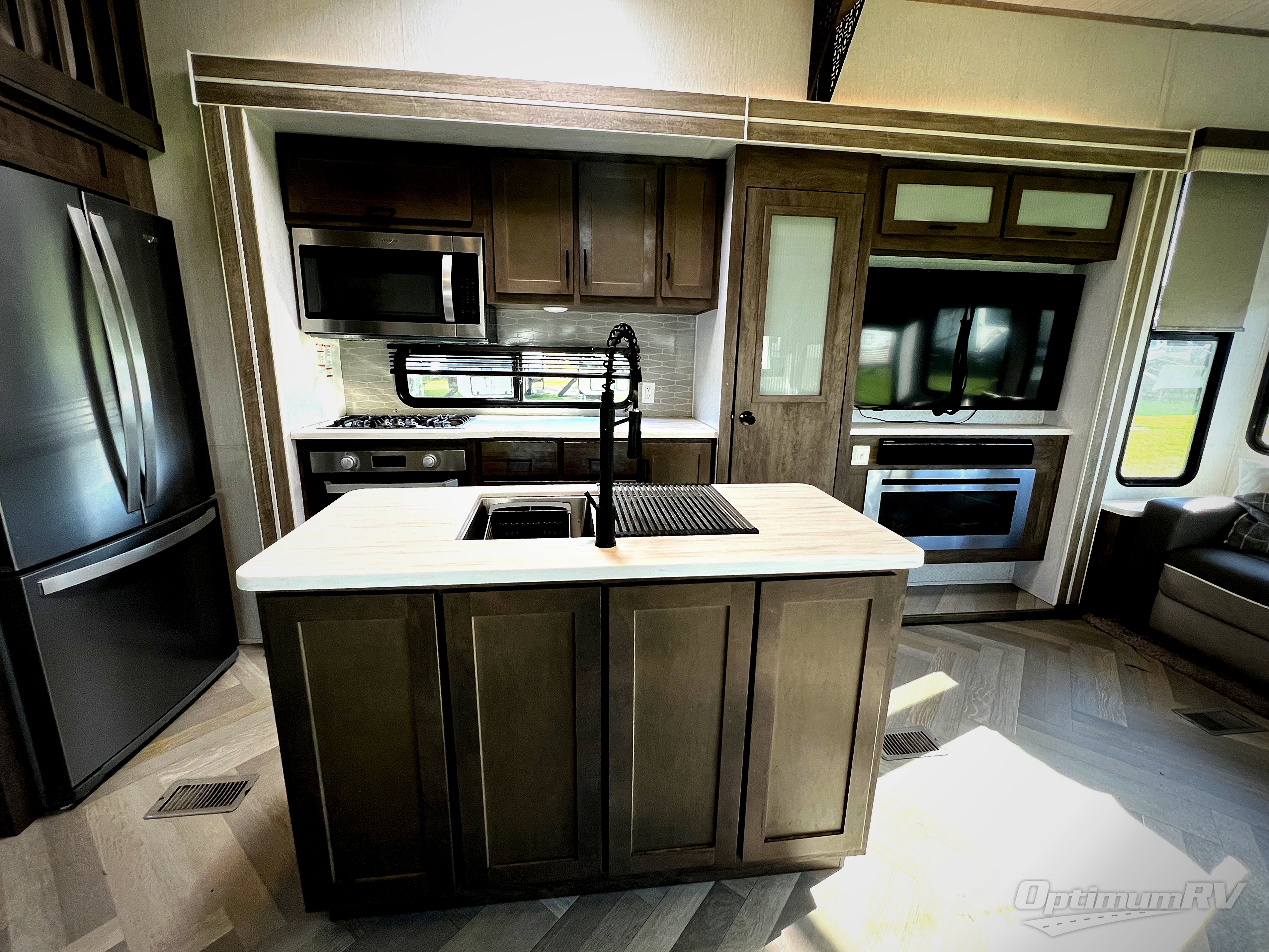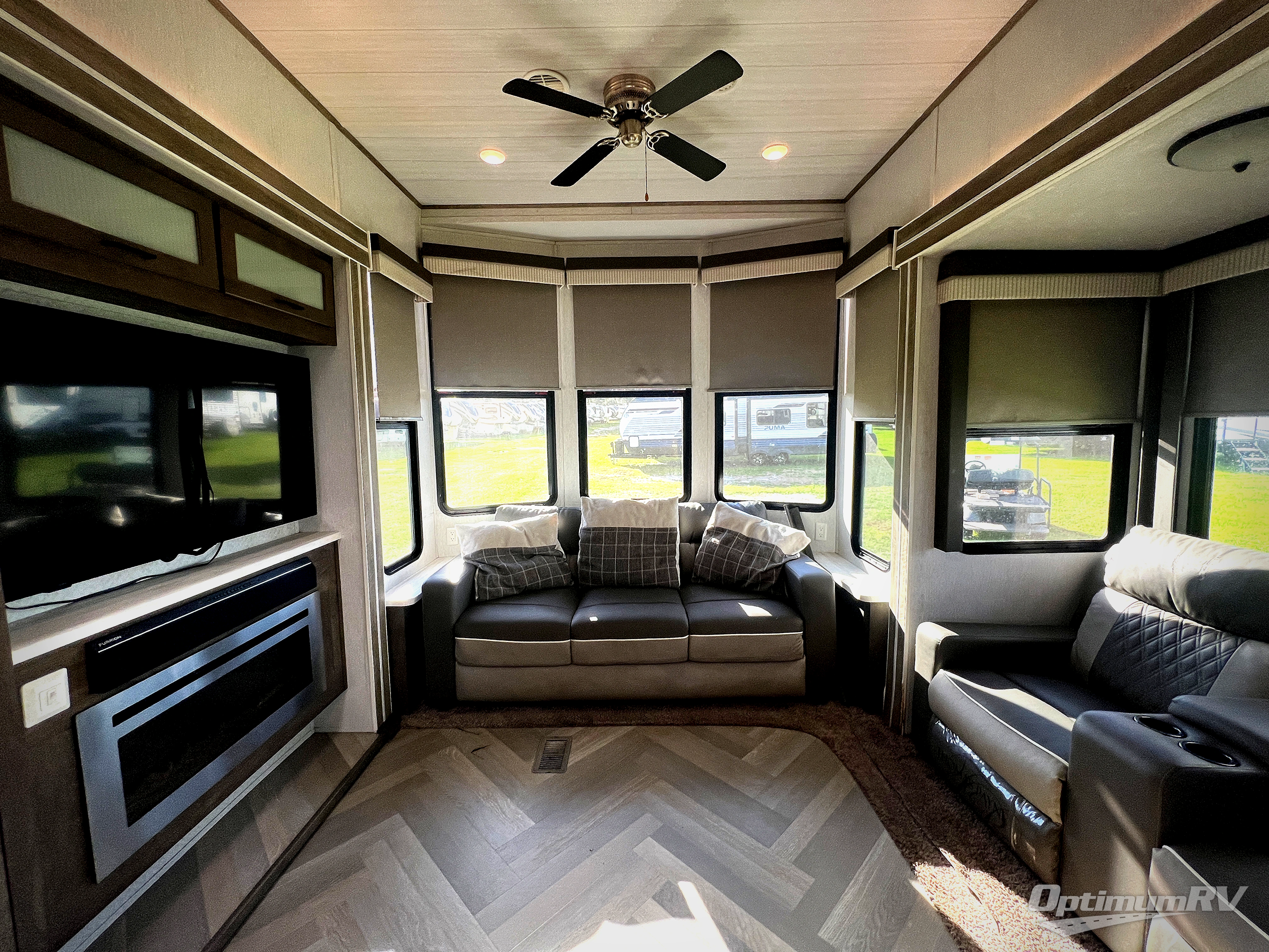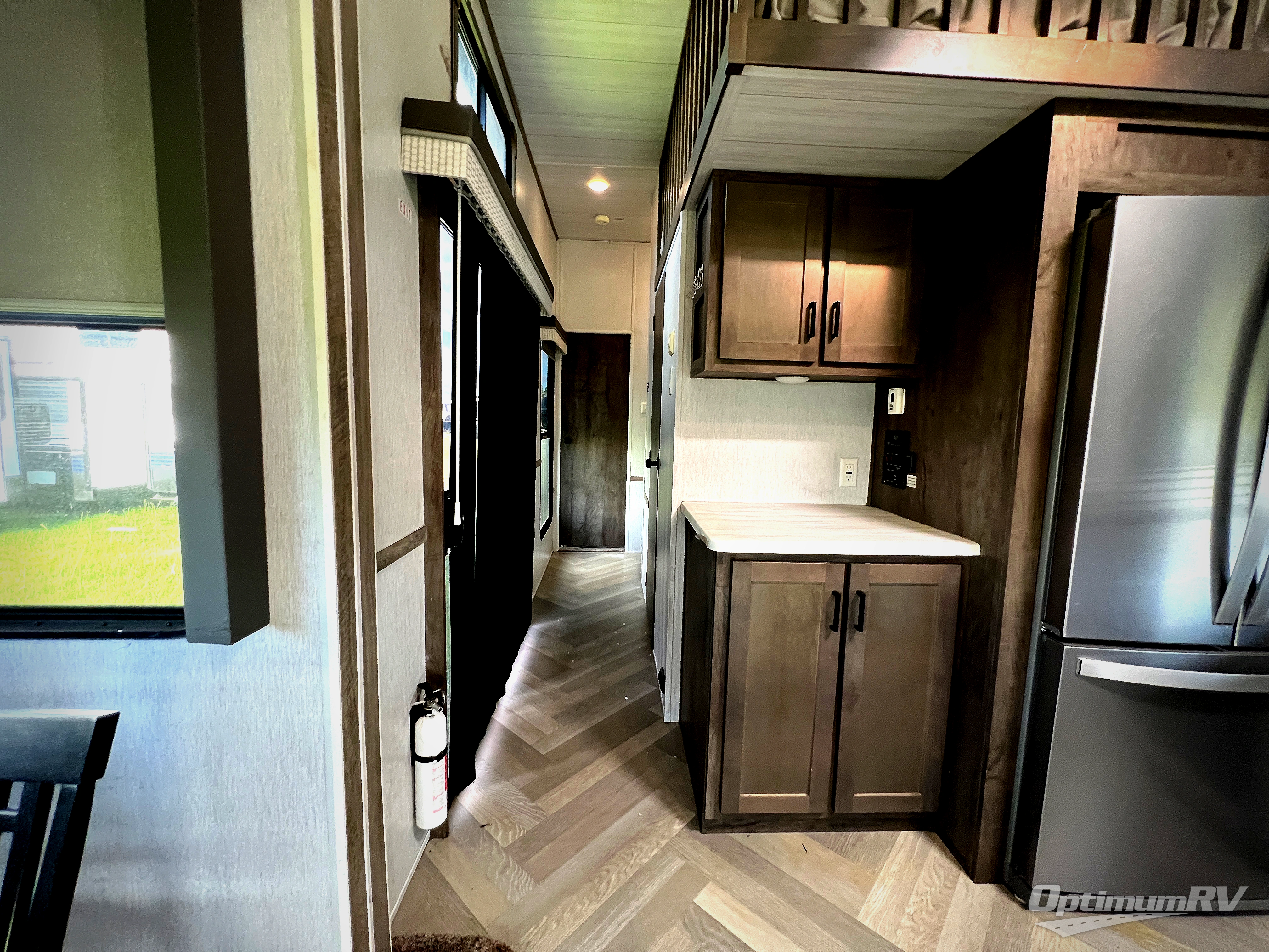 If you just need to get away from the busyness of life and need a little piece of home to escape to, the Forest River Wildwood Grand Lodge destination trailer is your ticket to paradise! The quality construction includes a 12" forged l-beam frame, 5-ply tongue and groove plywood floor decking, bowed truss roof rafters, plus more allowing you to own your trailer for many years to come! The interior is extremely beautiful and spacious with its 96" ceiling, upgraded designer furniture, stainless steel kitchen appliances, and a residential-inspired floating fireplace. The Bluetooth sound bar with a remote will provide endless nights of soothing music, and the ceiling fan in the living room is a residential touch that comes in handy when you don't want to blast the air conditioning to stay cool.