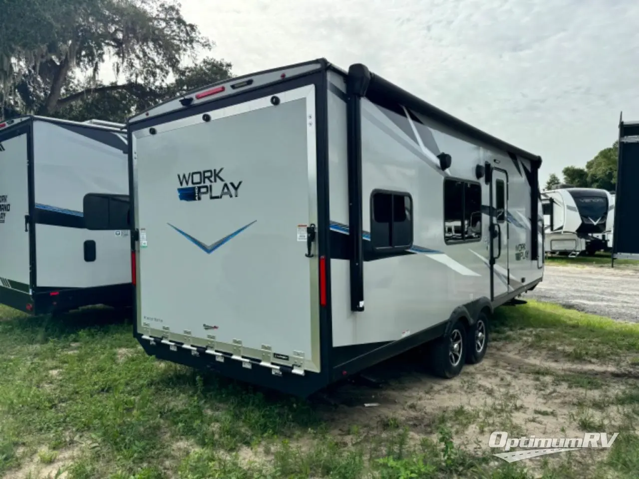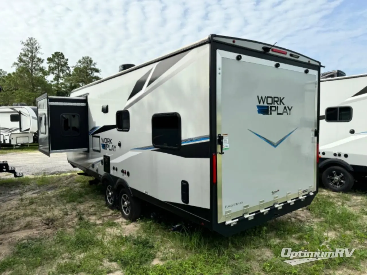 Each Work and Play toy hauler by Forest River is built tough with a mega rail powder coated chassis, a one-piece Tufflex PVC roof membrane, and a fiberglass front cap with rock guard. Towing is made hassle-free with the heavy duty Dexter axles with Nev-R-Adjust brakes and nitrogen filled tires. You will find many convenient features, such as a Winegard Air 360 and TV antenna, an outside spray port, and magnetic compartment door catches to store your riding gear. These toy haulers also include shaker style cabinets and doors, a residential bedspread, multiple USB ports for all your electronics, and many more amenities!