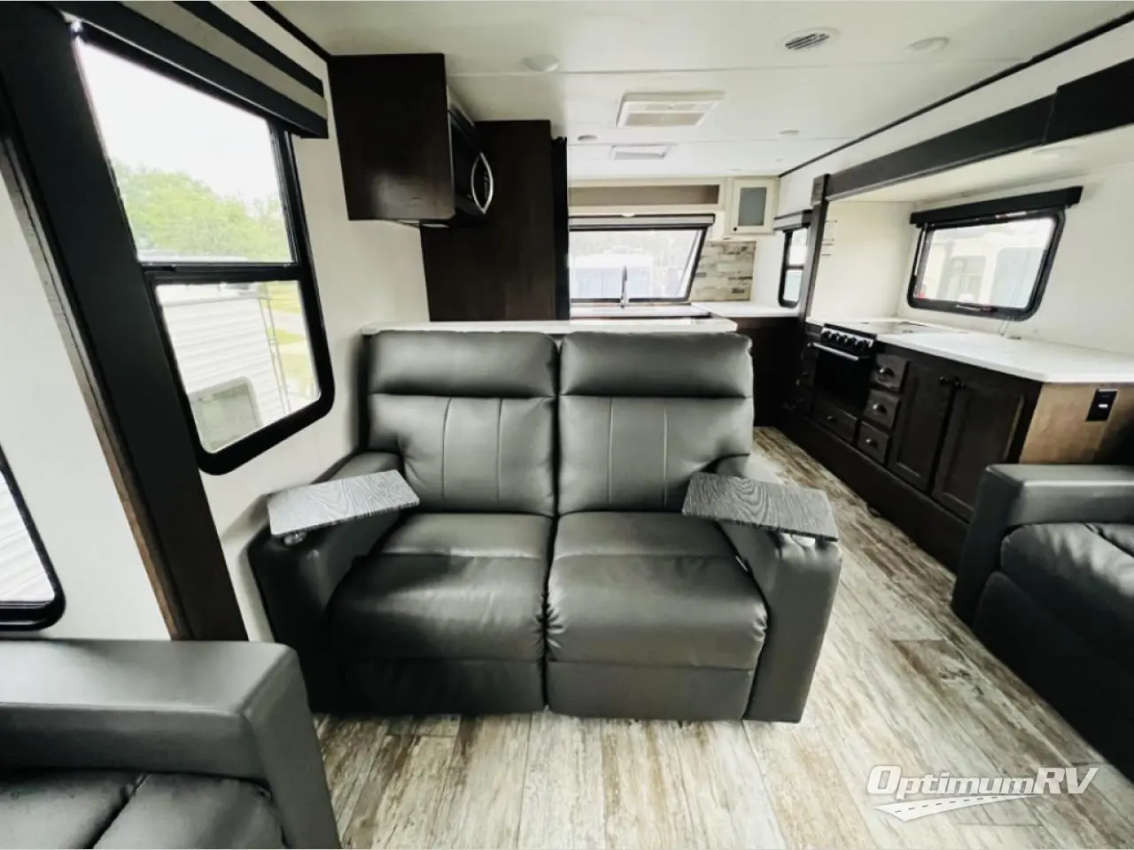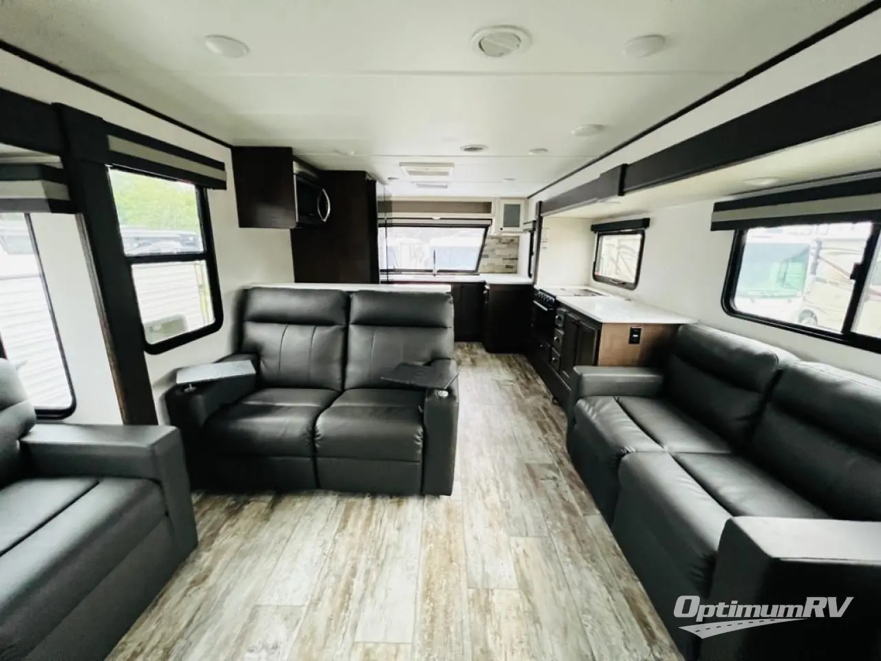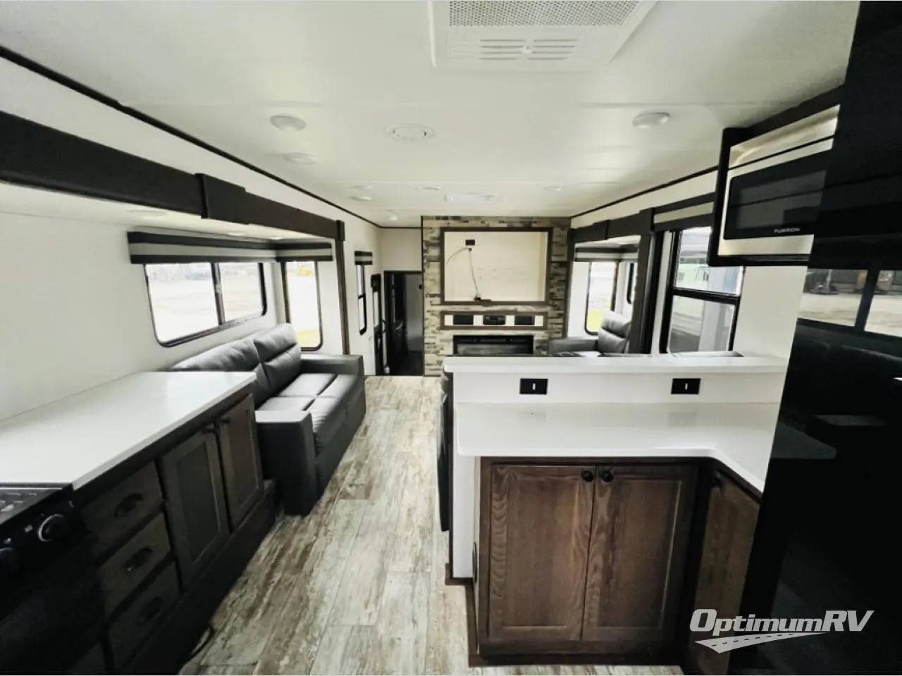 The chef will love cooking in the front kitchen of this toy hauler! It has lots of countertop space to prepare your meals and a 17" oven and cast iron cooktop to cook them. The middle living area has two sofas and theater seating to relax on while you watch a movie with the 50" TV and enjoy the electric fireplace below it. After a fun day at the beach, you can freshen up in the full bathroom with the shower with a seat then get changed in the private bedroom which has a queen bed slide and a wardrobe slide for all your clothes. The 11' garage not only has 5,000 lb. cargo tie downs, but also opposing sofas with a table in between, a bed above the sofas, and a half bathroom, plus one of the dual entry doors to the unit!
