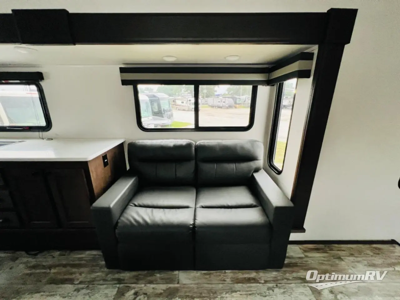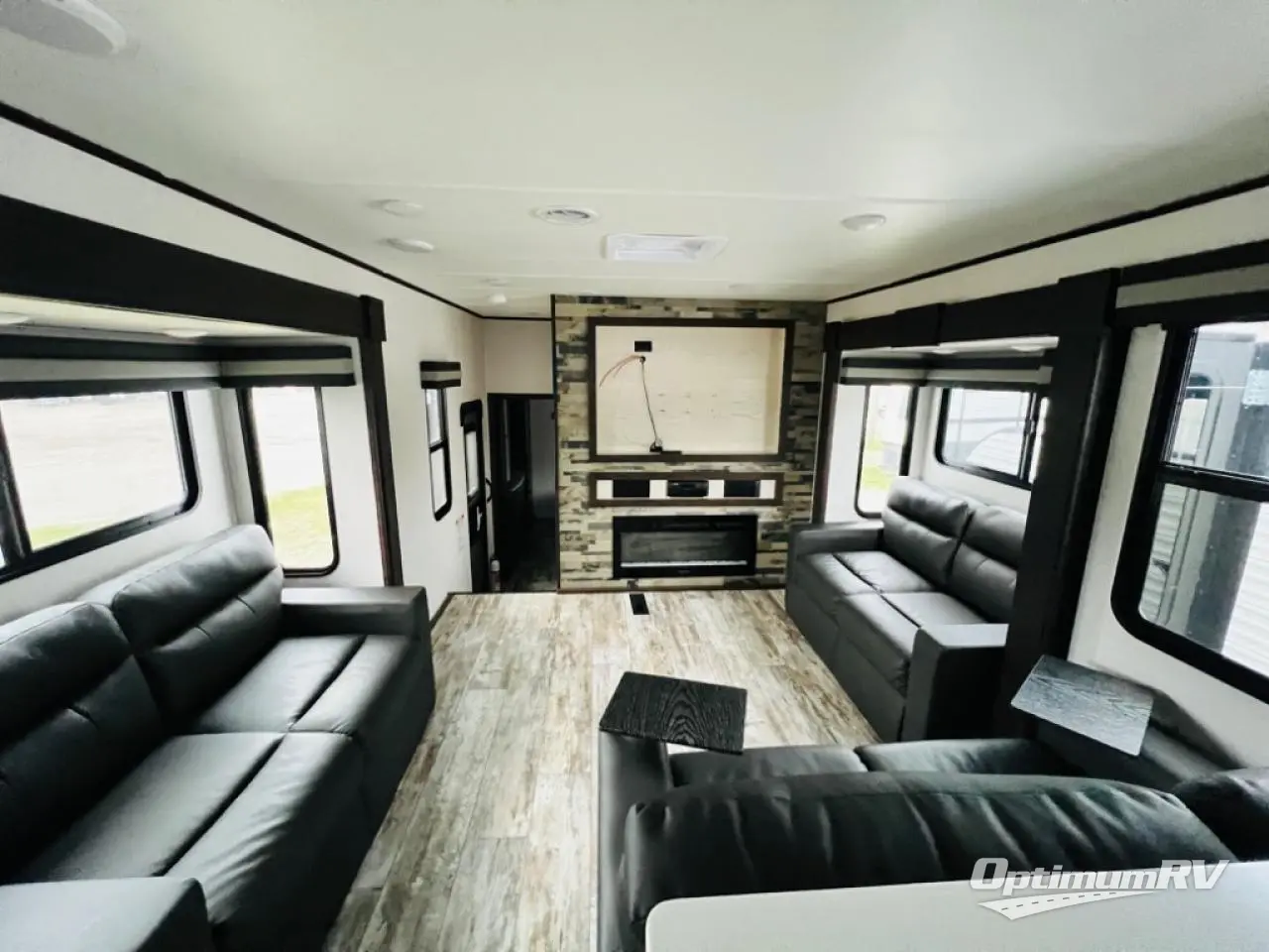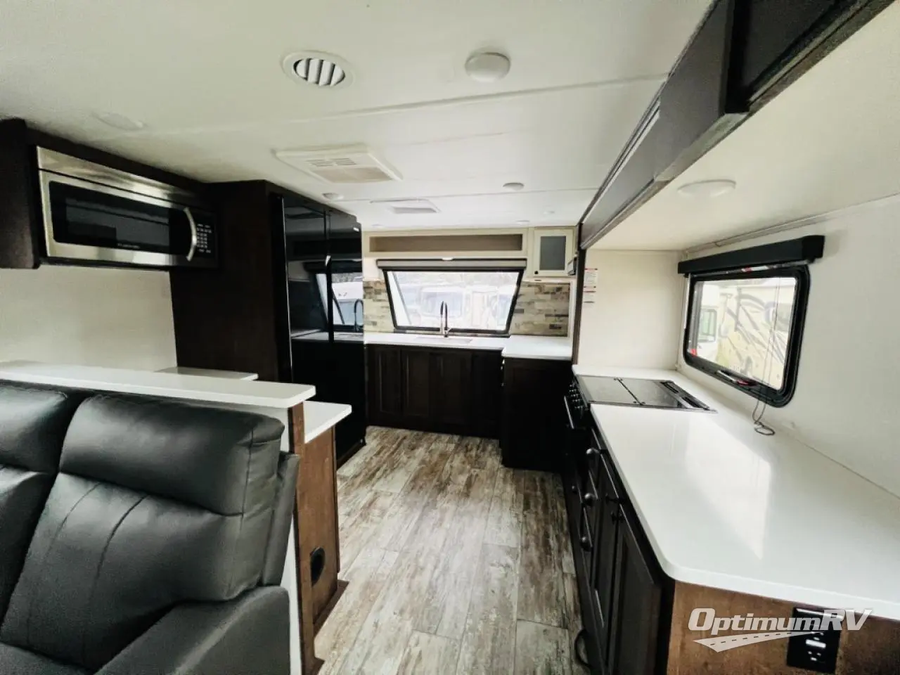 The chef will love cooking in the front kitchen of this toy hauler! It has lots of countertop space to prepare your meals and a 17" oven and cast iron cooktop to cook them. The middle living area has two sofas and theater seating to relax on while you watch a movie with the 50" TV and enjoy the electric fireplace below it. After a fun day at the beach, you can freshen up in the full bathroom with the shower with a seat then get changed in the private bedroom which has a queen bed slide and a wardrobe slide for all your clothes. The 11' garage not only has 5,000 lb. cargo tie downs, but also opposing sofas with a table in between, a bed above the sofas, and a half bathroom, plus one of the dual entry doors to the unit!