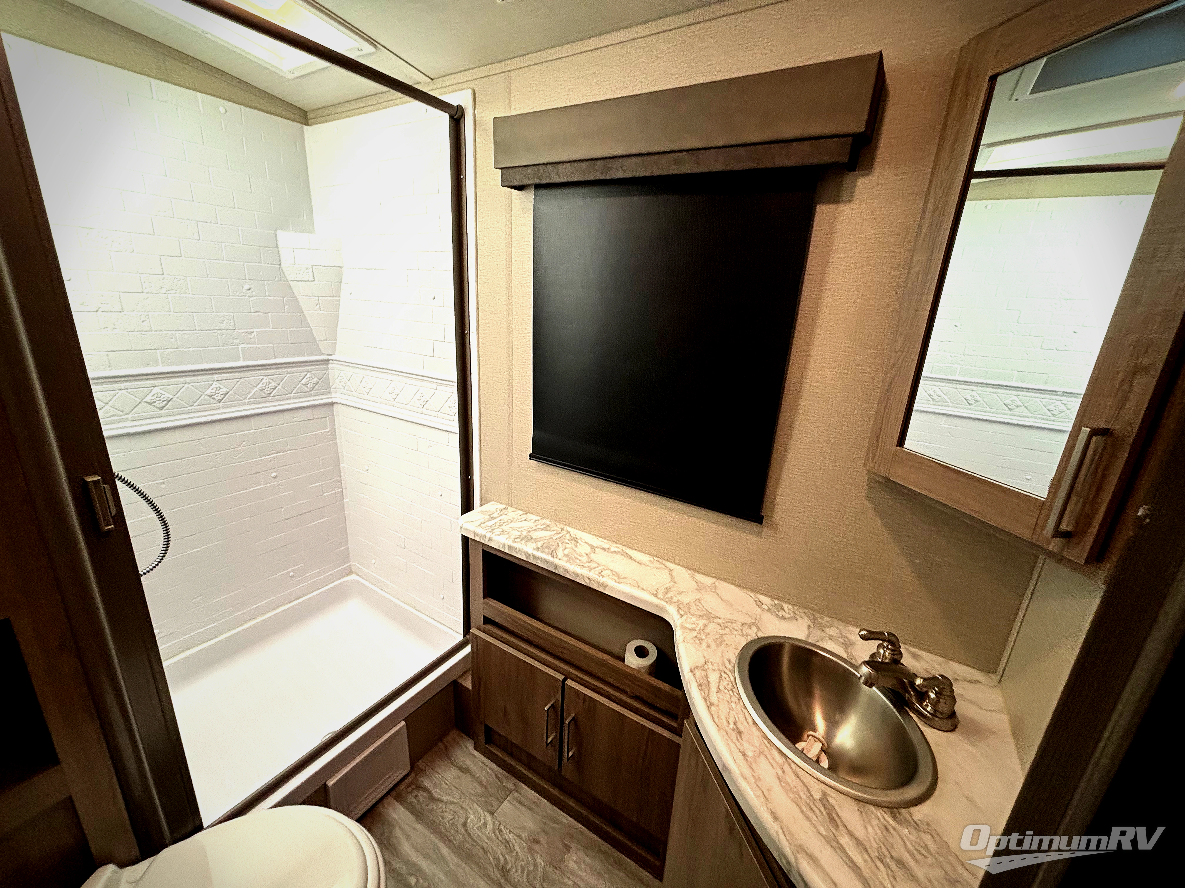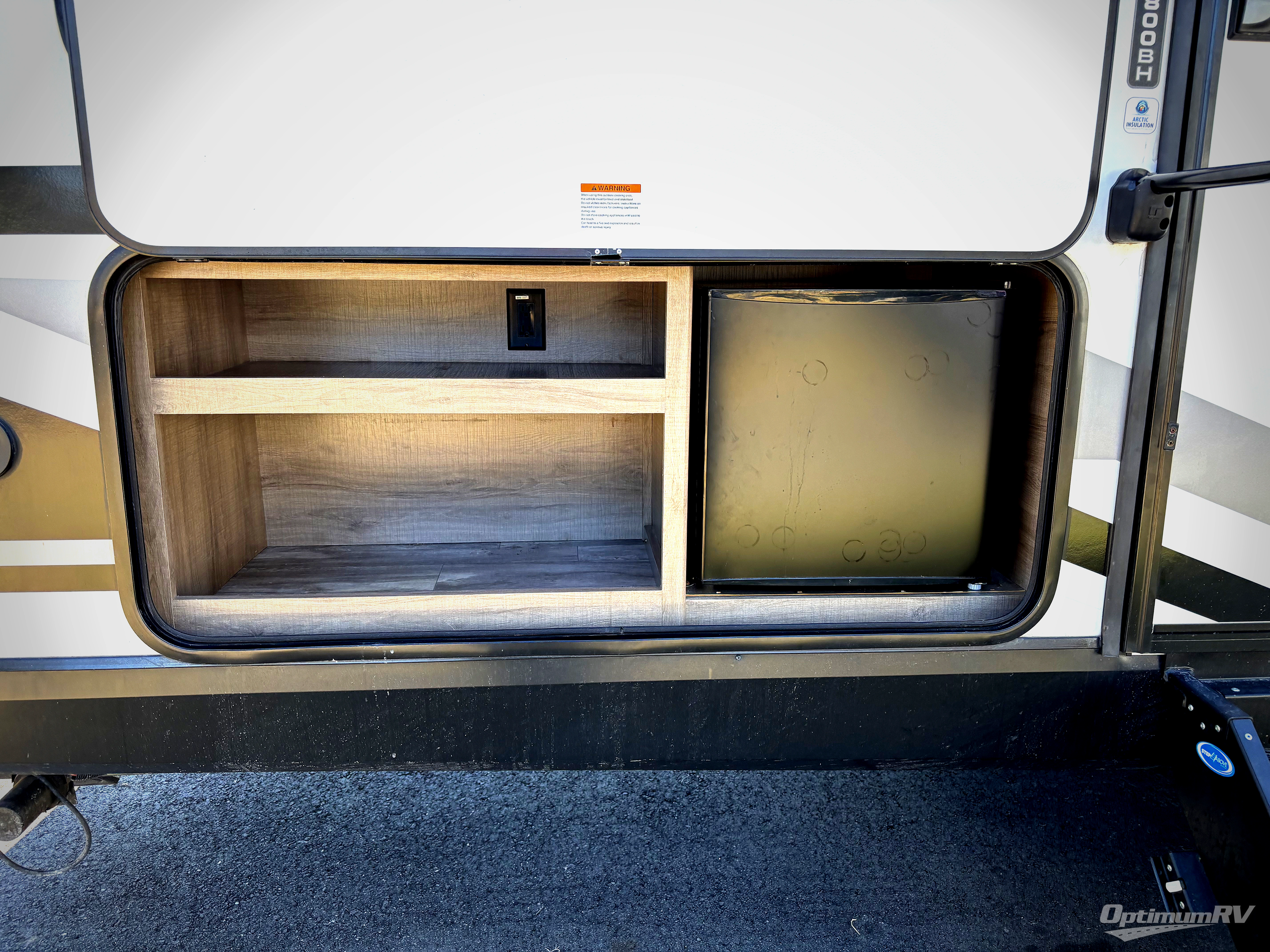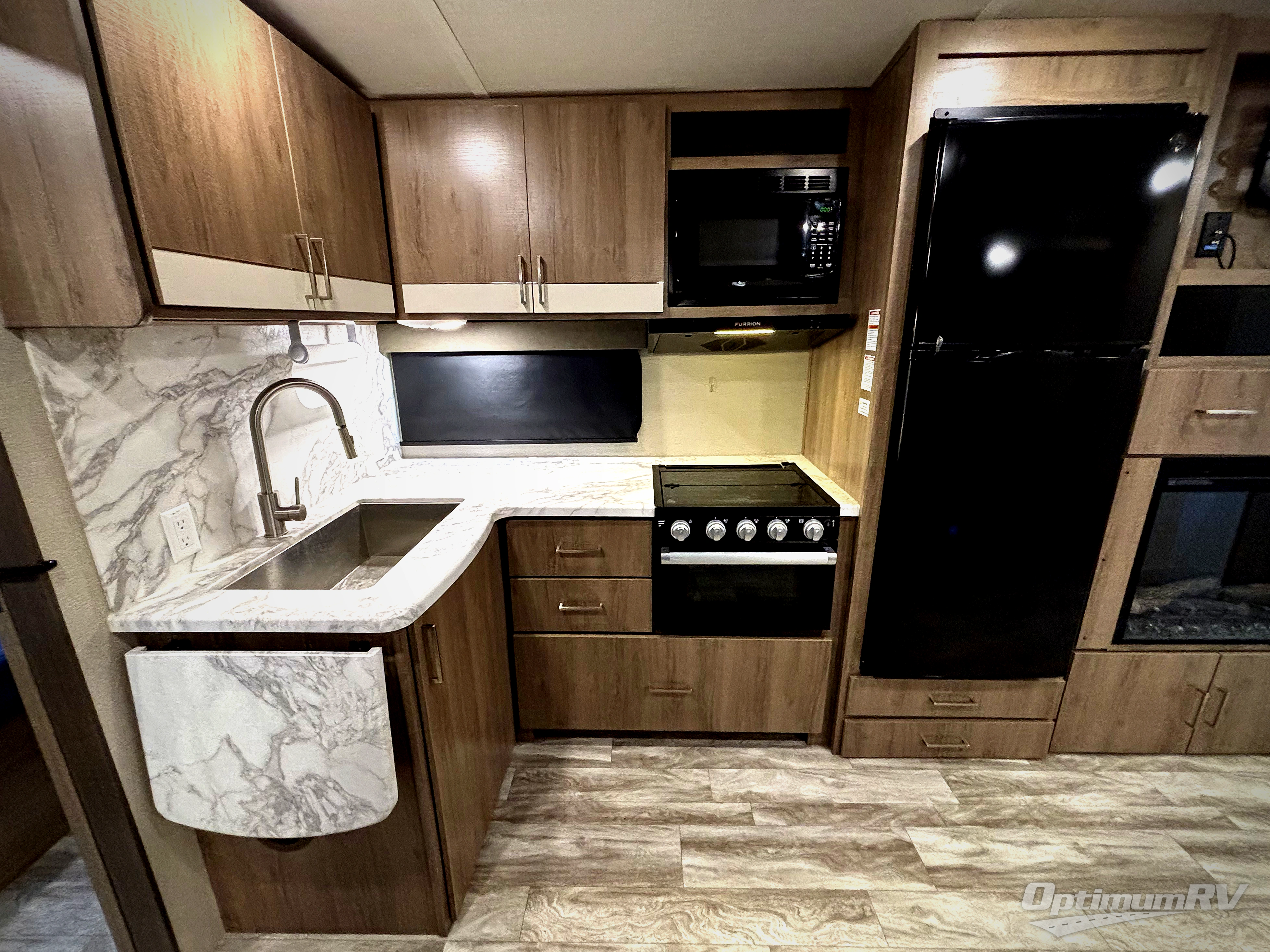 Where will you go with this Imagine travel trailer? The possibilities are endless! You can take your family on an exciting excursion because this trailer has enough sleeping space for everyone with the 60" x 80" bed in the private bedroom, the U-shaped dinette and tri-fold sofa in the main living area, and the 47" x 76" bunk beds with privacy curtains. You can come and go as you please with two entry doors, and the outdoor kitchen will be fun to use when the weather is nice. Your family's pet can eat out of the pet dish below the refrigerator, and the large slide will keep this trailer feeling spacious.