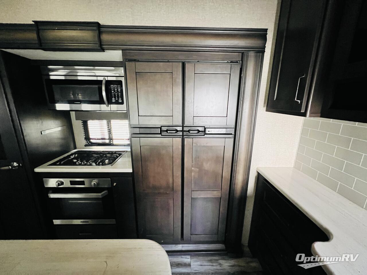 Whether you travel for pleasure or work, you will love the spacious main living and kitchen area with a rear tri-fold sofa that doubles as extra sleeping space, and the theatre seating directly across from the entertainment center with a 40" LED HDTV and a fireplace below. The kitchen island will make meal prepping and drying the dishes easier and the hutch is the perfect place to place your picture frames, nice dishes, and extra cooking items, plus the pantry is big enough to store all of your favorite snacks, dry ingredients and such. Outside you can enjoy two electric awnings that provide protection from the elements as you relax and visit with other RVers, and your camping chairs can easily be stored in the pass-through compartment. The double entry bathroom is convenient especially at night when you can slide the door to enter from the front master bedroom. You will find plenty of storage for your clothing and things, plus the bedroom slide out gives you drawers and linen storage that stretches into the full bathroom.