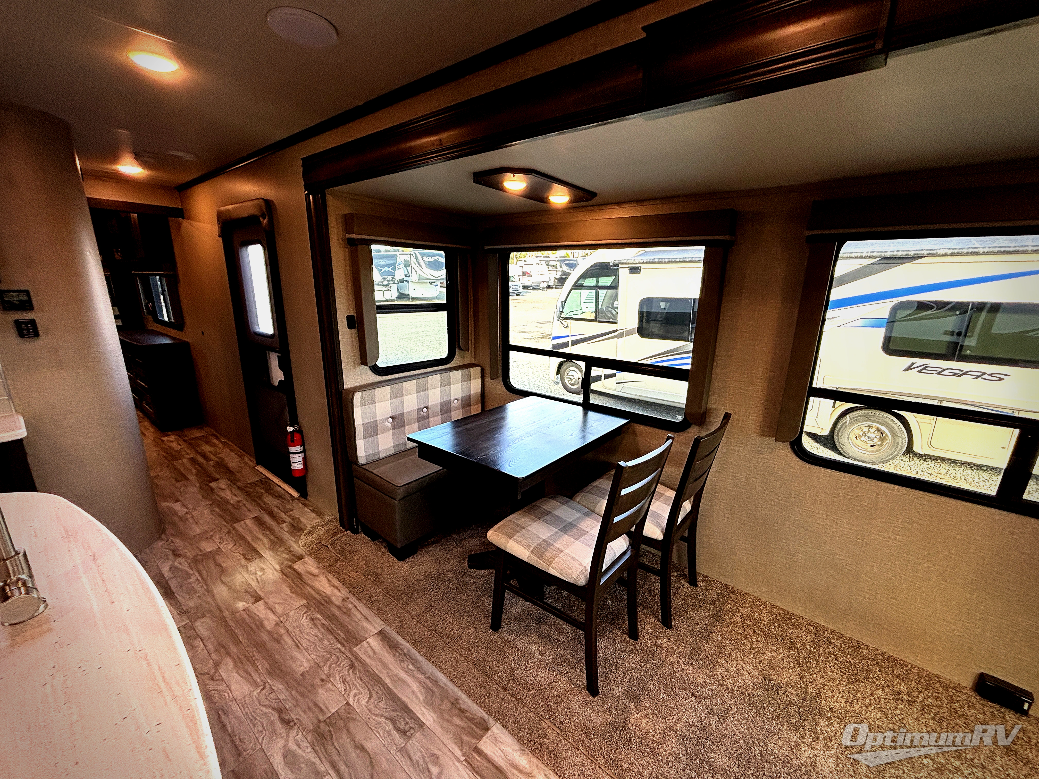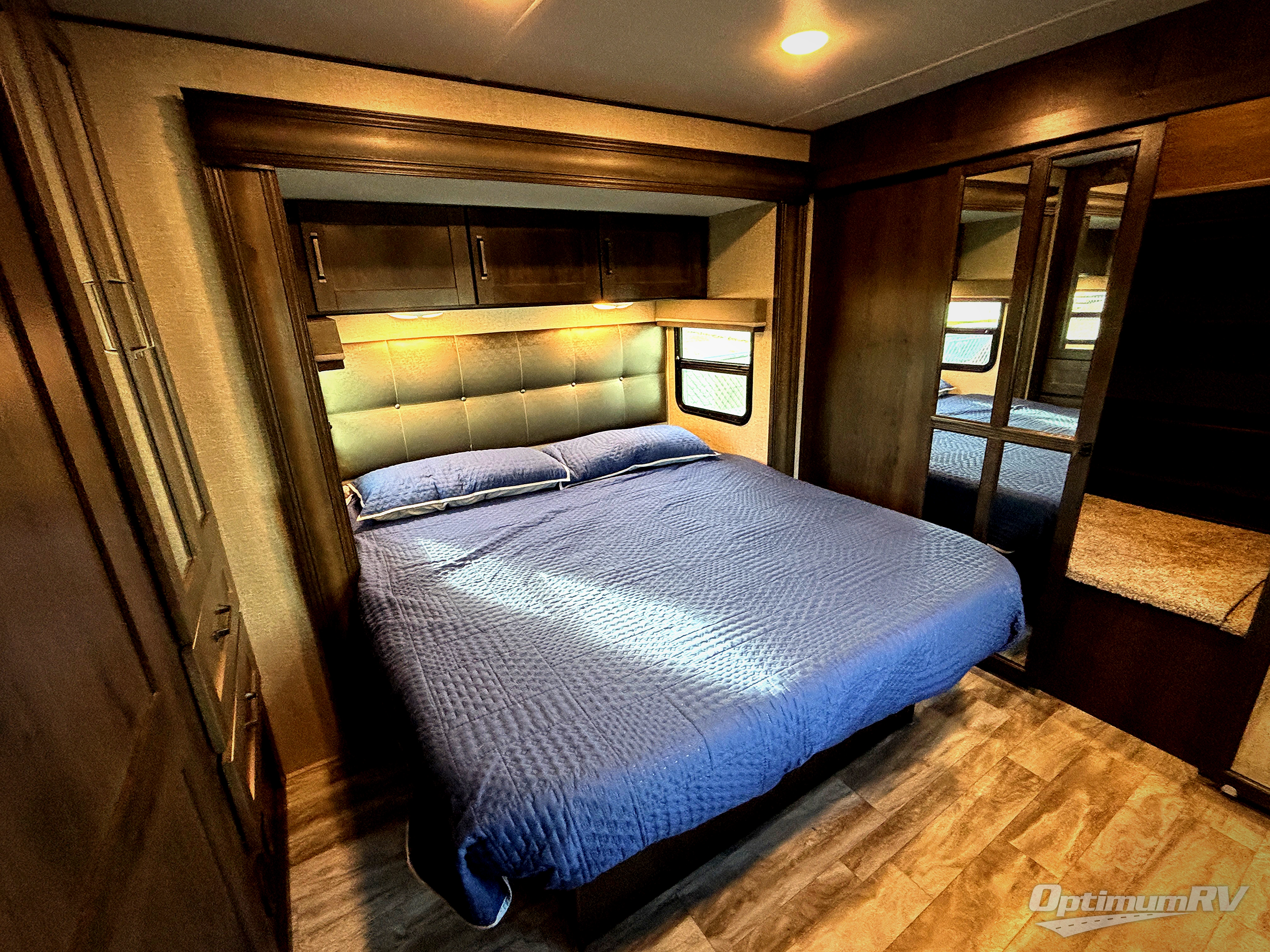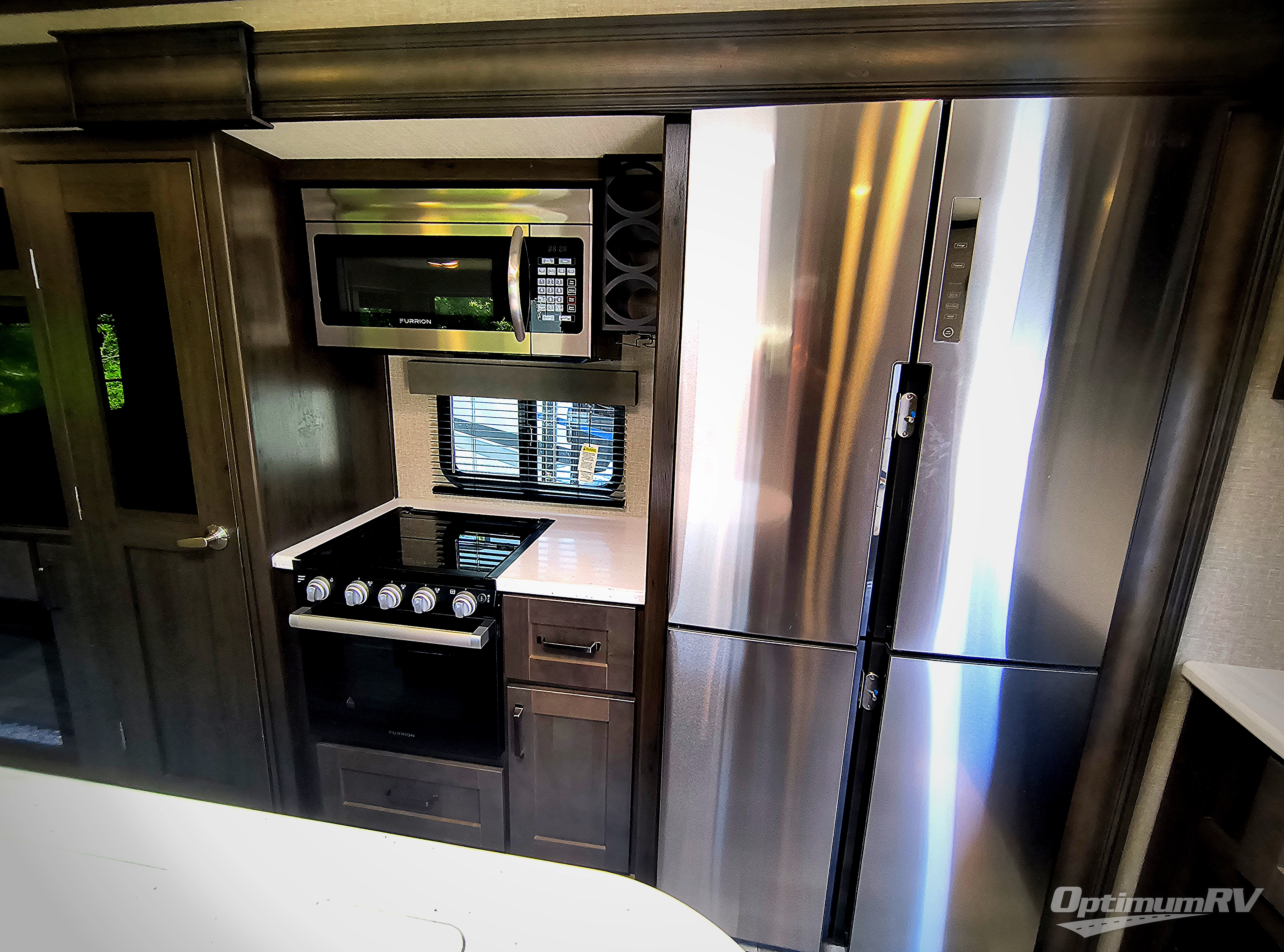 The chef of the group will love the gourmet kitchen including the 16 cu. ft. refrigerator that will hold lots of cold ingredients, beverages and leftovers, the center island when preparing and serving meals, and the hutch with overhead cabinets to display decor and store dishes and such. This area also includes two slide outs for more floor space and furniture to relax on including theatre seating with cupholders for your drinks, a booth dinette to dine at and work from or choose a free standing dinette option, and a rear tri-fold sofa that offers sleeping space for two at night. There is a 40" LED HDTV with fireplace below to enjoy while inside, plus there are two awnings outdoors to relax under. When you are ready to call it a night, get cleaned up in the full bathroom, and retire to your front bedroom with a slide out queen bed or choose a king option, a front full-wall wardrobe with washer/dryer prep, a dresser and an additional wardrobe with drawers.