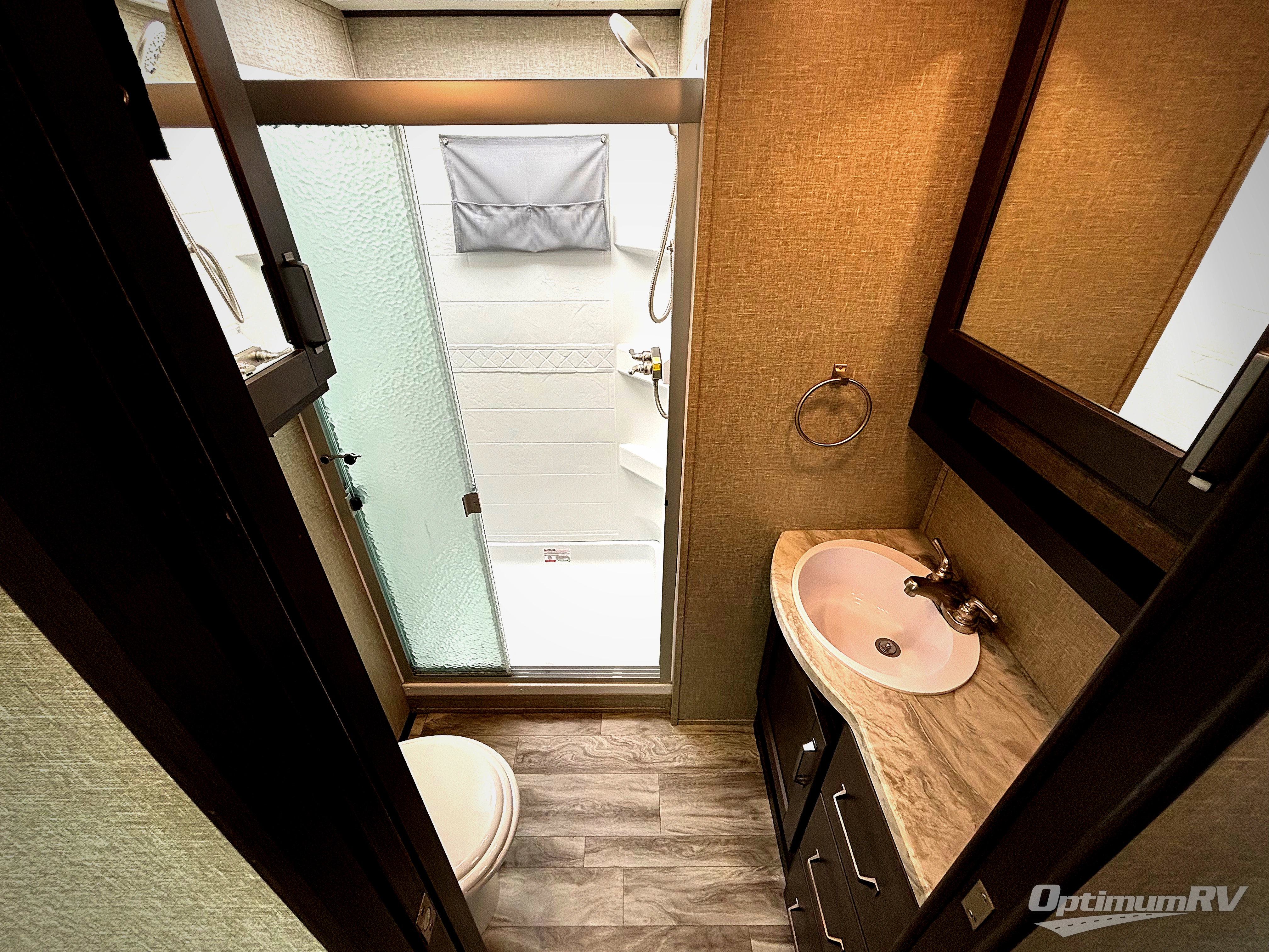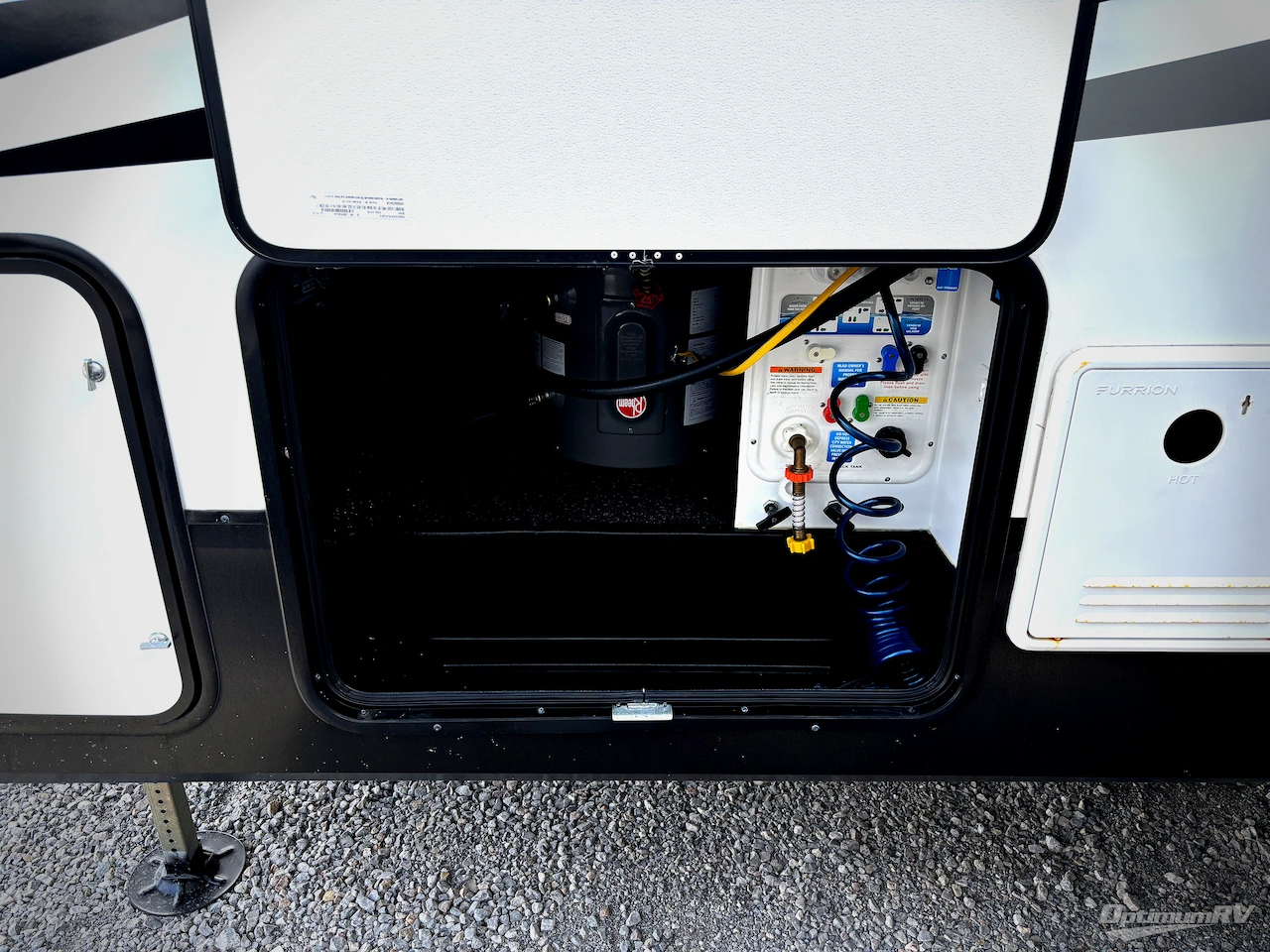 Get ready to enjoy the great outdoors with your family and friends with this fifth wheel at your favorite campsite! The middle bunkhouse with two bunk beds and drawer storage below within a slide and the dresser make this a popular space for guests. Everyone can share the full bathroom which offers linen storage and a space savings door, and you will have your own front bedroom with a queen bed and clothing storage. The main living and kitchen area offers dual slides for maximum floor space, a three person theatre seating, a U-shaped lounge with table to dine at, and an island that the cook will love. You will also find a gourmet kitchen and a 10 cu. ft. refrigerator, plus a pantry for all the goodies. And outside you can stow some beverages in the 1.6 cu. ft. refrigerator and relax under the 18' electric awning.