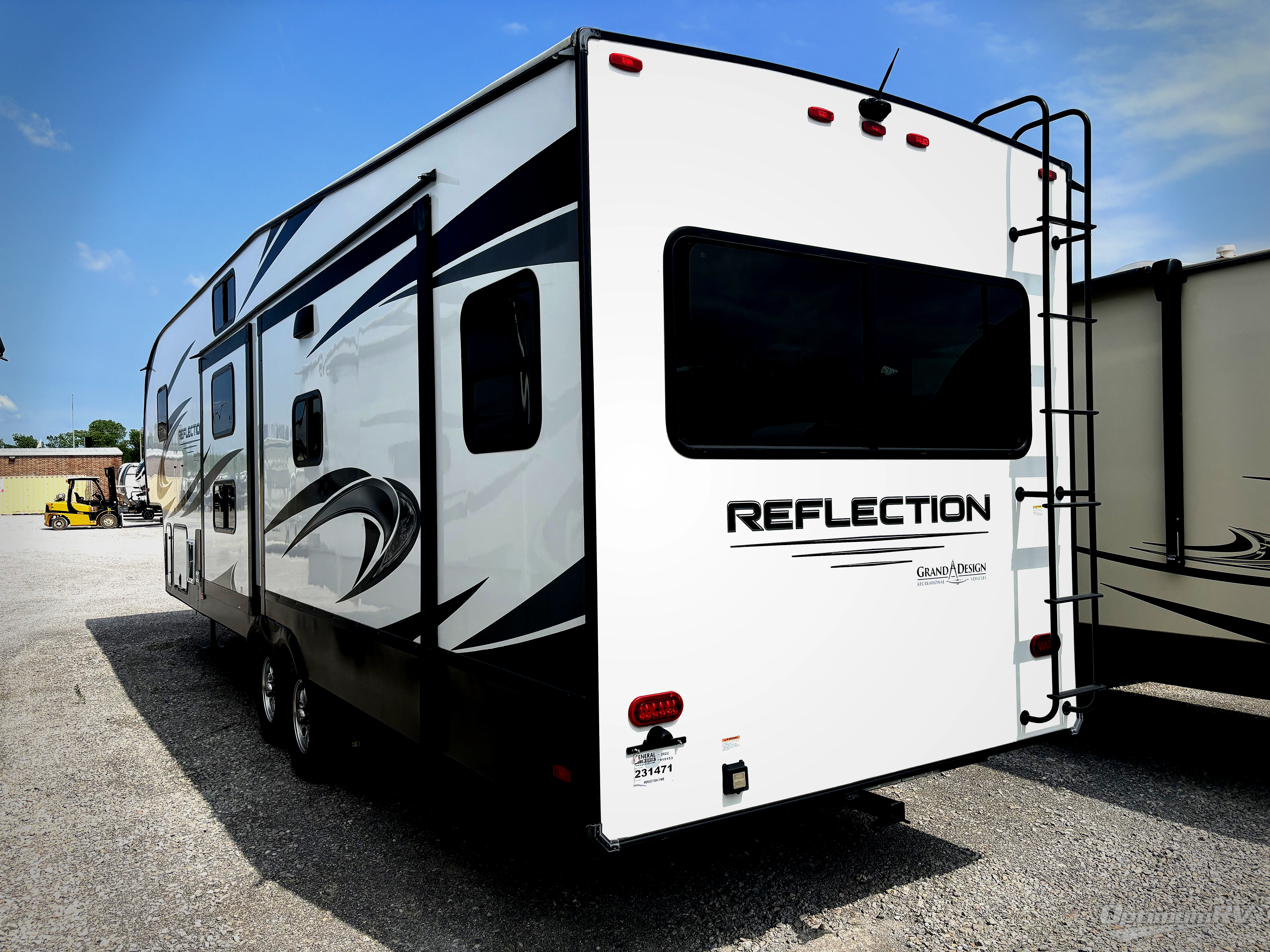 With any Reflection fifth wheels by Grand Design, you will have a 165W solar panel for off-grid camping and a 50 Amp charge controller and inverter prep, a Max Turn radius front cap for easy towing around town and into your campsite, a Universal All-In-One Docking Station, unobstructed pass-through storage, and Goodyear E-rated tires. Some other top features include a chef's kitchen with a 30" stainless steel microwave and residential cooktop, a USB charging station, and the ductless "Evenflow" heating system with no vents in the floor to collect debris. Each is constructed of high gloss gel coat exterior sidewalls, residential 5" truss rafters, walk-on roof decking, a fiberglass and radiant foil roof and front cap insulation plus laminated aluminum framed side walls, rear wall, roof and end walls in slide rooms. Choose luxury, value and towability over all the others, take home a Reflection of your good taste!