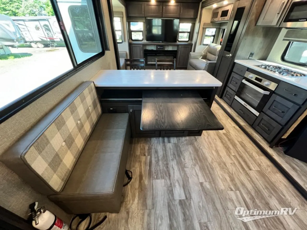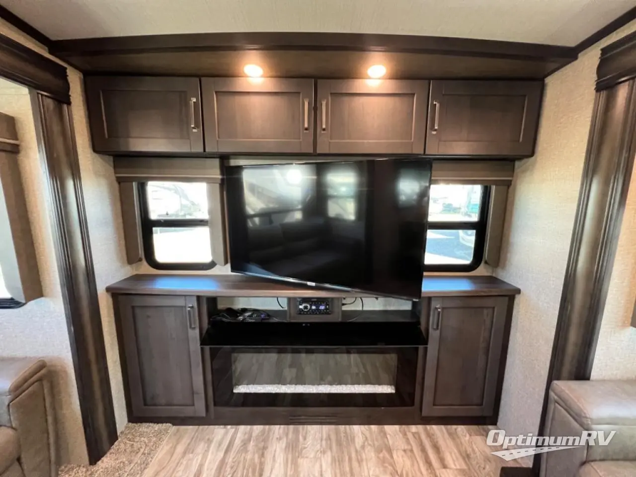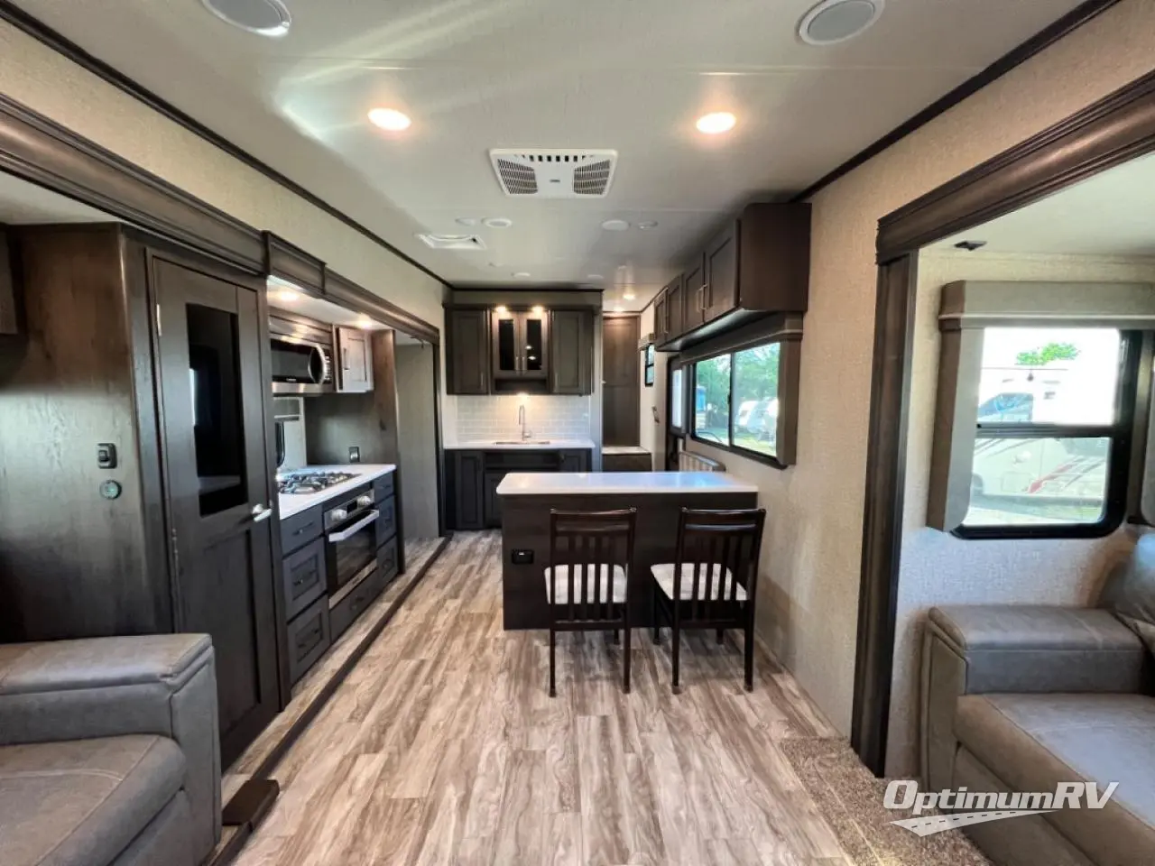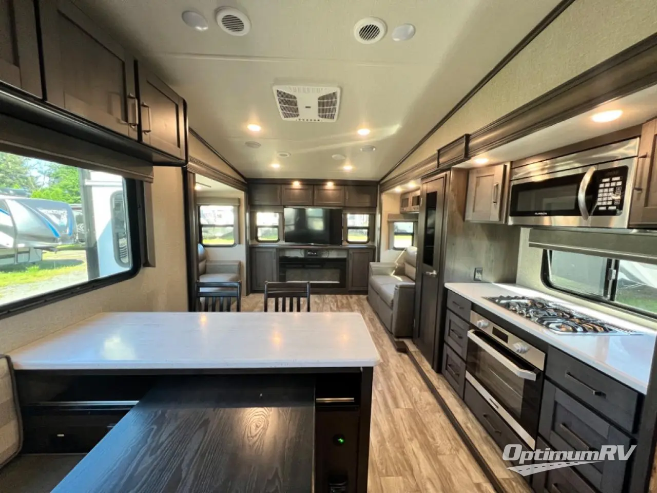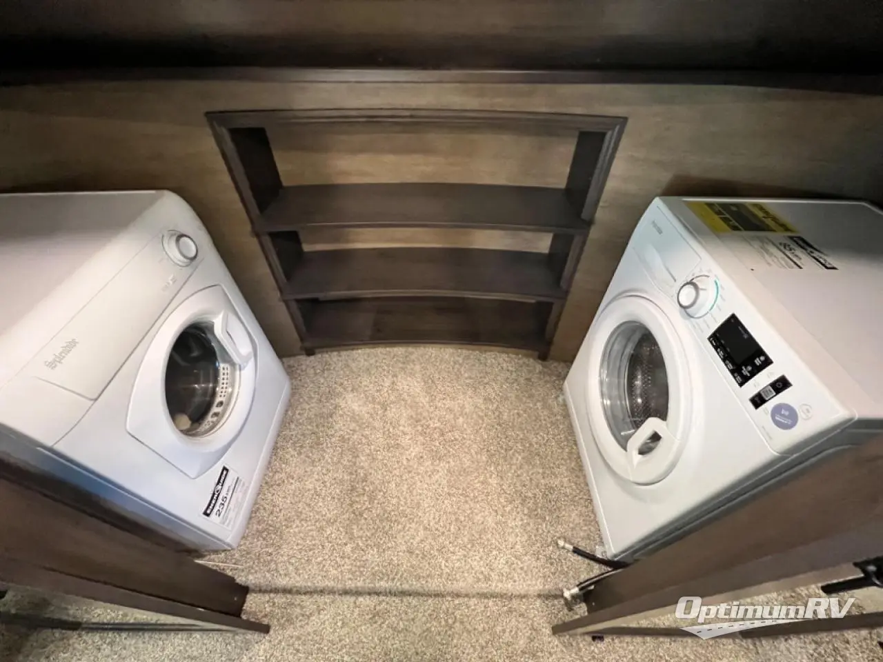 Looking for a separate living area from the kitchen in your next RV? Do you want to be able to entertain while camping? Well this fifth wheel has what you want, plus much more! The rear living area has two opposing tri-fold sofas, and theatre seating directly across from the rear entertainment center with a 50" LED HDTV and a 48" fireplace below it, plus windows and storage. The middle kitchen area offers the cook a large pantry, a 16 cu. ft. refrigerator, and extra counter space around the deep seated stainless steel sink. And there is a free standing adjustable dinette with a storage ottoman and more counter space nearby giving you a place for your things while dining, playing game or even working. The full bathroom can be accessed from the hallway that leads to the front bedroom which offers a queen bed slide or choose a king option, a dresser with window above, plus a full wall wardrobe with a place to add a washer/dryer option to keep everything clean while away.
