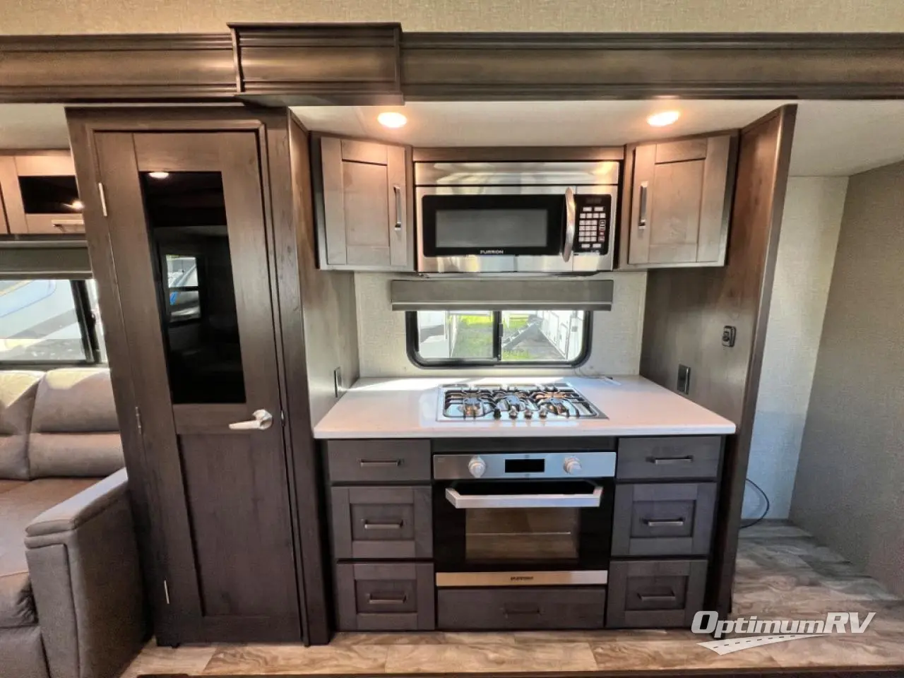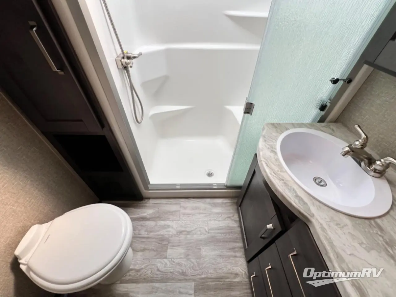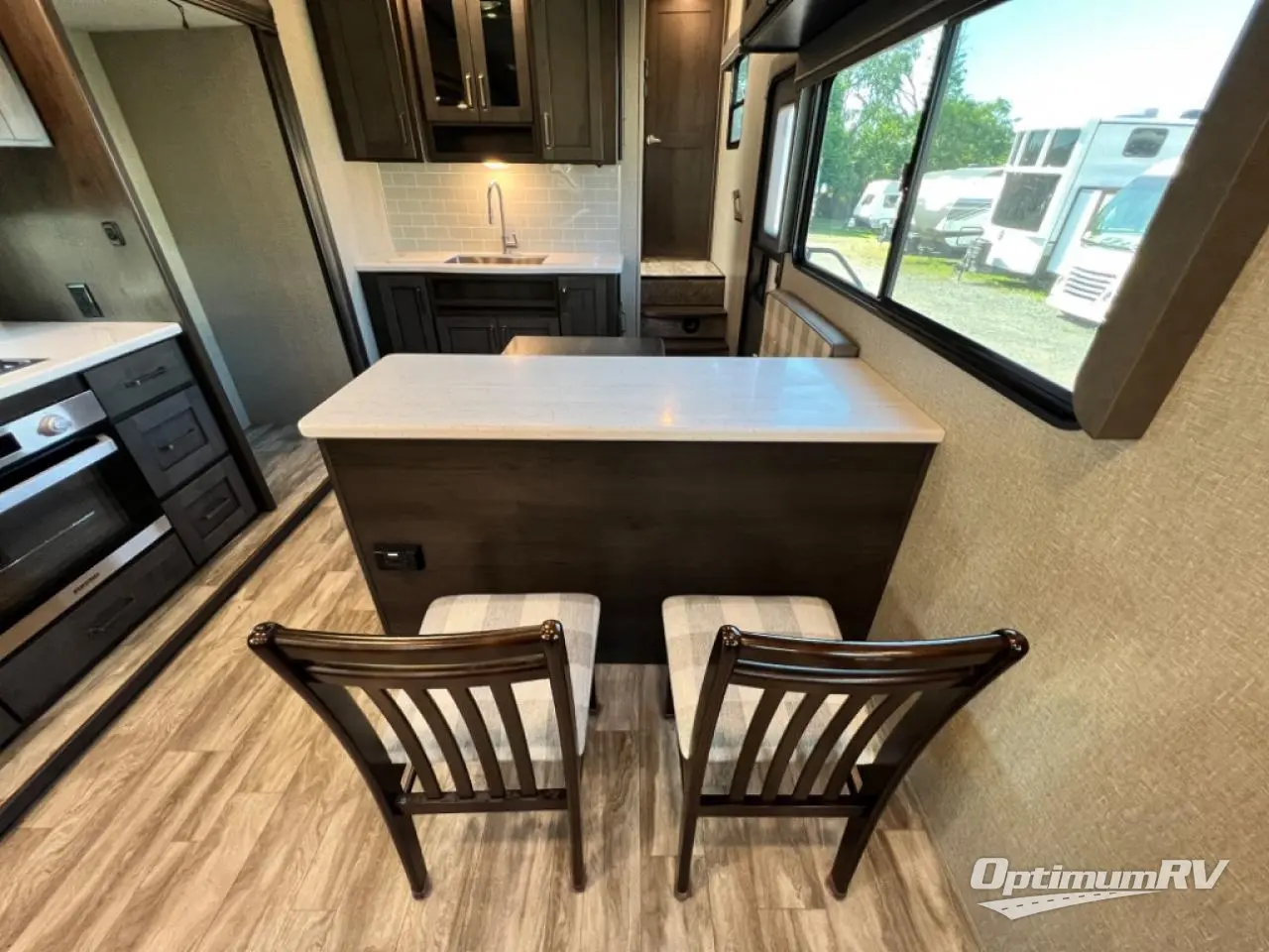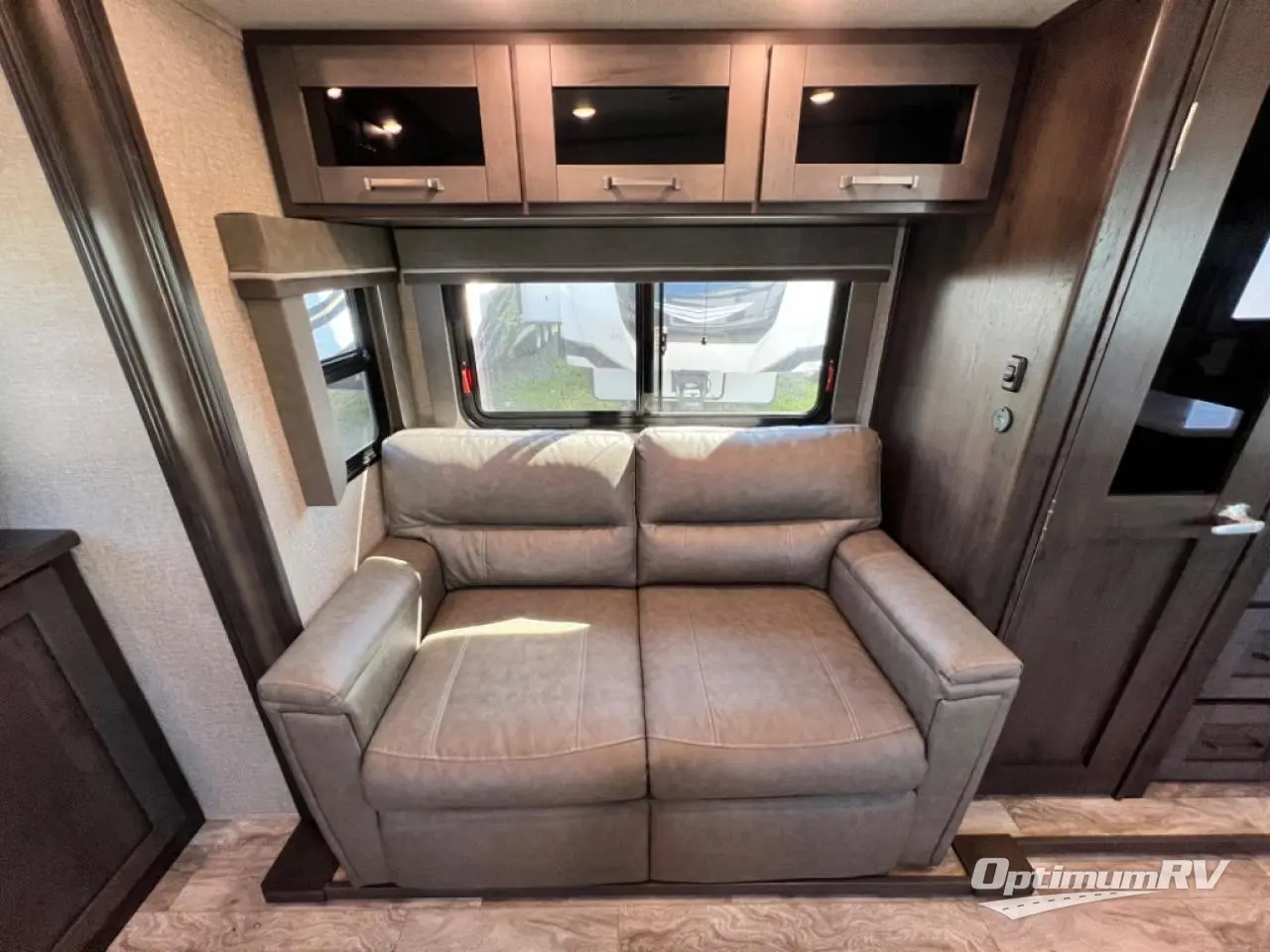 Looking for a separate living area from the kitchen in your next RV? Do you want to be able to entertain while camping? Well this fifth wheel has what you want, plus much more! The rear living area has two opposing tri-fold sofas, and theatre seating directly across from the rear entertainment center with a 50" LED HDTV and a 48" fireplace below it, plus windows and storage. The middle kitchen area offers the cook a large pantry, a 16 cu. ft. refrigerator, and extra counter space around the deep seated stainless steel sink. And there is a free standing adjustable dinette with a storage ottoman and more counter space nearby giving you a place for your things while dining, playing game or even working. The full bathroom can be accessed from the hallway that leads to the front bedroom which offers a queen bed slide or choose a king option, a dresser with window above, plus a full wall wardrobe with a place to add a washer/dryer option to keep everything clean while away.