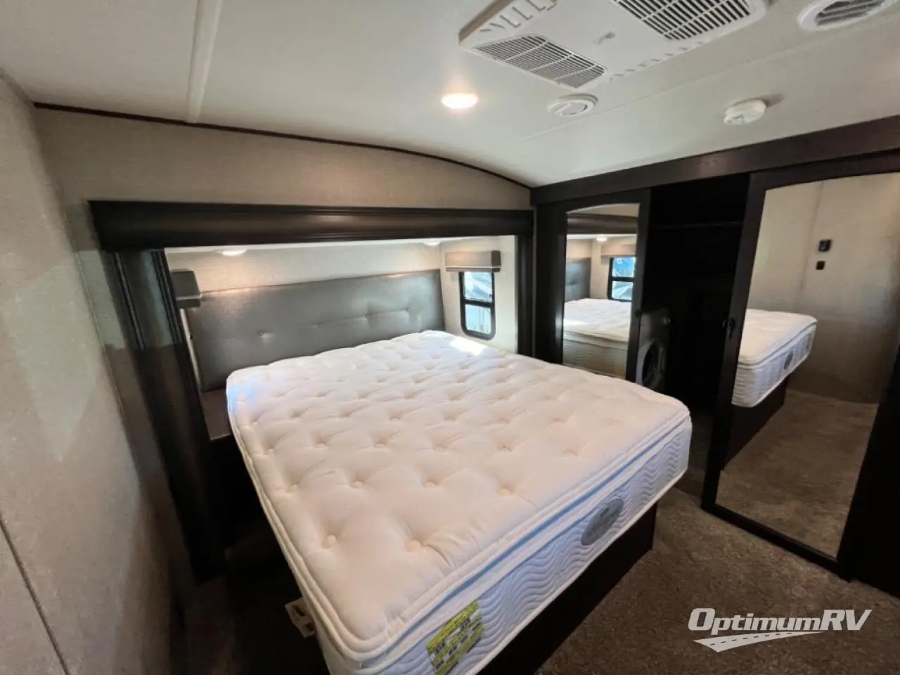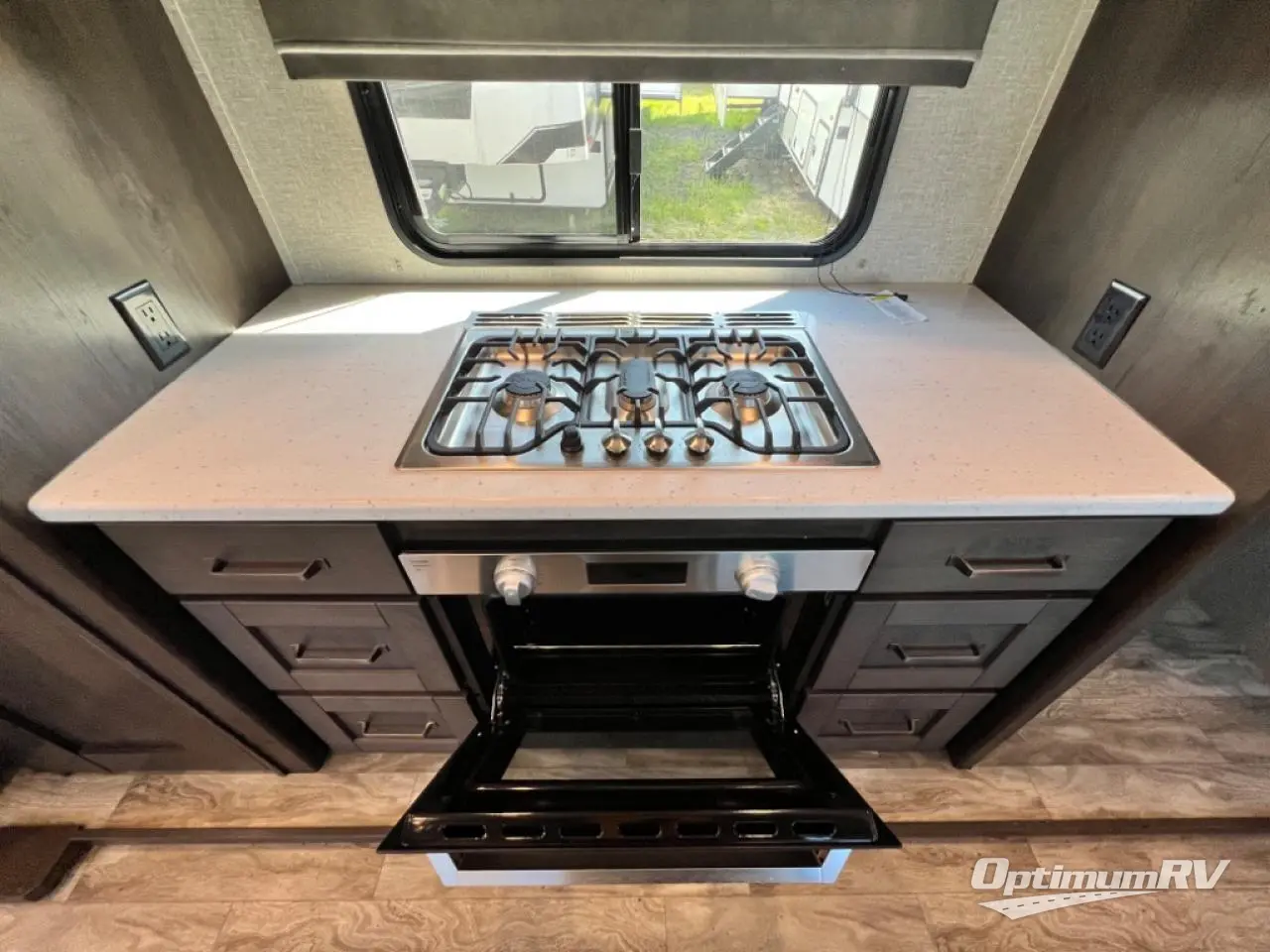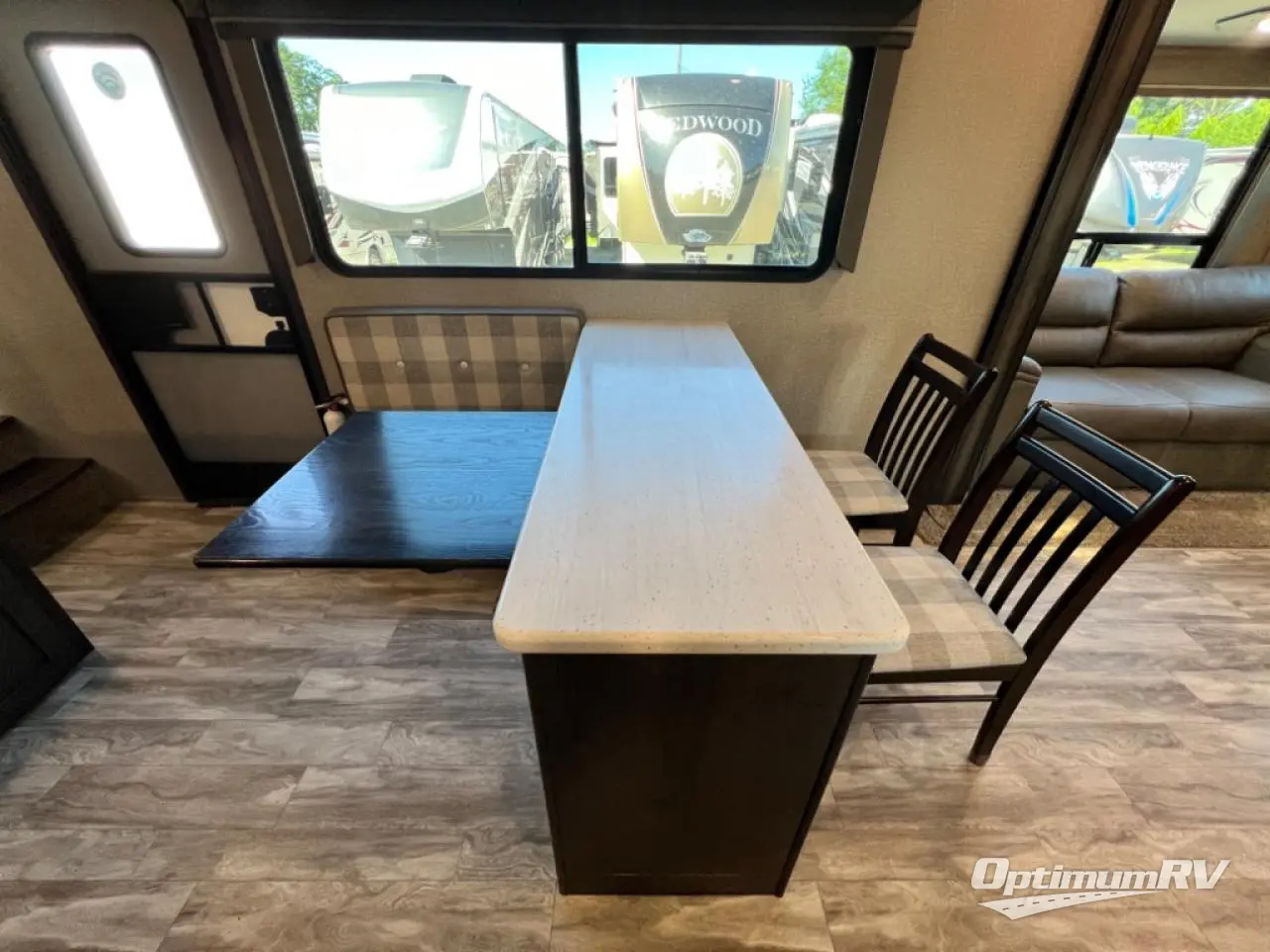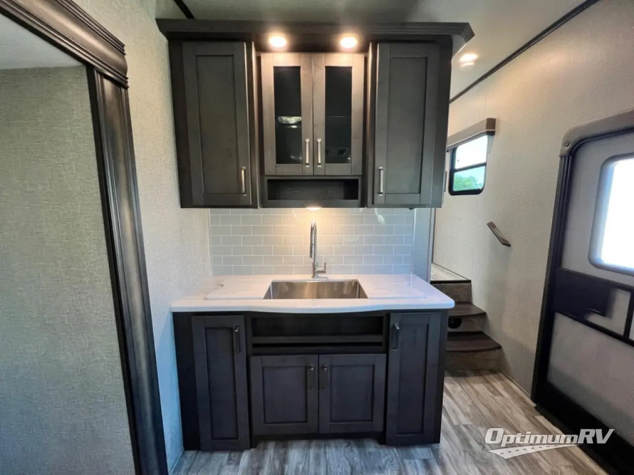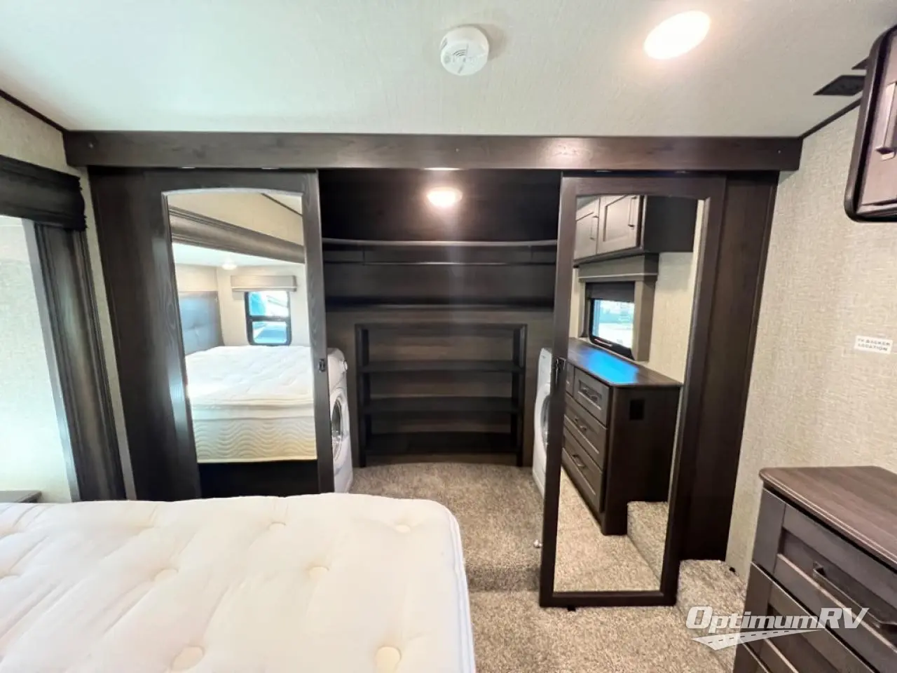 Looking for a separate living area from the kitchen in your next RV? Do you want to be able to entertain while camping? Well this fifth wheel has what you want, plus much more! The rear living area has two opposing tri-fold sofas, and theatre seating directly across from the rear entertainment center with a 50" LED HDTV and a 48" fireplace below it, plus windows and storage. The middle kitchen area offers the cook a large pantry, a 16 cu. ft. refrigerator, and extra counter space around the deep seated stainless steel sink. And there is a free standing adjustable dinette with a storage ottoman and more counter space nearby giving you a place for your things while dining, playing game or even working. The full bathroom can be accessed from the hallway that leads to the front bedroom which offers a queen bed slide or choose a king option, a dresser with window above, plus a full wall wardrobe with a place to add a washer/dryer option to keep everything clean while away.