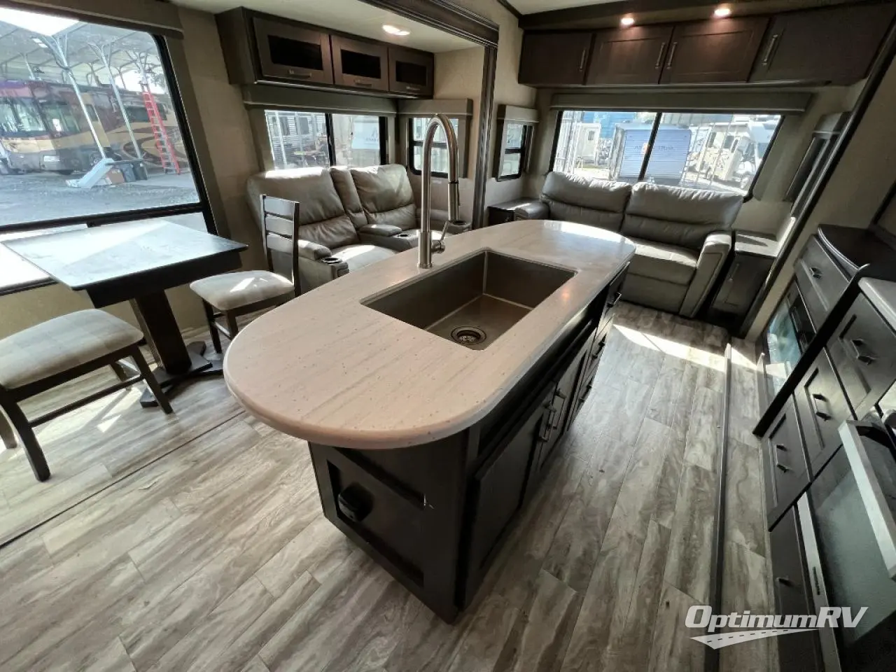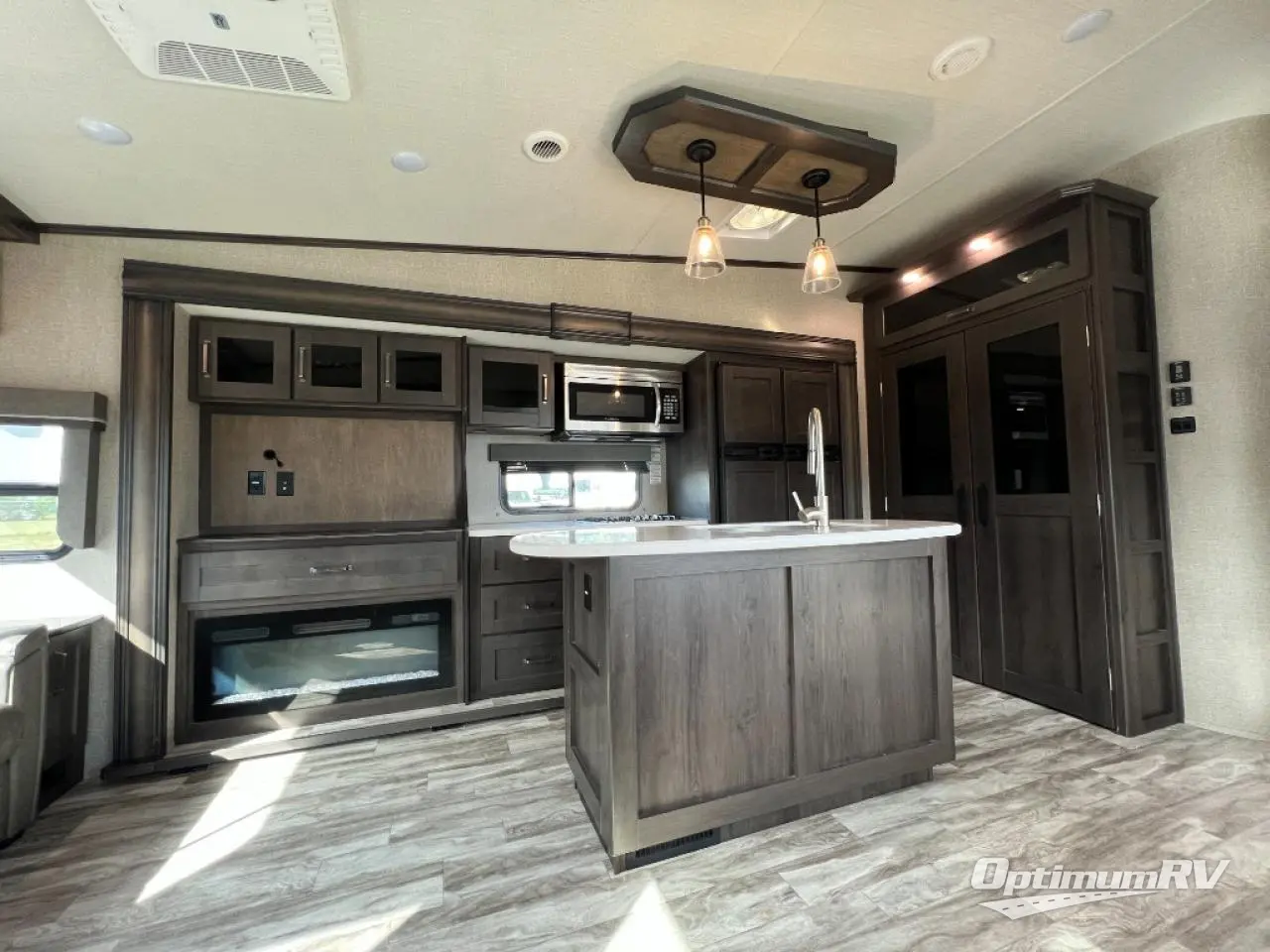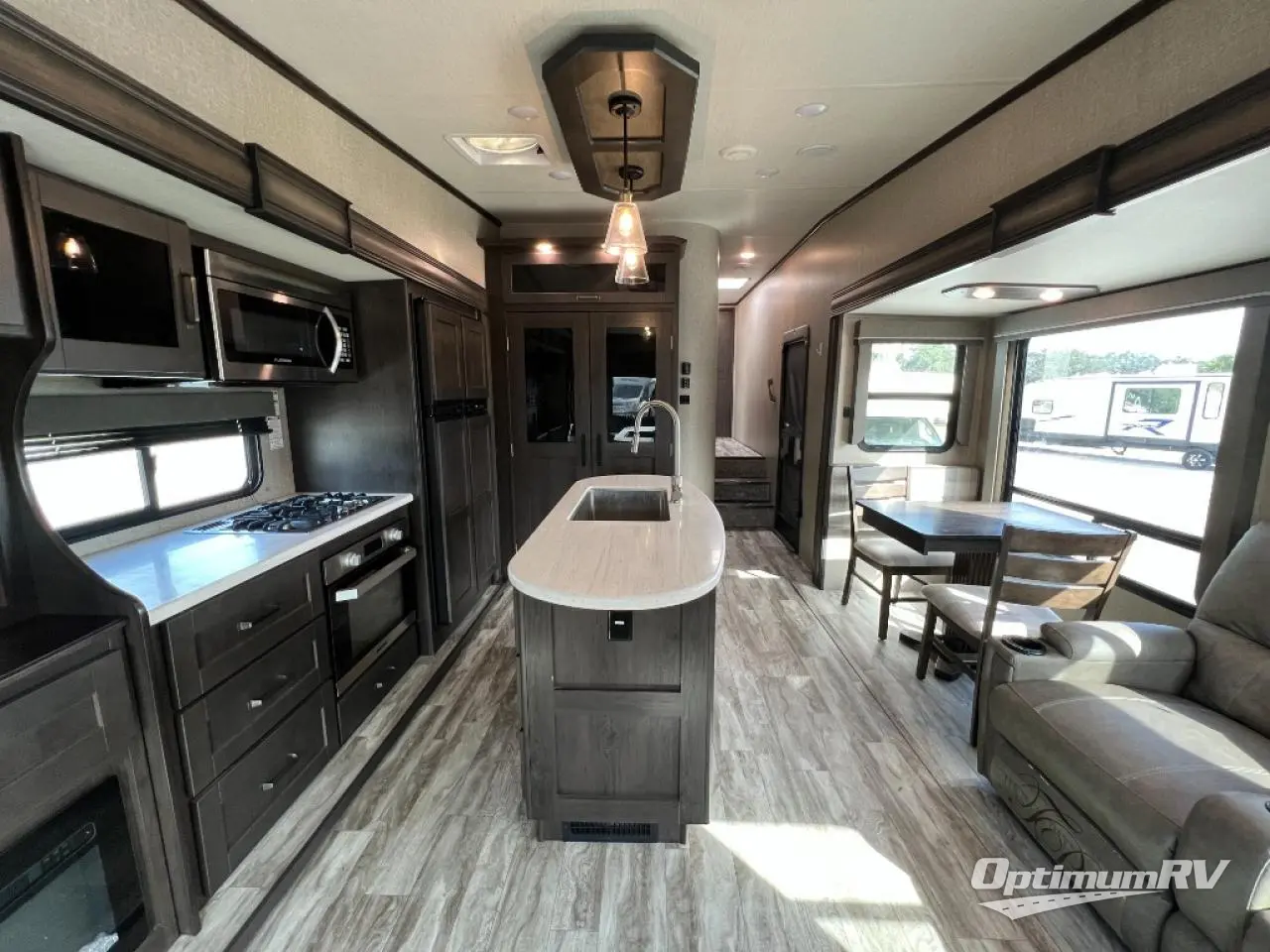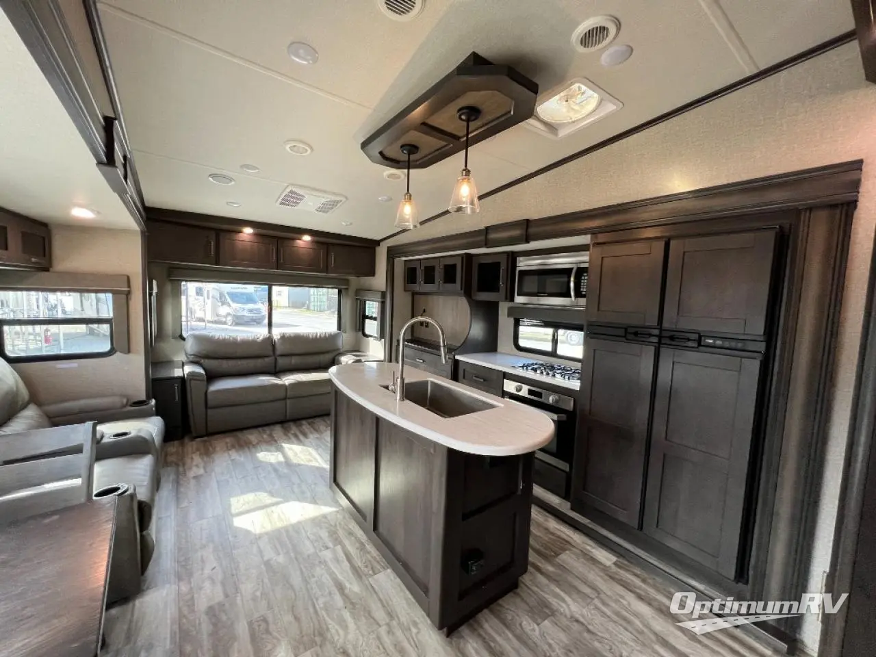 Travel to see new state parks, RV resorts or your family in other states as you tow this fifth wheel to each destination to enjoy comfort and convenience, plus a place to work and be able to offer extra sleeping space for friends and family when they visit! The middle extra room provides a tri-fold sofa slide, a desk, a wardrobe, plus a 64" x 88" upper bed loft area with access from the hallway, which provides two different places to accommodate overnight guests. The full bathroom will keep everyone refreshed, and the front bedroom allows you to sleep on a queen bed slide or choose the king option. And you will love the front wardrobe, the dresser, and the option to add a washer/dryer. The main living and kitchen area provides plenty of seating from the rear tri-fold sofa, the booth dinette or choose the free standing dinette option, and the theatre seats with cupholders. And the kitchen island, the appliances, and the large pantry allow you to take everything you need with you.