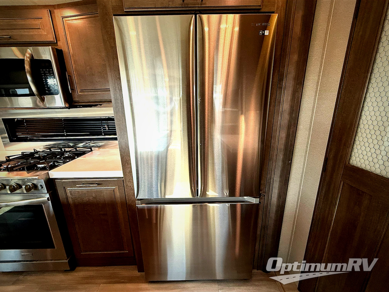 Traveling for long periods at a time is made easy with this kitchen that can feed a group a holiday meal! The professional-grade stainless steel cooktop with built-in oven, the microwave, the stainless steel residential refrigerator and the kitchen island offer everything you will need to enjoy cooking. You will find storage throughout including in the hutch, under the interior steps, and in the front master bedroom. There is a queen bed or choose a king, a pull-out ottoman, a closet prepped for a washer/dryer option, a larger wardrobe, plus a flip-top dresser with LED TV above. And the bathroom includes a shower with a seat and skylight. Plus you can add the exterior pull-out kitchen option to enjoy while relaxing under one of the two power awnings.