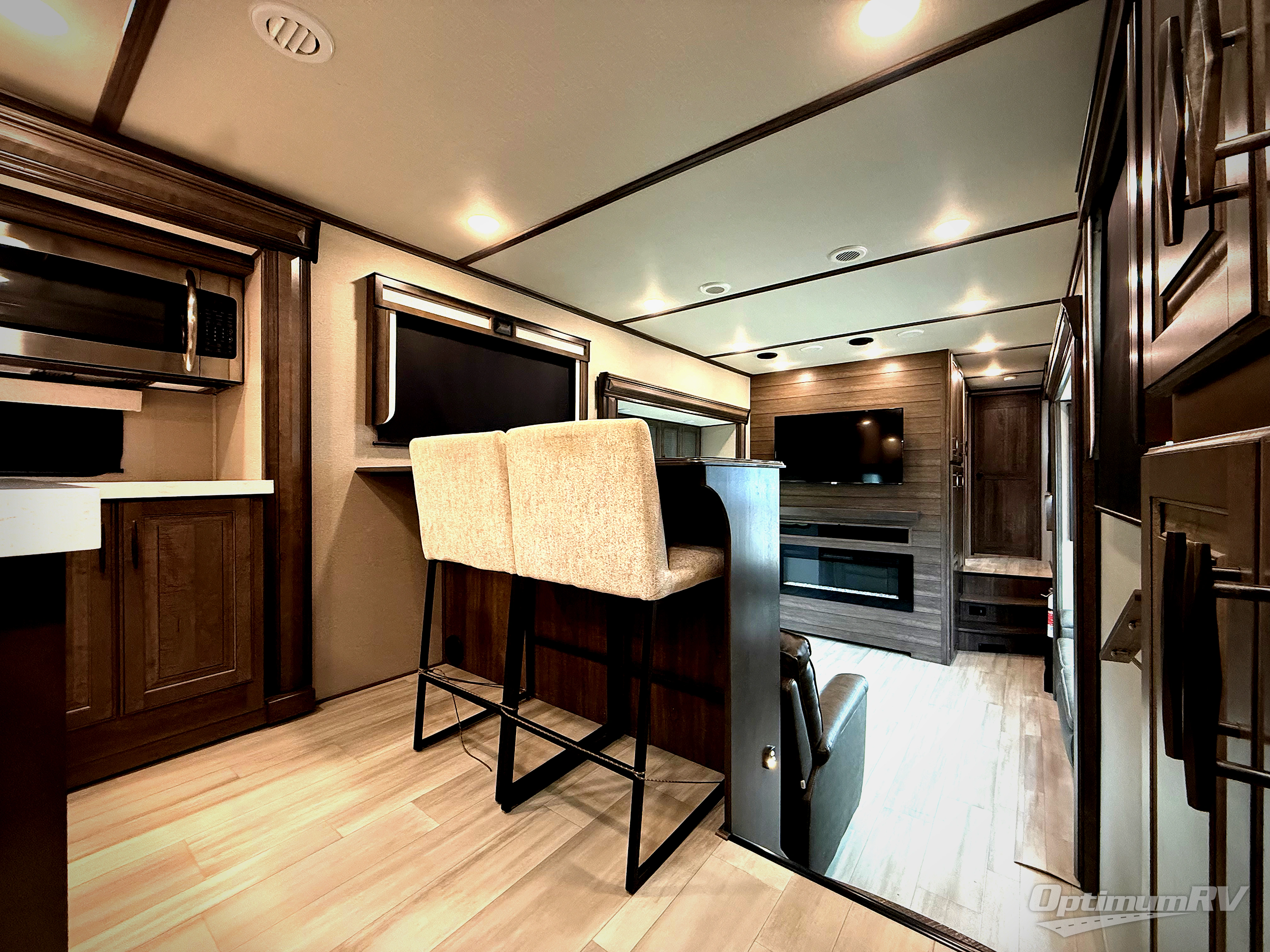 Enjoy each and every vacation, month-long trip or even extended stay at an RV park in this fifth wheel that is spacious from the front to the rear! The raised kitchen gives the cook plenty of room to whip up any type of meal using the stainless steel appliances including the 24" residential oven, the oversized pantry and the raised bar top will provide you even more counter space on top of dining with two chairs that overlook the middle living area. Relaxing is made easy with the two tri-fold sofas and theatre seating while watching the big game on the LED Smart TV and enjoying the fireplace below. Dual sinks in the full bathroom allow two people to easily get ready at once, and the seat in the shower is a nice convenience. At night, retire to your own queen bed slide after sitting on the pull-out ottoman to take your shoes off, and enjoy a show on the LED TV above the flip-top dresser, or wash some linens in the closet with a washer/dryer if you added that option.