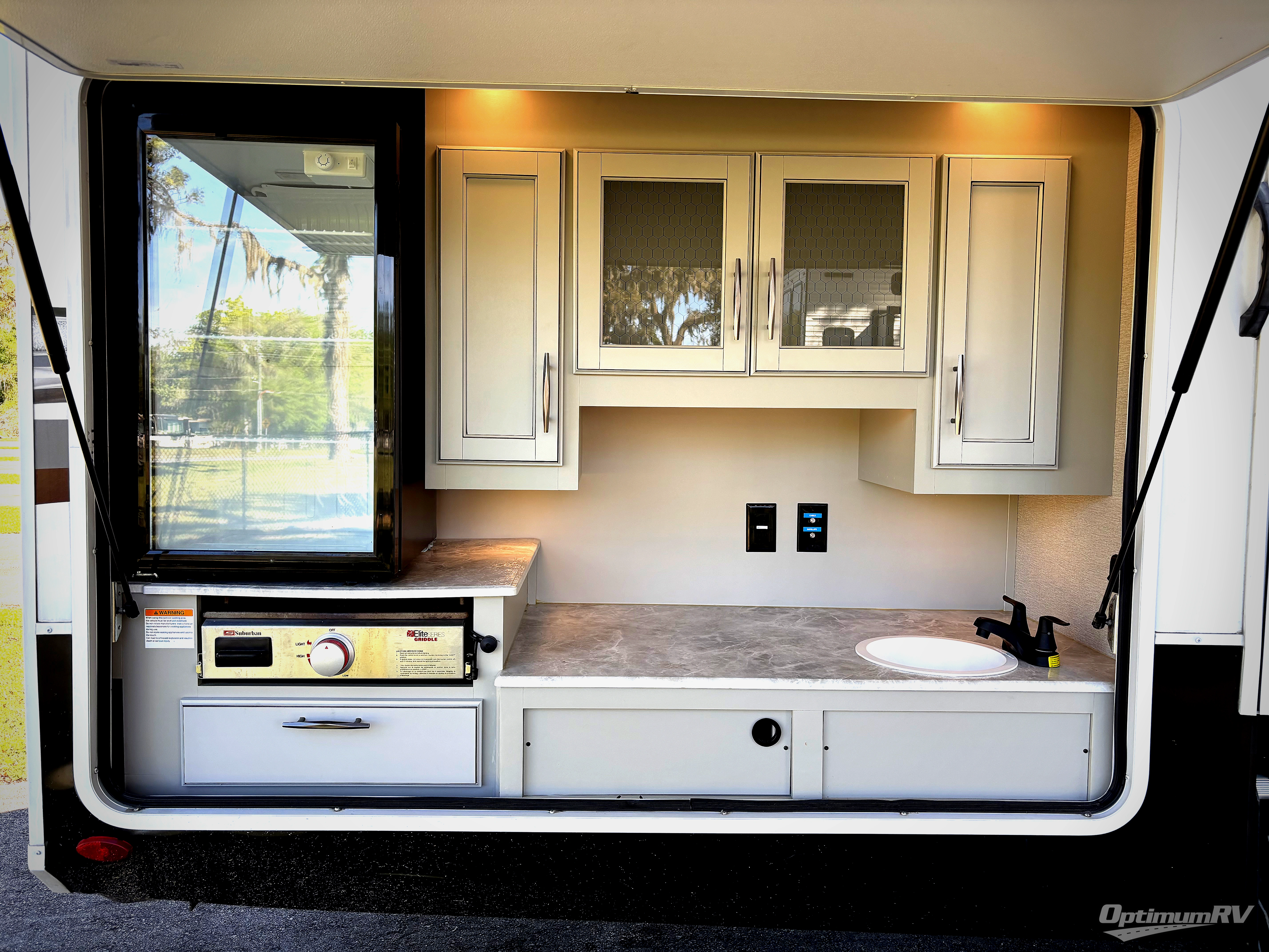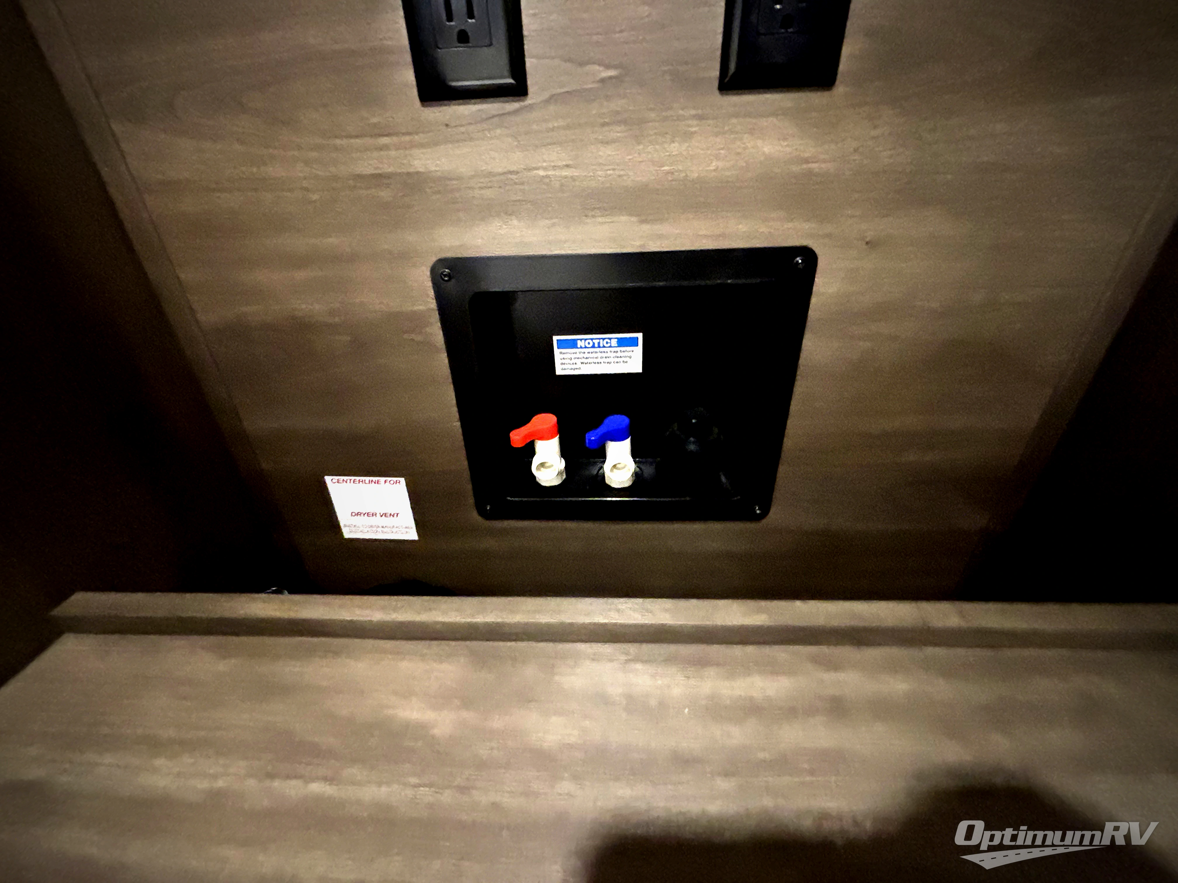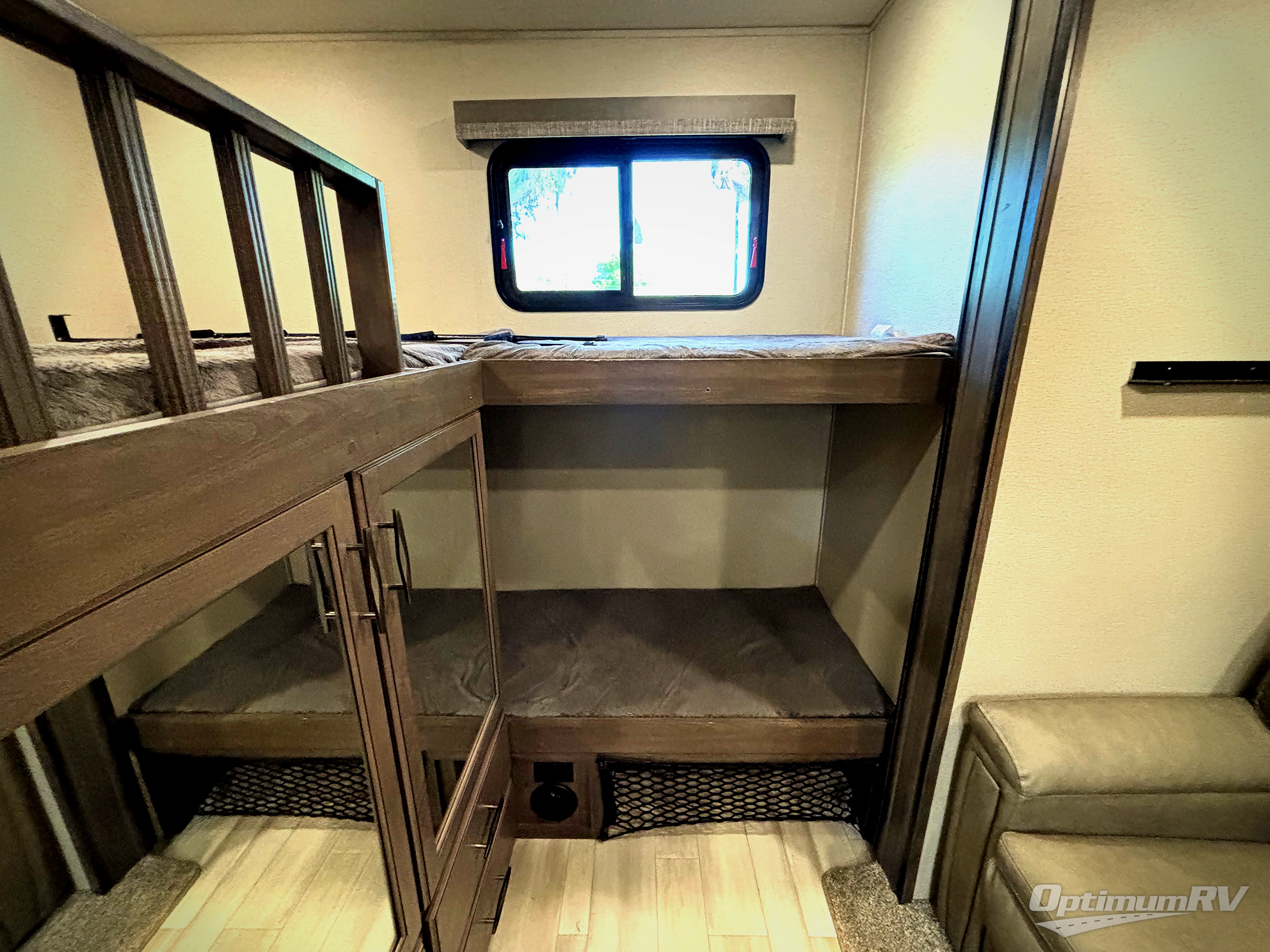 Wow! Check out this fifth wheel with dual entry doors, a private bunkhouse suite, two power awnings, and tons of interior space thanks to the four slide outs! Your guests will have three bunks in the bunkhouse, a tri-fold sofa, plus a convenient half bath with its own exterior entry door. Make yourself at home in the front private bedroom that includes a queen bed that can be optioned out for a king bed, a dresser with an LED TV, plus a large front closet with washer and dryer prep. And don't overlook the main living area/kitchen with theatre seating with USB ports, a kitchen island, plus an LED TV and a fireplace!
