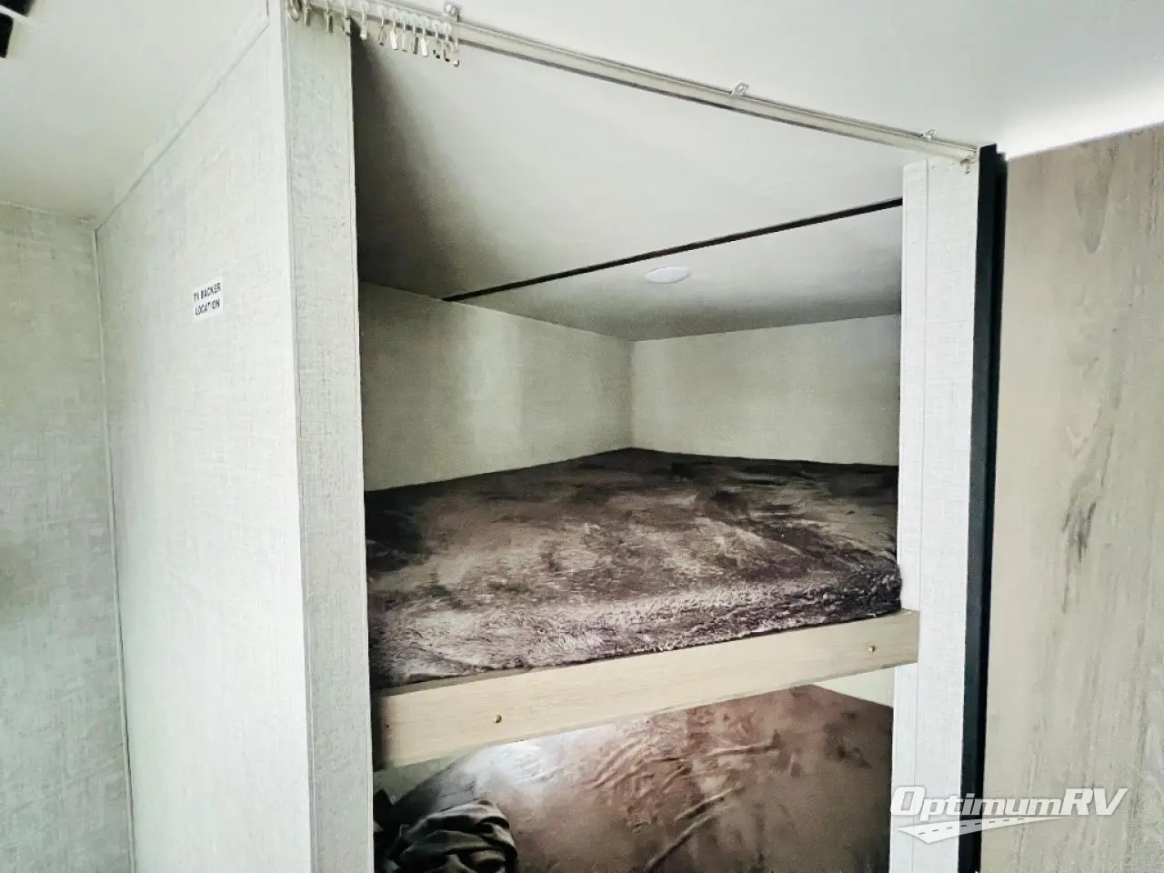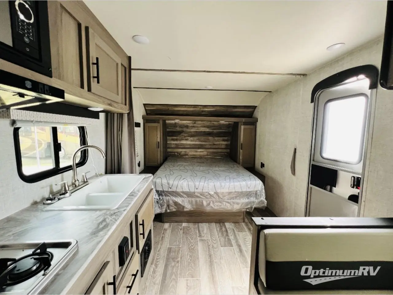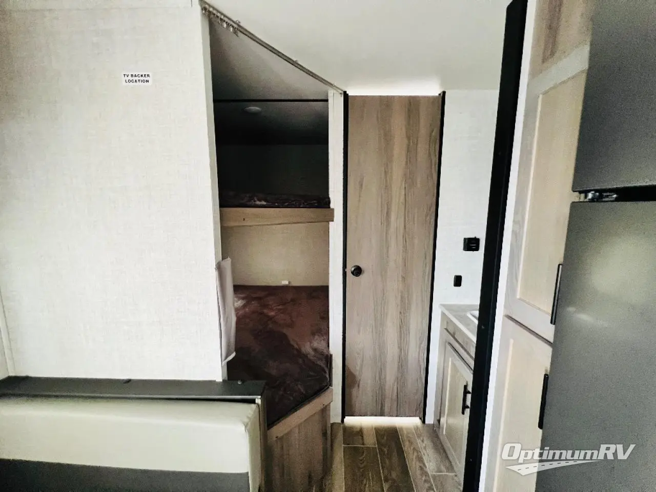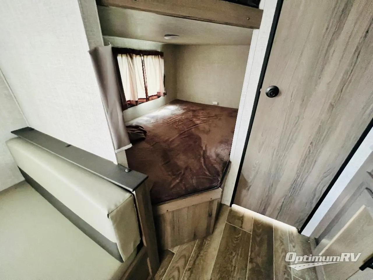 Invite more along with double-size bunks in this travel trailer! The private shower and toilet is close to the bunks if you're camping with little ones, and there is a sink just outside the door so two people can freshen up at once. You and your spouse will get comfortable on the front queen bed, or you can choose the optional Murphy bed to enjoy more seating space during the day. This model includes a booth dinette to dine at each day, or you can sit outside under the electric awning!