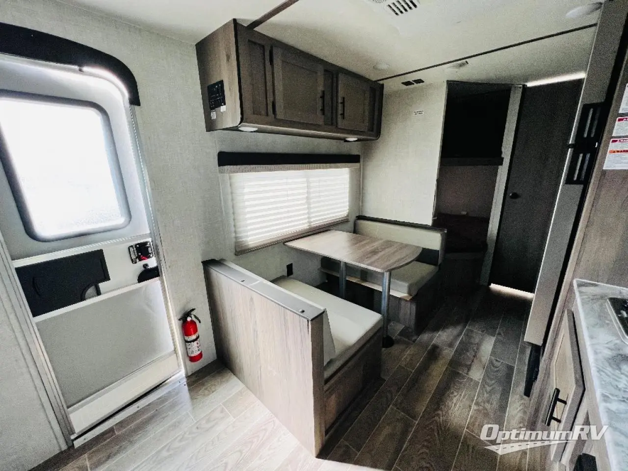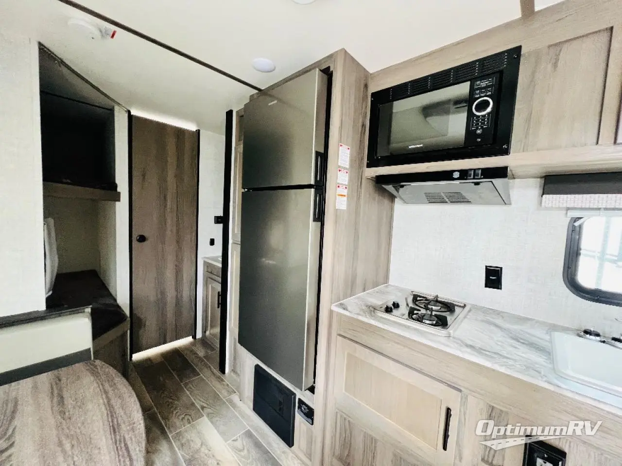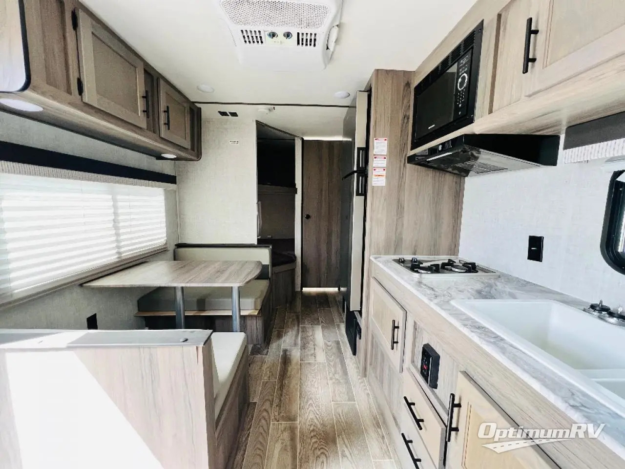 Invite more along with double-size bunks in this travel trailer! The private shower and toilet is close to the bunks if you're camping with little ones, and there is a sink just outside the door so two people can freshen up at once. You and your spouse will get comfortable on the front queen bed, or you can choose the optional Murphy bed to enjoy more seating space during the day. This model includes a booth dinette to dine at each day, or you can sit outside under the electric awning!