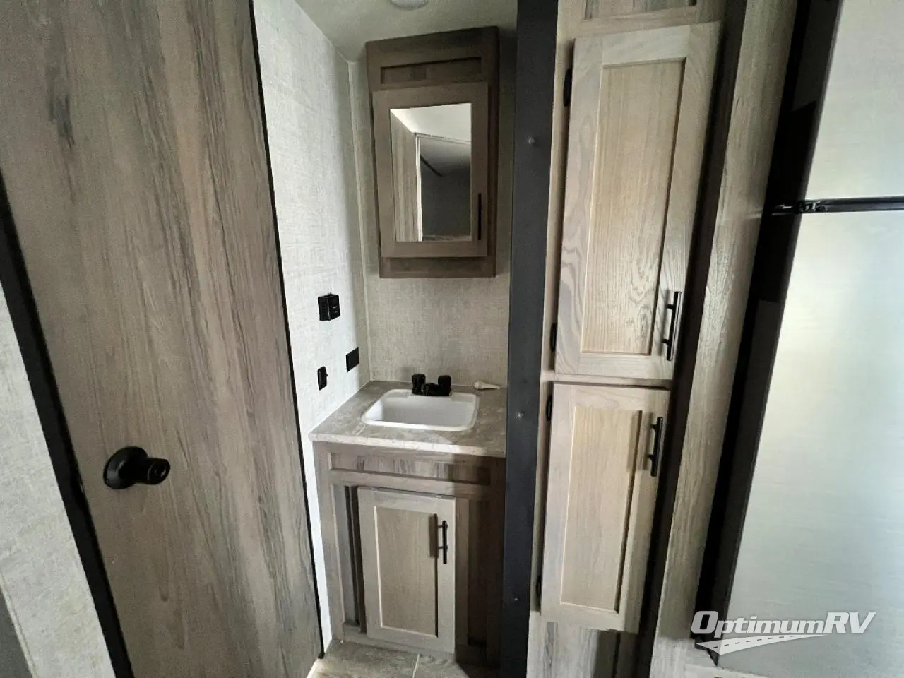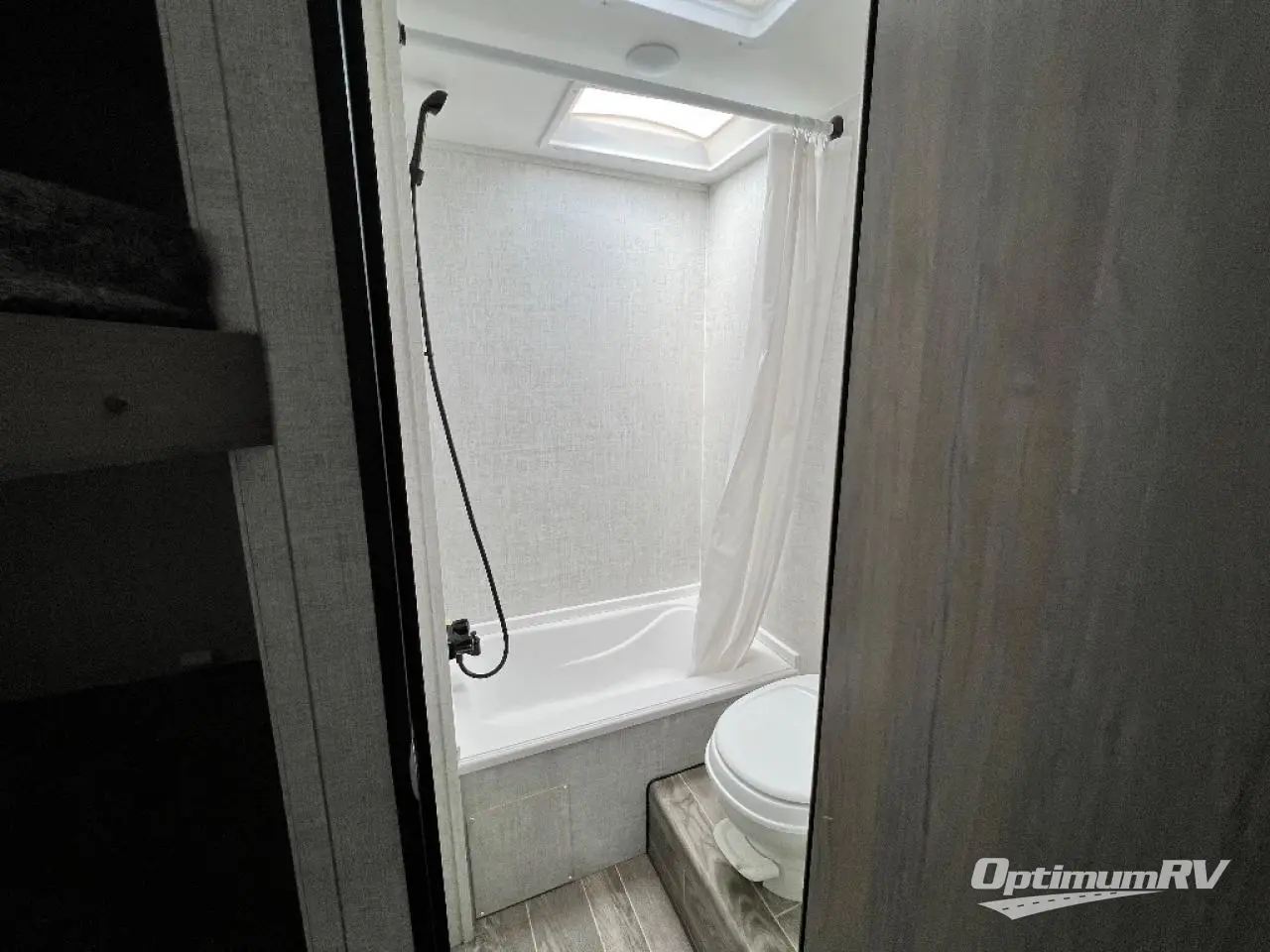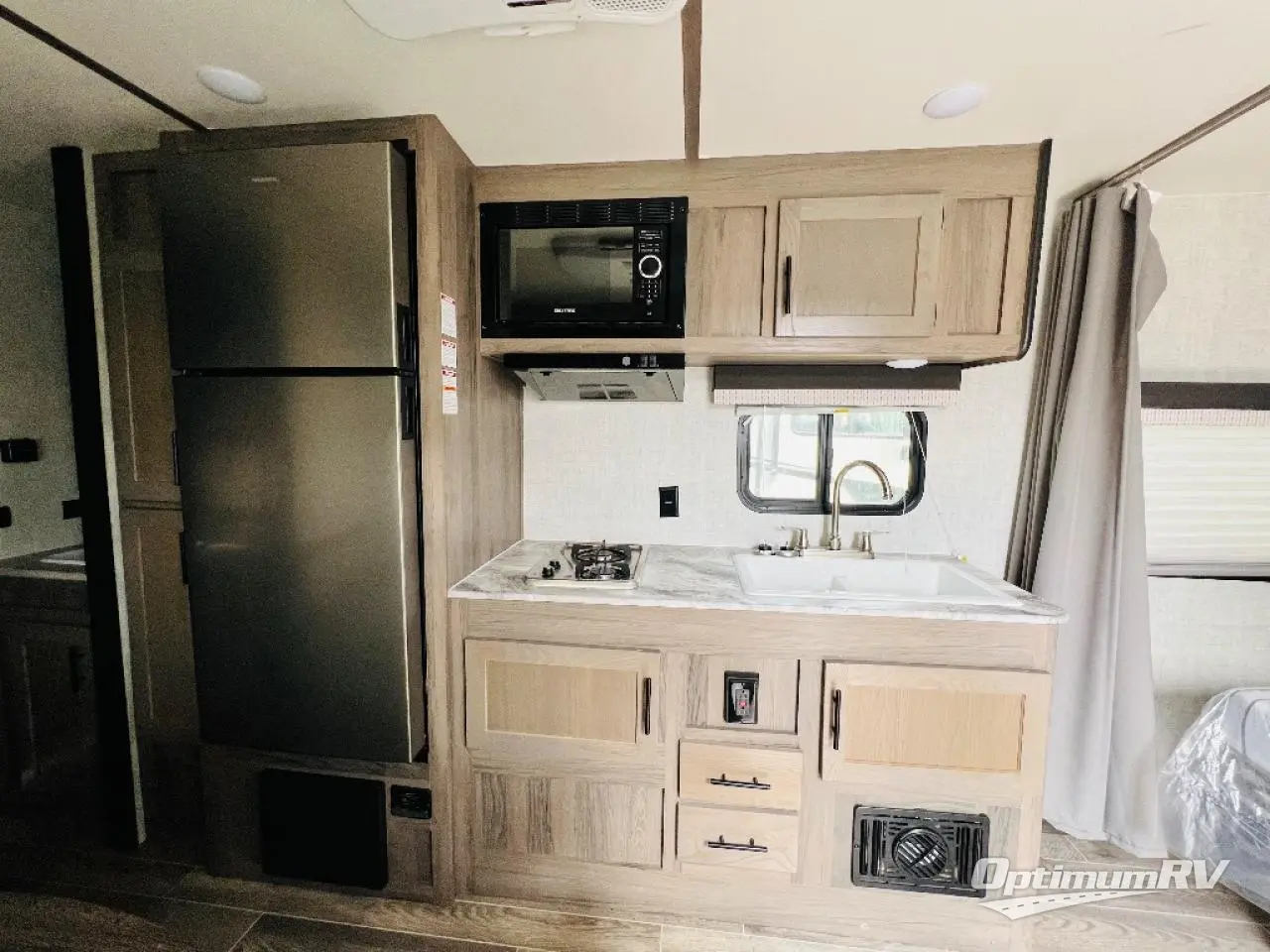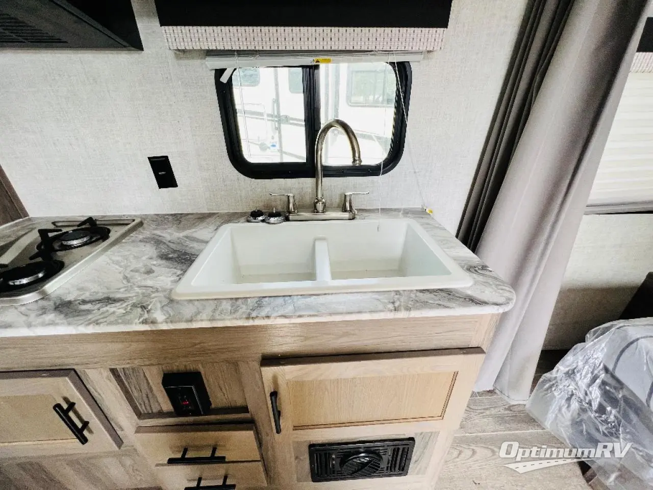 Invite more along with double-size bunks in this travel trailer! The private shower and toilet is close to the bunks if you're camping with little ones, and there is a sink just outside the door so two people can freshen up at once. You and your spouse will get comfortable on the front queen bed, or you can choose the optional Murphy bed to enjoy more seating space during the day. This model includes a booth dinette to dine at each day, or you can sit outside under the electric awning!