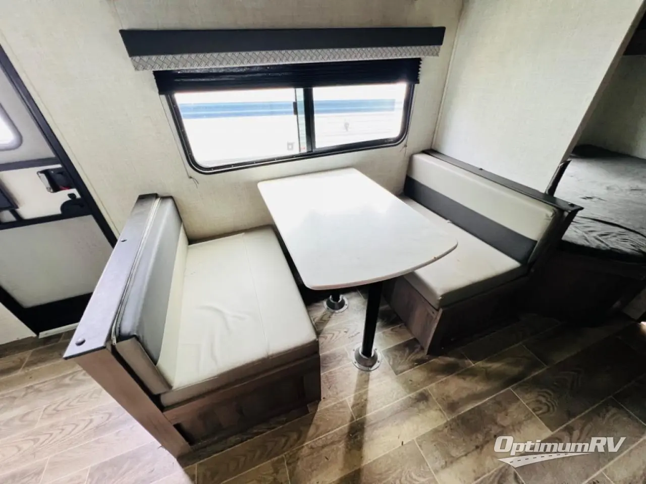 Invite more along with double-size bunks in this travel trailer! The private shower and toilet is close to the bunks if you're camping with little ones, and there is a sink just outside the door so two people can freshen up at once. You and your spouse will get comfortable on the front queen bed, or you can choose the optional Murphy bed to enjoy more seating space during the day. This model includes a booth dinette to dine at each day, or you can sit outside under the electric awning!