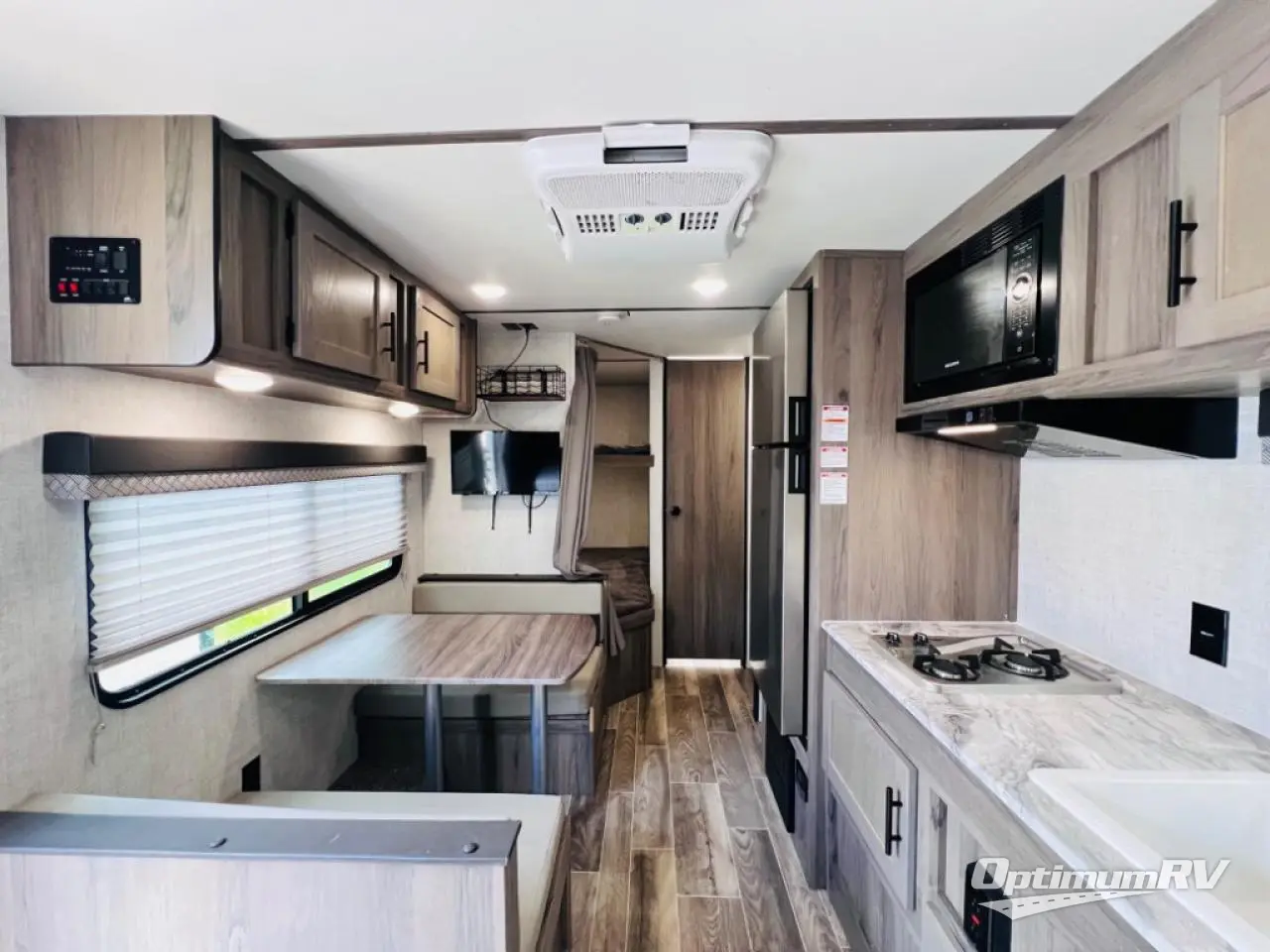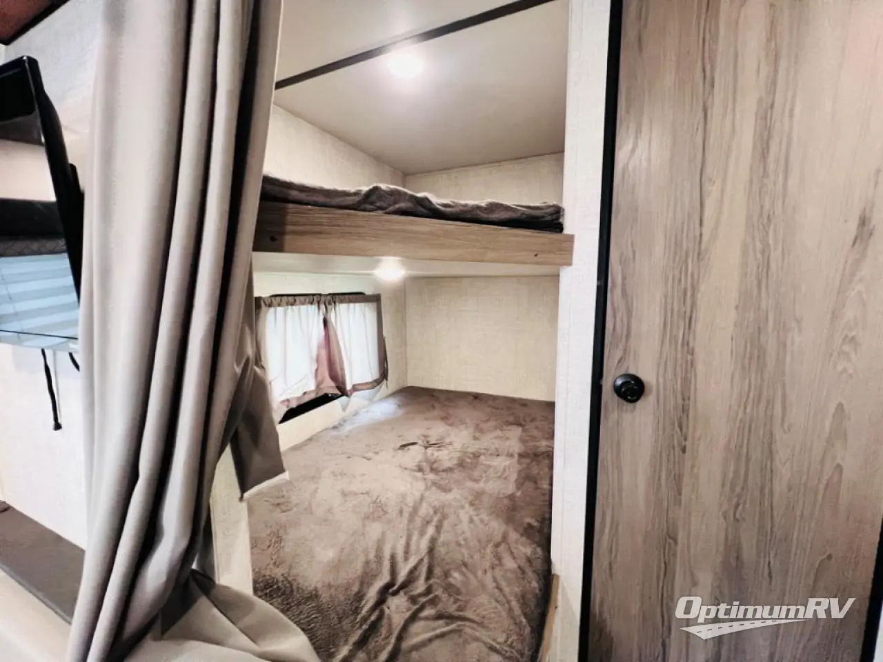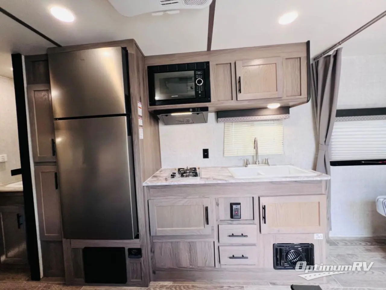 This semi-private front bedroom travel trailer allows you to change in privacy when you close the curtain and sleep on a queen-size bed or choose the optional Murphy bed/sofa for versatility. You will find your own wardrobe and a handy shelf at the head of the bed for your belongings. Your friends or kids will loving sleeping on the double-size bunks in the rear next to the private toilet and tub/shower room. The bathroom sink is just outside the door which is handy when two people need to get ready at once. And the cook will have full amenities, plus a pantry, and overhead storage for all the dishes, pots, and spices.