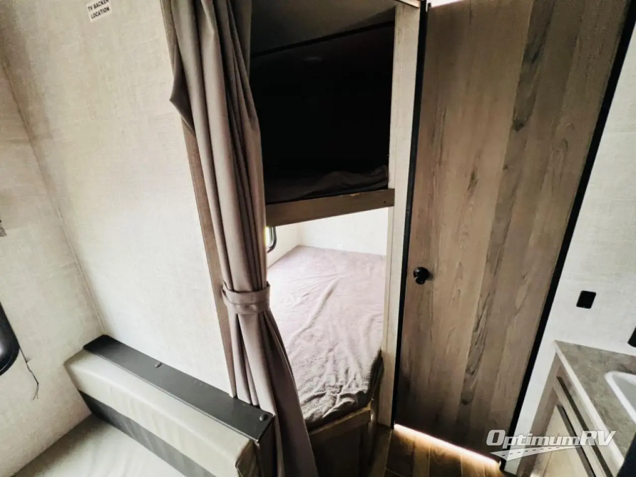 This semi-private front bedroom travel trailer allows you to change in privacy when you close the curtain and sleep on a queen-size bed or choose the optional Murphy bed/sofa for versatility. You will find your own wardrobe and a handy shelf at the head of the bed for your belongings. Your friends or kids will loving sleeping on the double-size bunks in the rear next to the private toilet and tub/shower room. The bathroom sink is just outside the door which is handy when two people need to get ready at once. And the cook will have full amenities, plus a pantry, and overhead storage for all the dishes, pots, and spices.