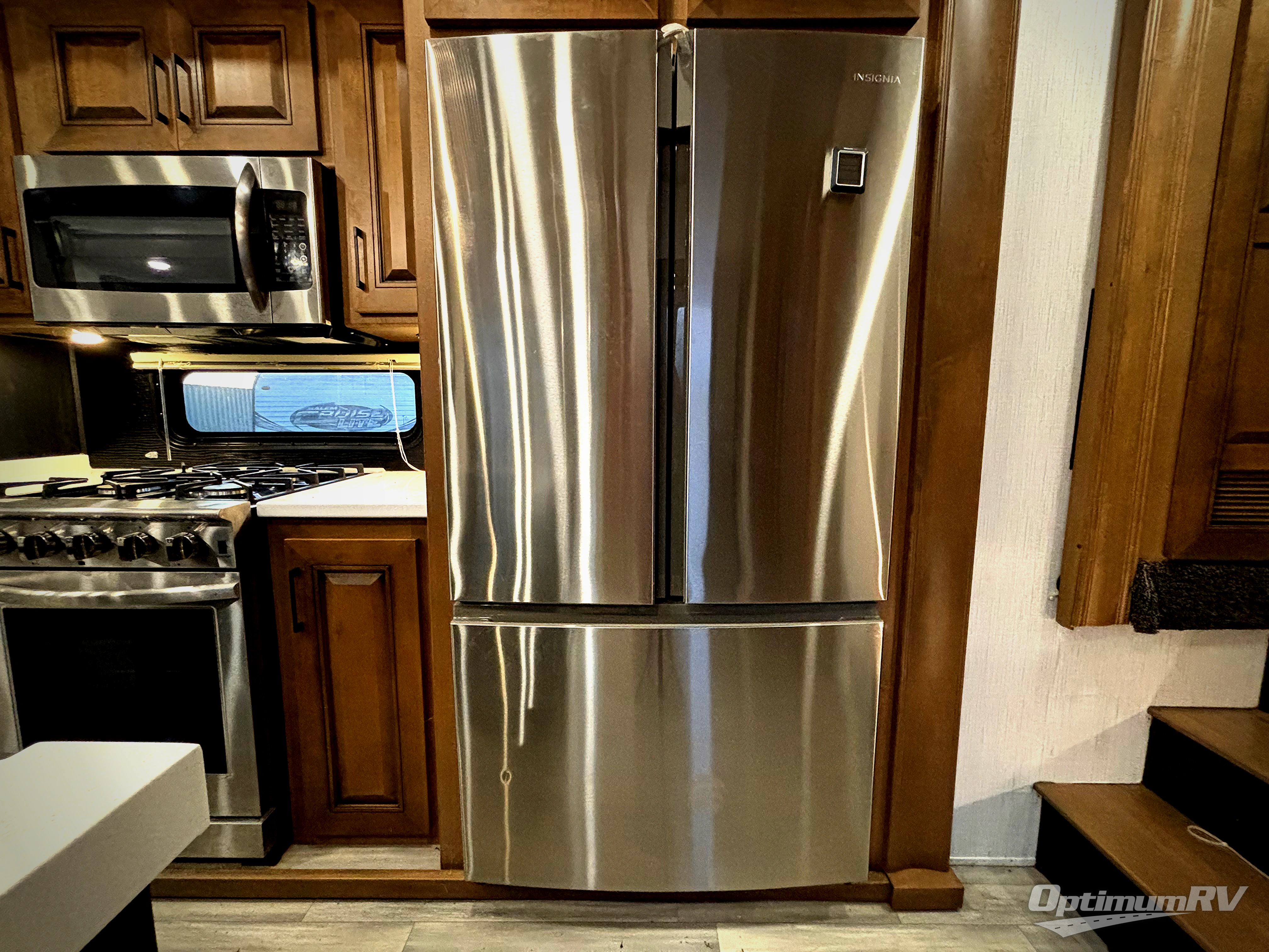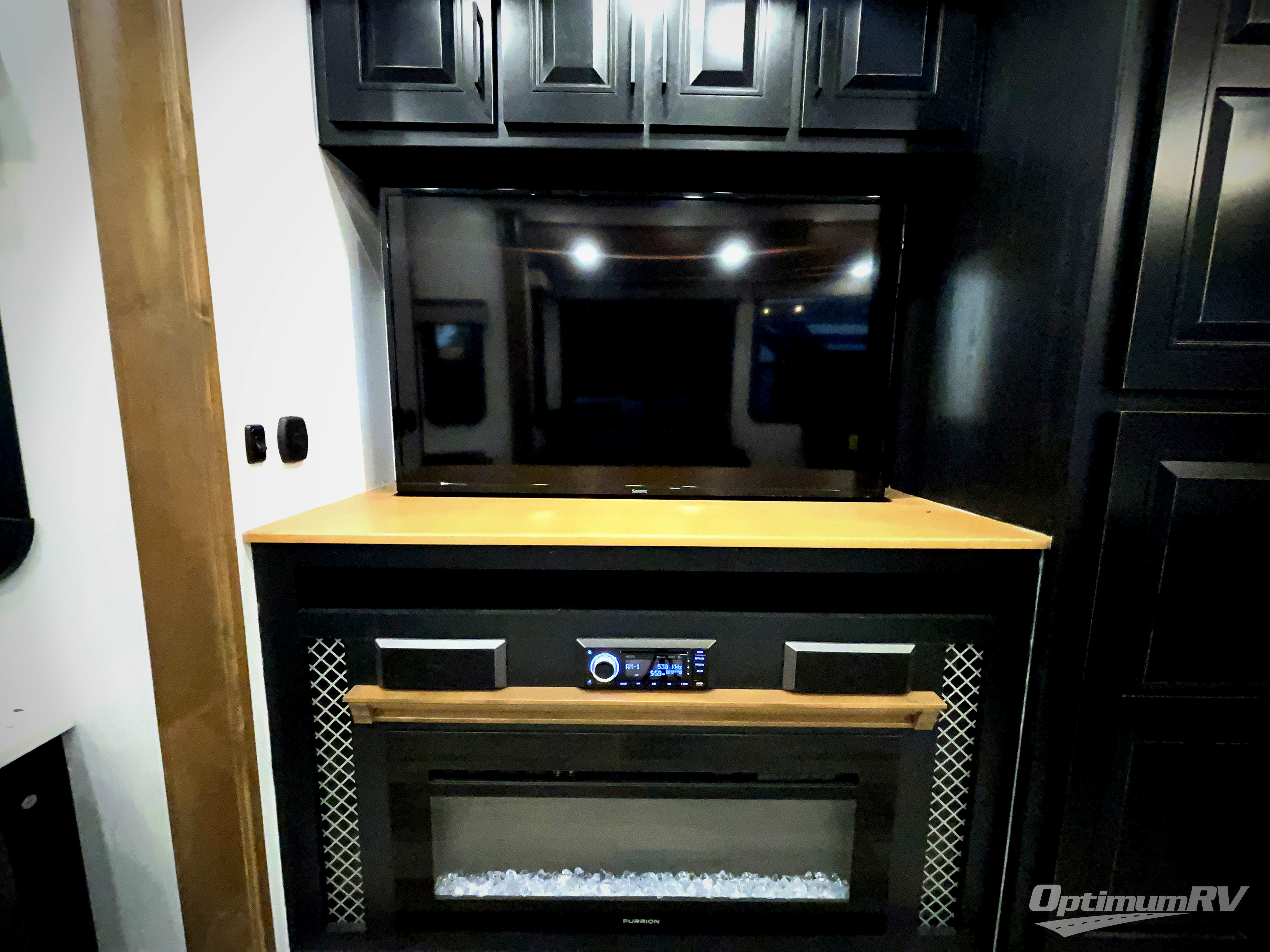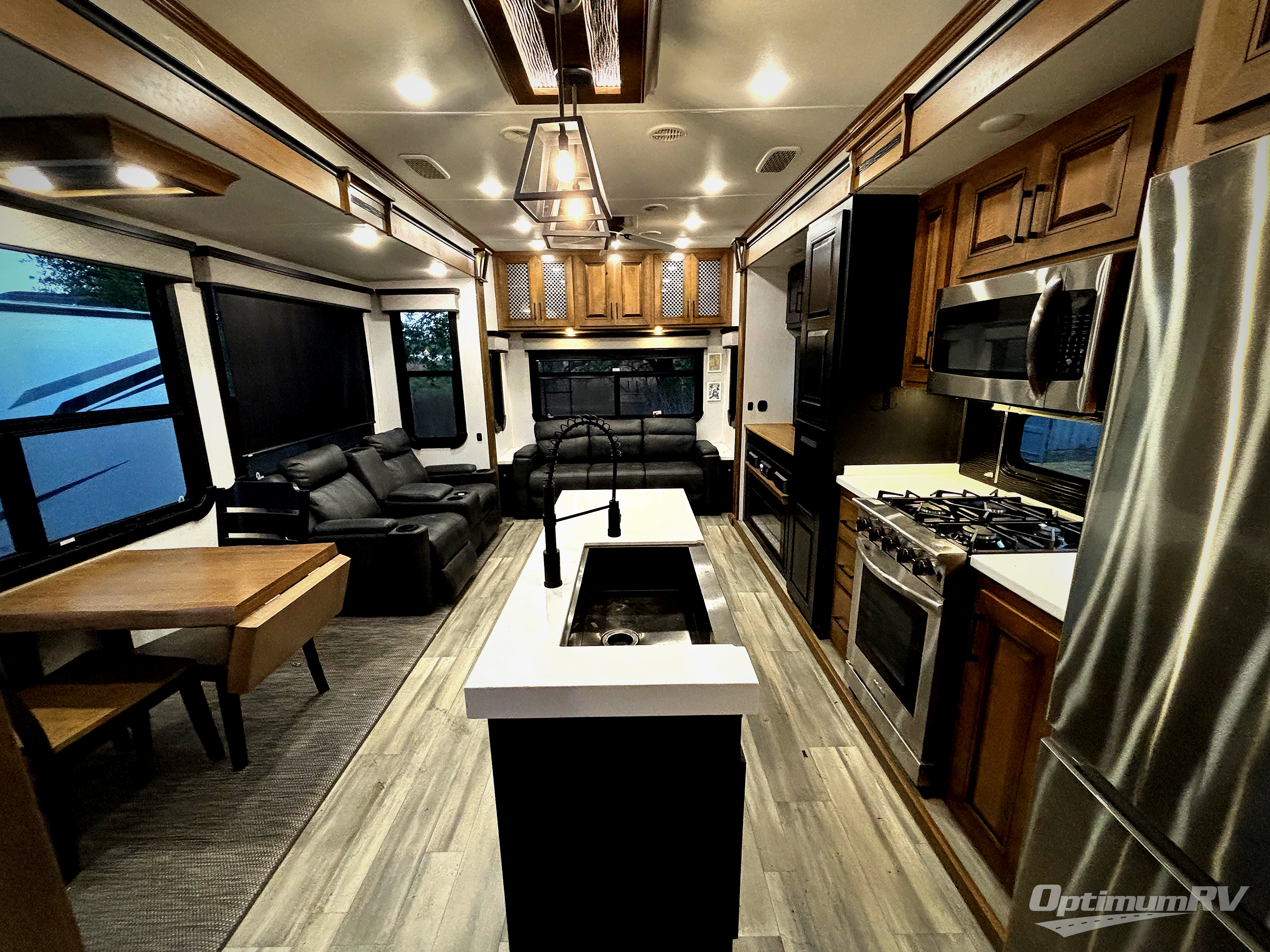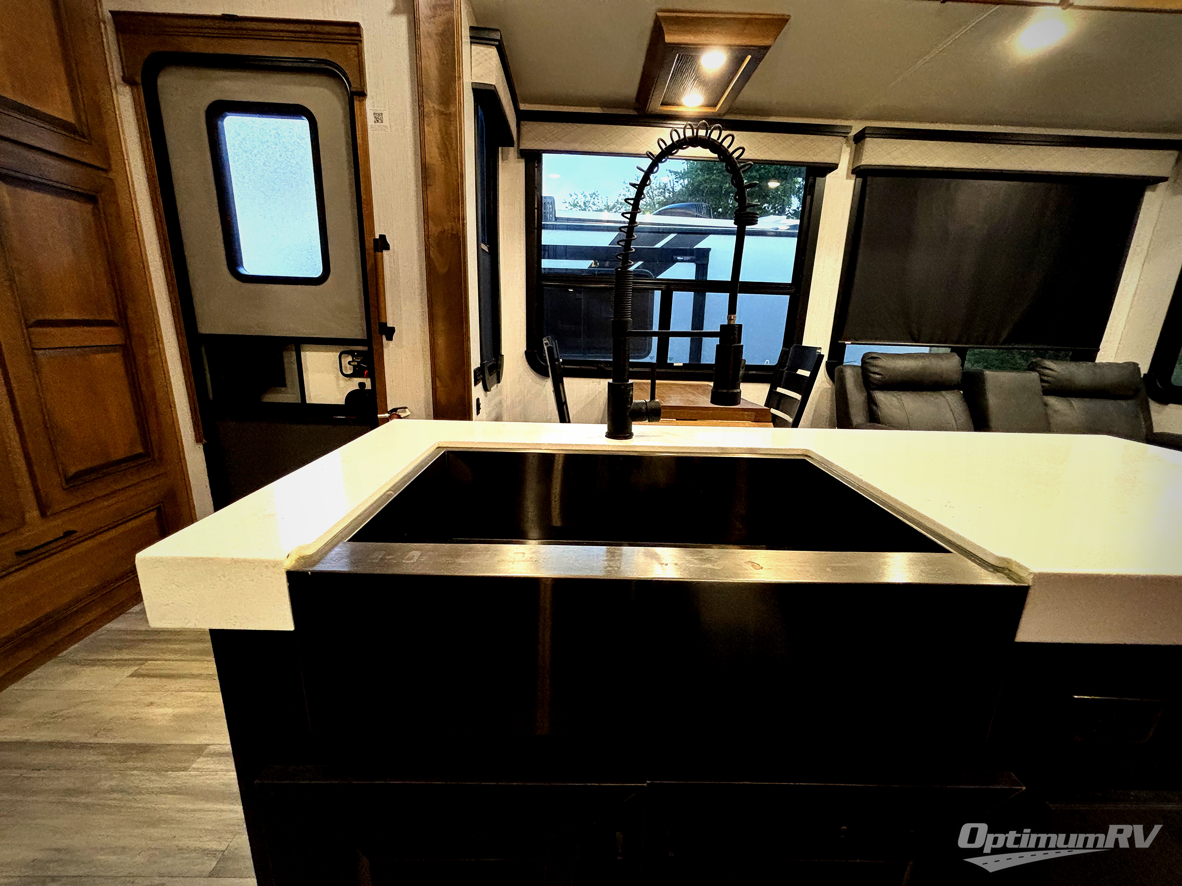 This triple slide fifth wheel offers lots of interior living space to unwind after a long work week! The dual slides in the main living and kitchen area allow you to entertain your friends and family by offering them seating on the power theater seats with heat and massage, the upgraded flip and fold sleeper sofa and/or at the live edge dinette table with two standard chairs and two folding. The kitchen island gives you a great place to prepare and serve meals and the single basin sink is easy to use. The large pantry allows you to stock up on goodies, and the double entry bathroom is convenient. There is a hallway closet prepped for a washer/dryer option, and the front bedroom provides plenty of clothing storage and a tilting king bed for the perfect setting when relaxing or sleeping.