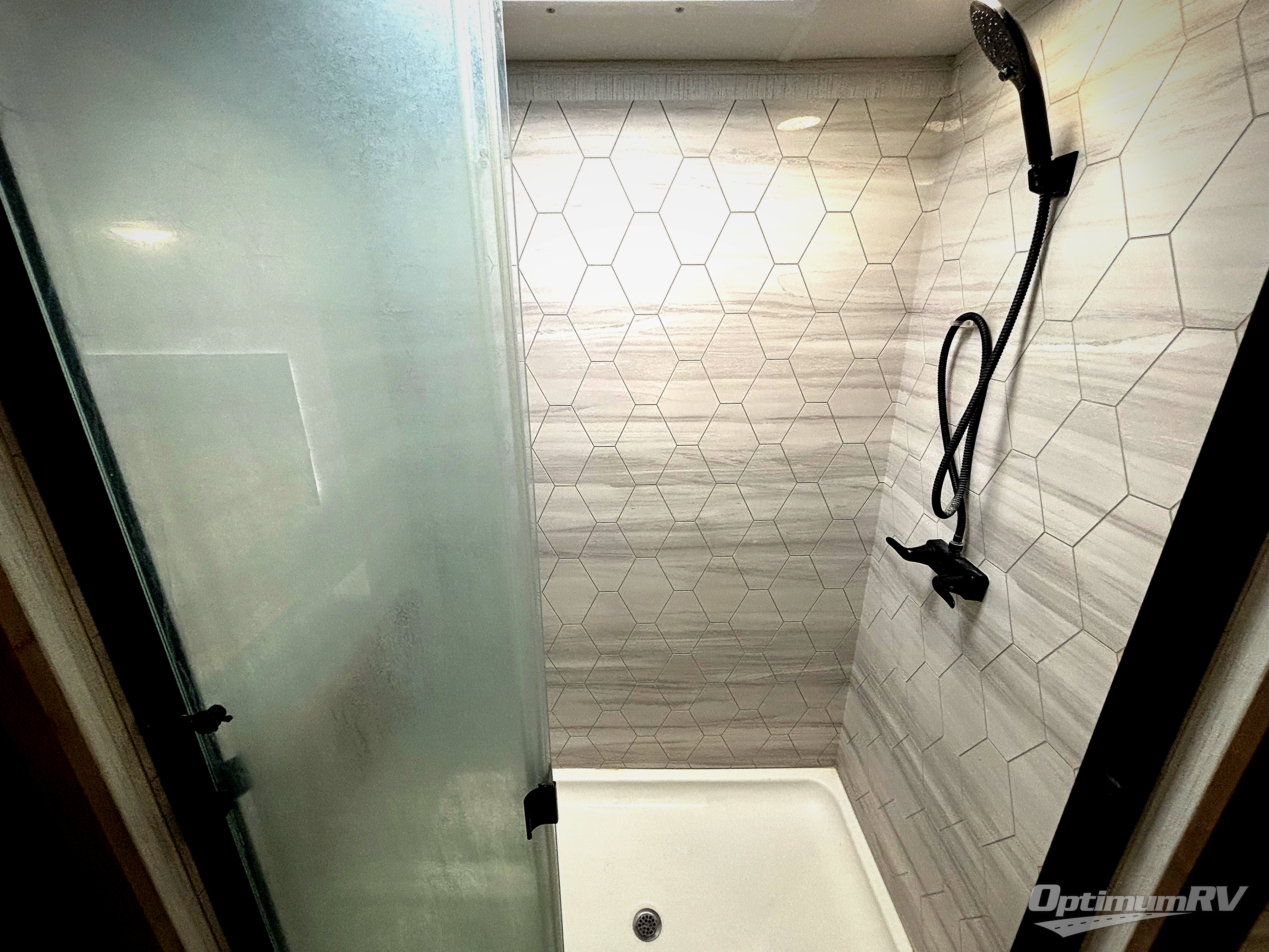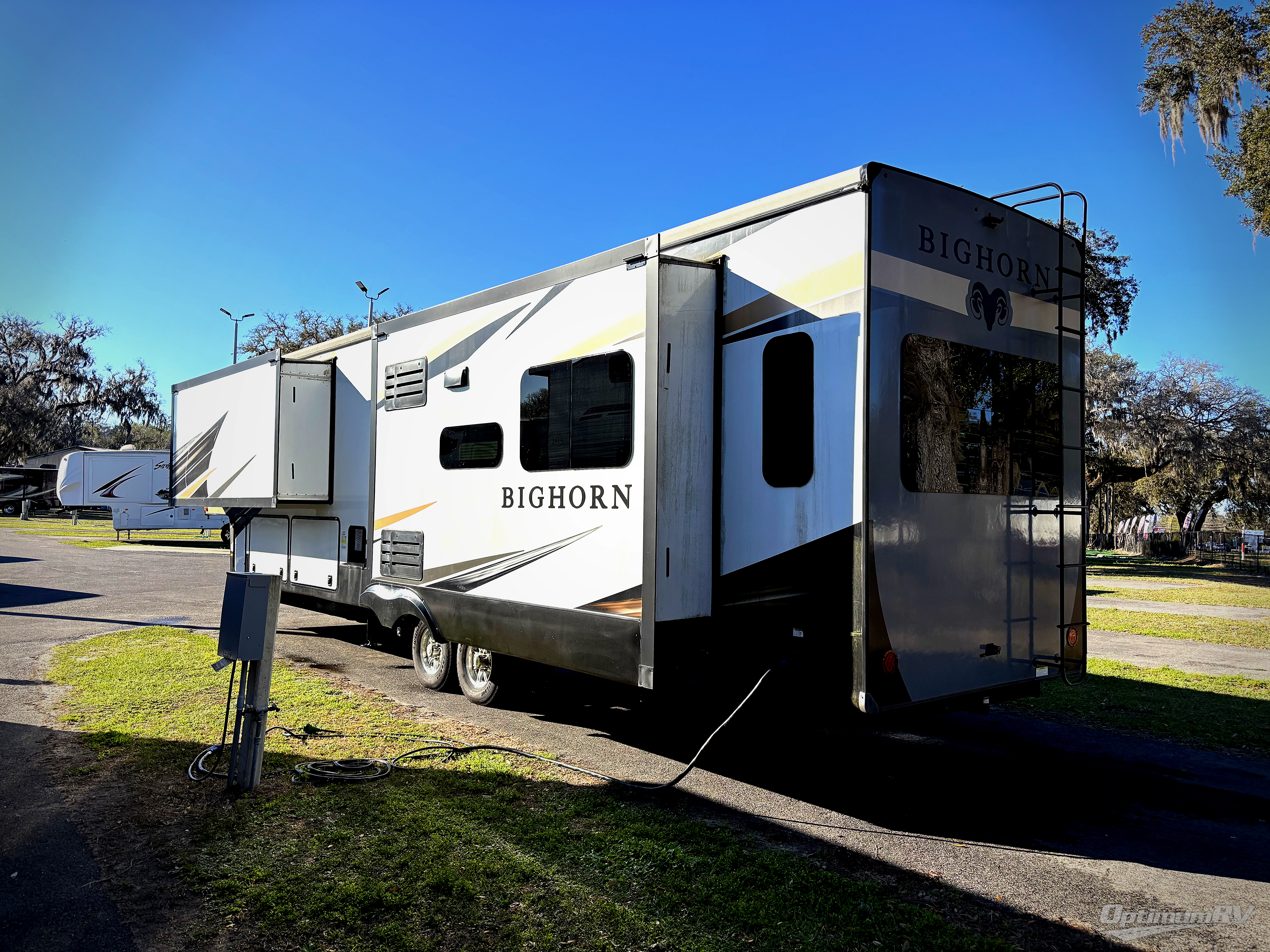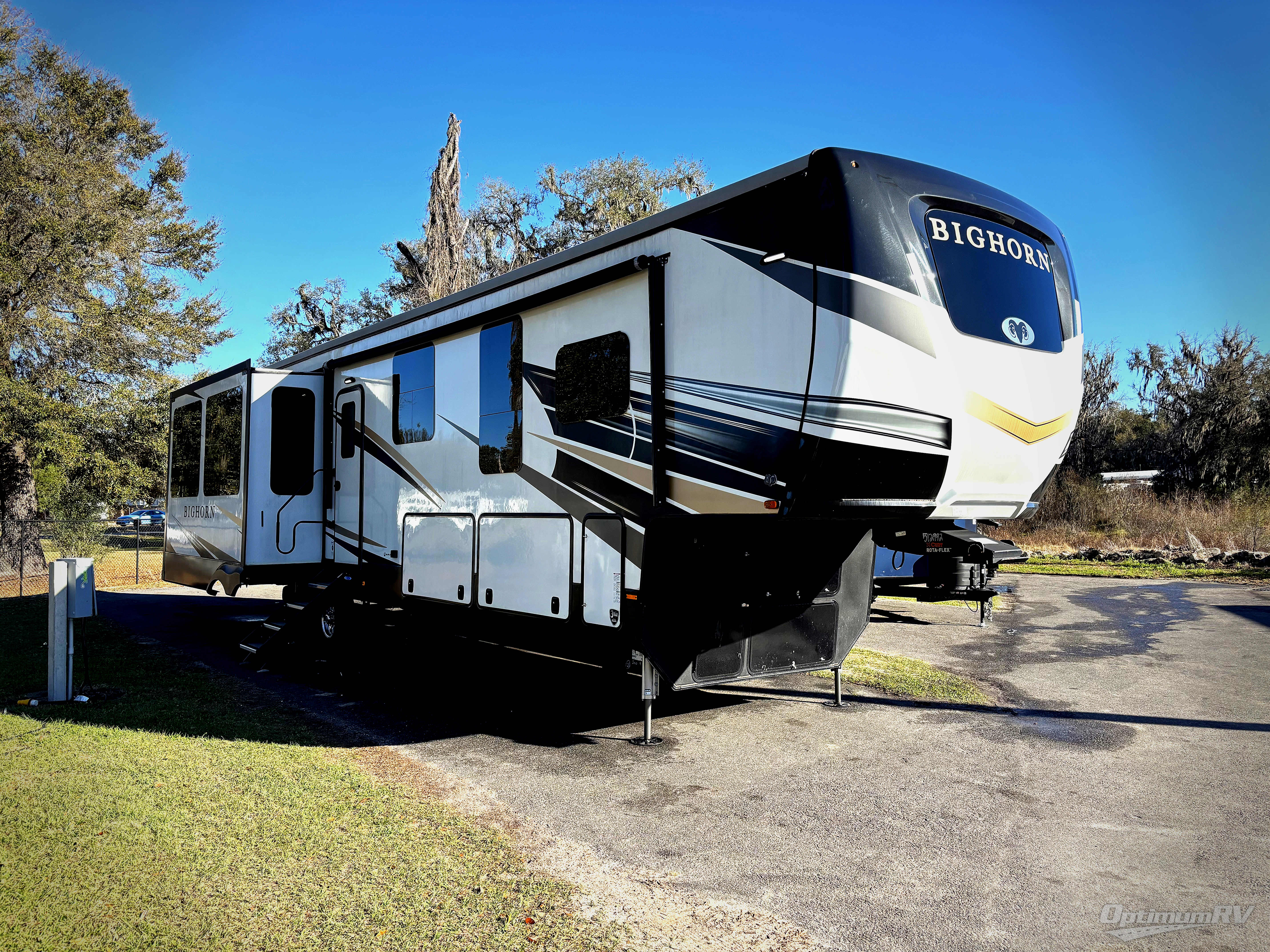 When you camp, you don't have to give up your spacious bathroom and bedroom you are accustom to having when you have this Bighorn! The extended slide in the bedroom stretches to the bathroom, plus you have double entry from either the front bedroom or the hallway. The shower includes a teak seat, and the bathroom closet allows you to hang clothes as well as choose a washer/dryer option for the prepped space. There is more storage for linens, toiletries and such. The front bedroom gives you unique front wall seating with a window, overhead cabinets, and drawer storage plus counter tops to place your phone, books and even display photos and decor. The kitchen and living area is spacious with dual slide outs, and the cook will love the island, the pantry, the residential refrigerator and the four-burner cooktop. The power theater seats with heat and massage as well as the upgraded flip and fold sleeper sofa, and the live edge dinette table with chairs, are just more reasons you will love this RV!