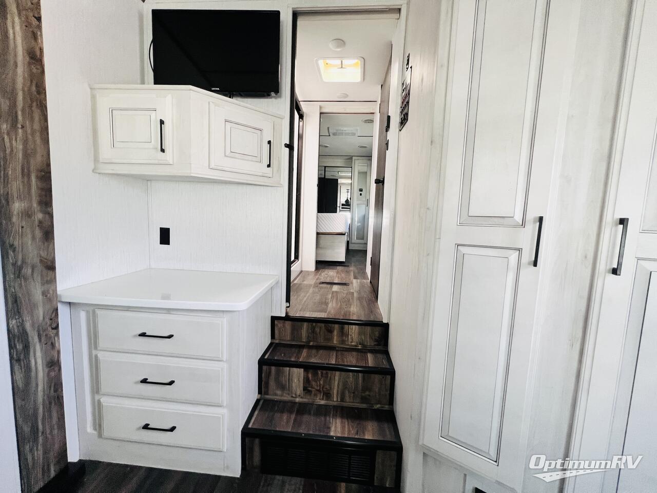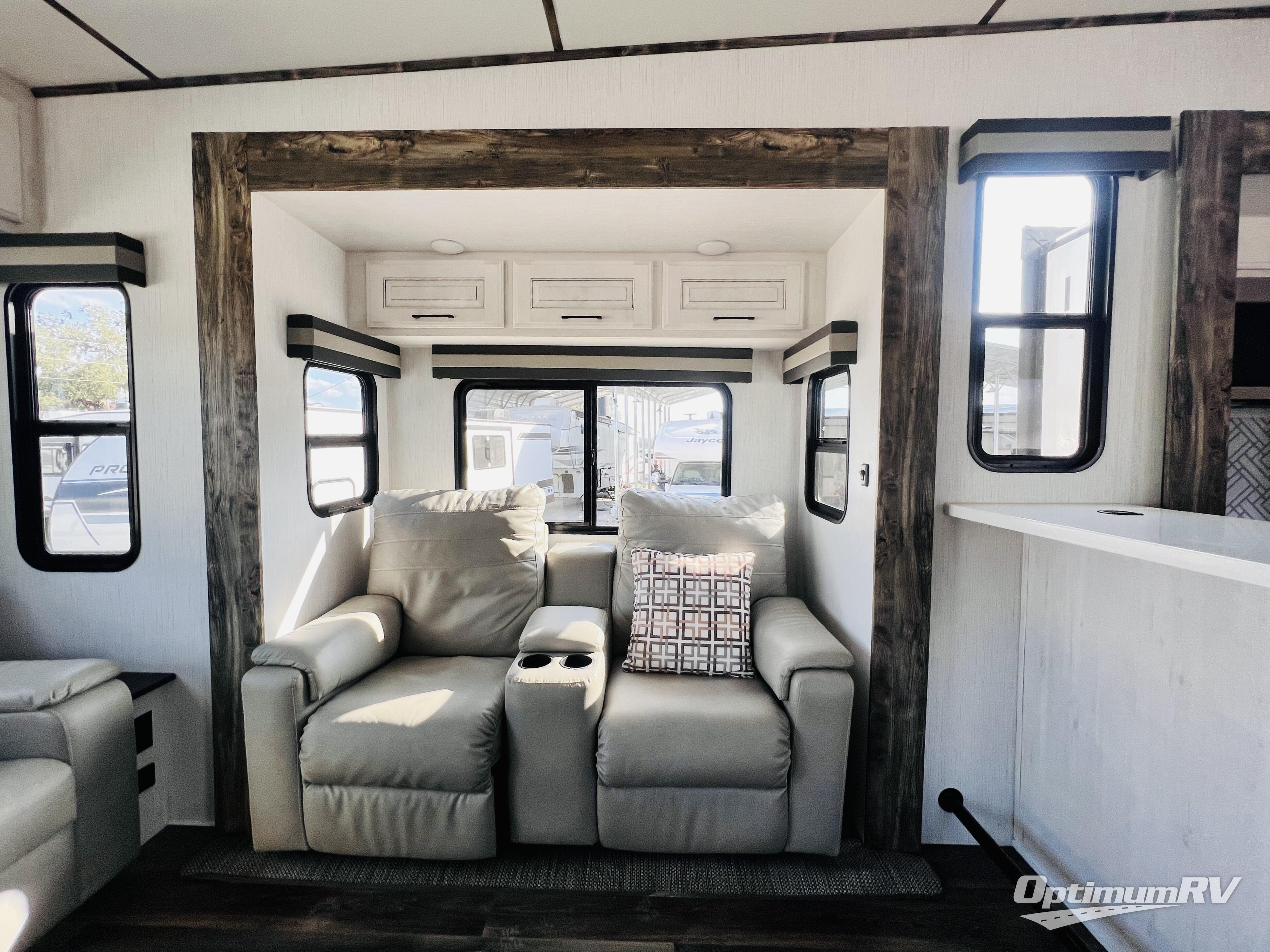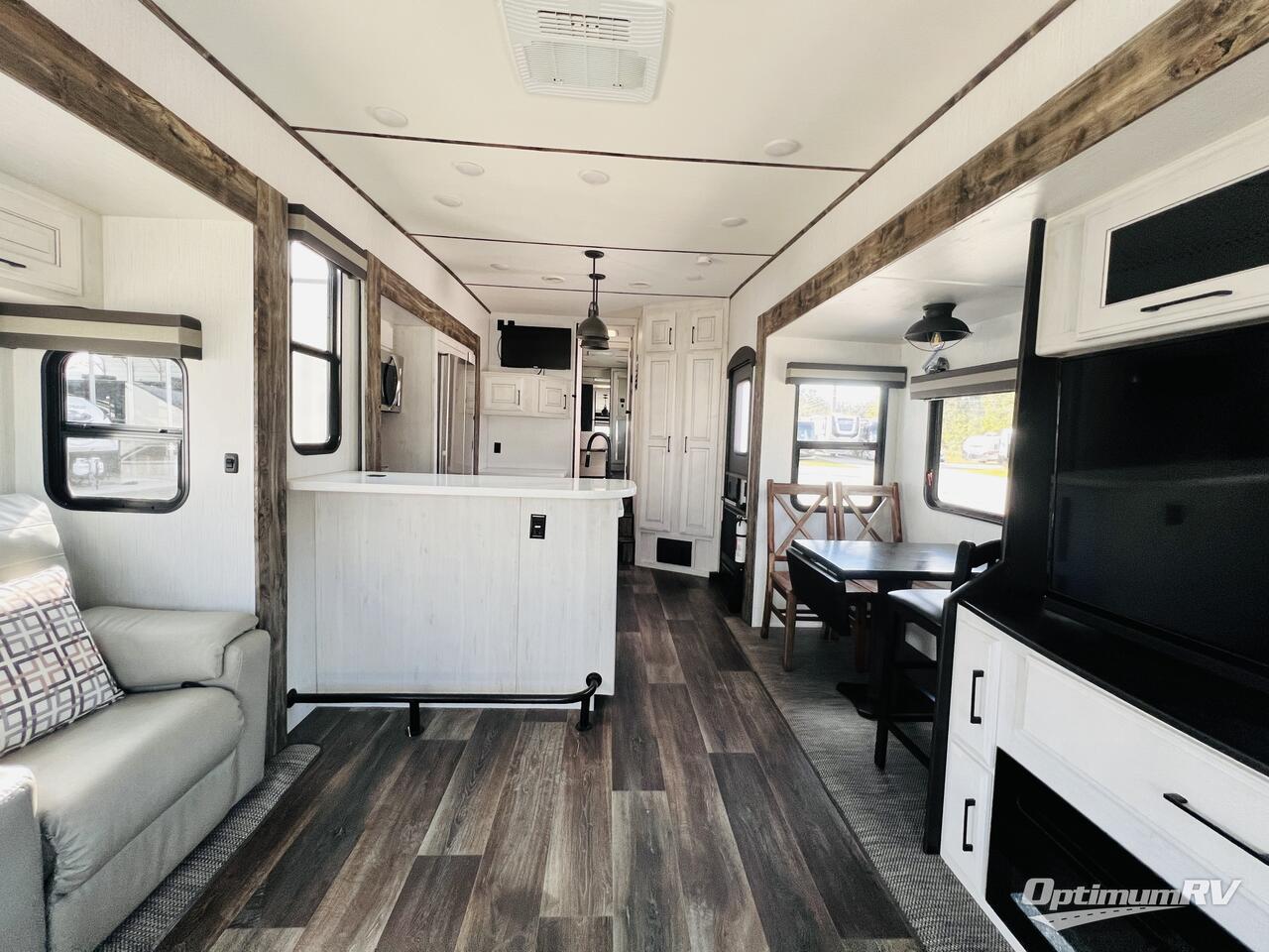 One look at this fifth wheel and you'll be hooked! The kitchen is sure to be a hangout spot with its bar with stools and island peninsula, plus this model includes an outside kitchen if everyone want to head outdoors for fresh air. The rear living area includes two sofas, plus an entertainment center with a 40" fireplace for a more at-home feel. This model includes a walk-through bath with a private toilet and sink so two people can use the room at once, and check out the front master bedroom. Here, you'll find a king bed slide out, a large front closet, plus your own bedroom vanity with a sink for added convenience.