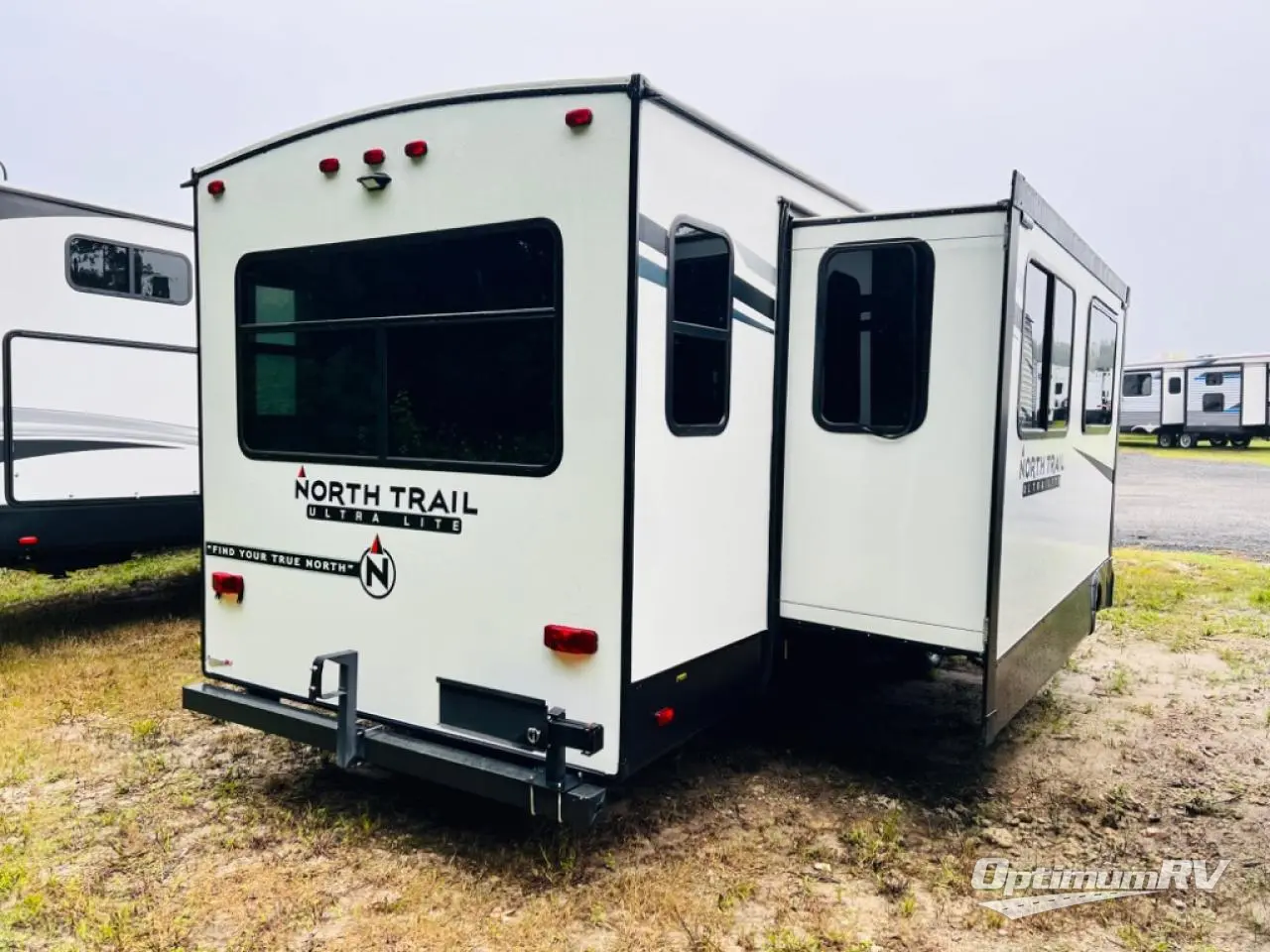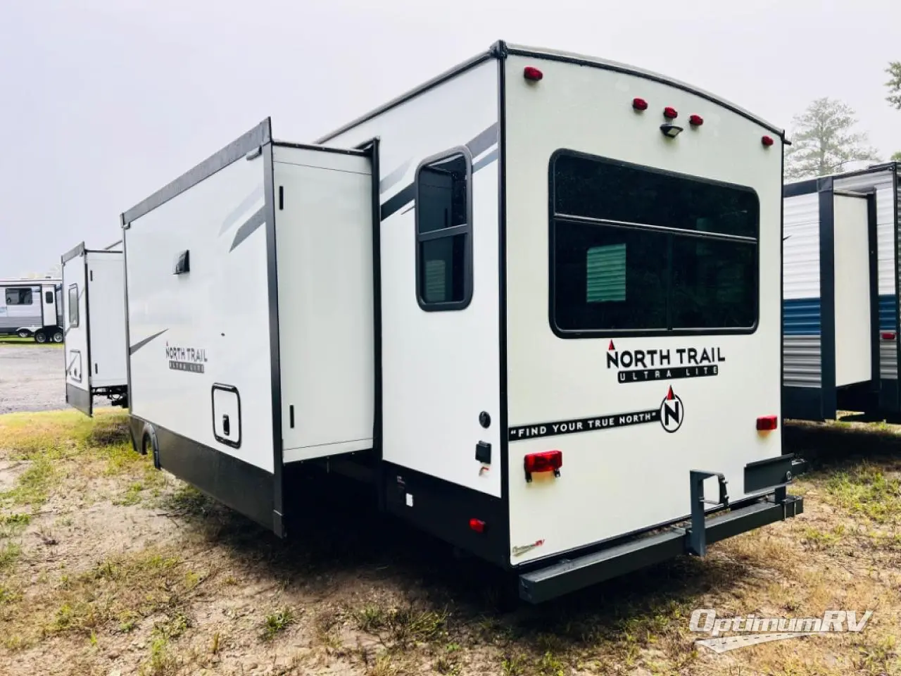 When you choose a North Trail travel trailer by Heartland you are choosing comfort, convenience, and quality craftsmanship at its best. The block foam brick insulation, enclosed and heated underbelly, plus Weather Guard thermal protection mean you can camp all year around. Each model features a Wide Trax suspension for a smooth ride, and the backup camera prep and solar prep make camping that much easier if you choose those options. Some of the other exterior features you will appreciate are the outside shower, the power stabilizer jacks and power tongue jack, and the outside speakers to keep the party going. Head inside to find stainless steel appliances, oversized windows, and premium flooring that is tear, slip, mold, mildew and cold crack resistant! You can't beat a North Trail travel trailer. Choose your favorite floorplan today!