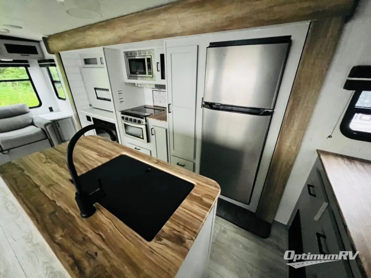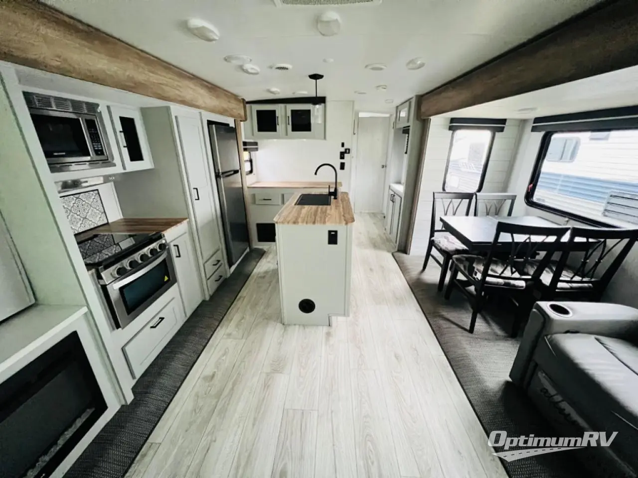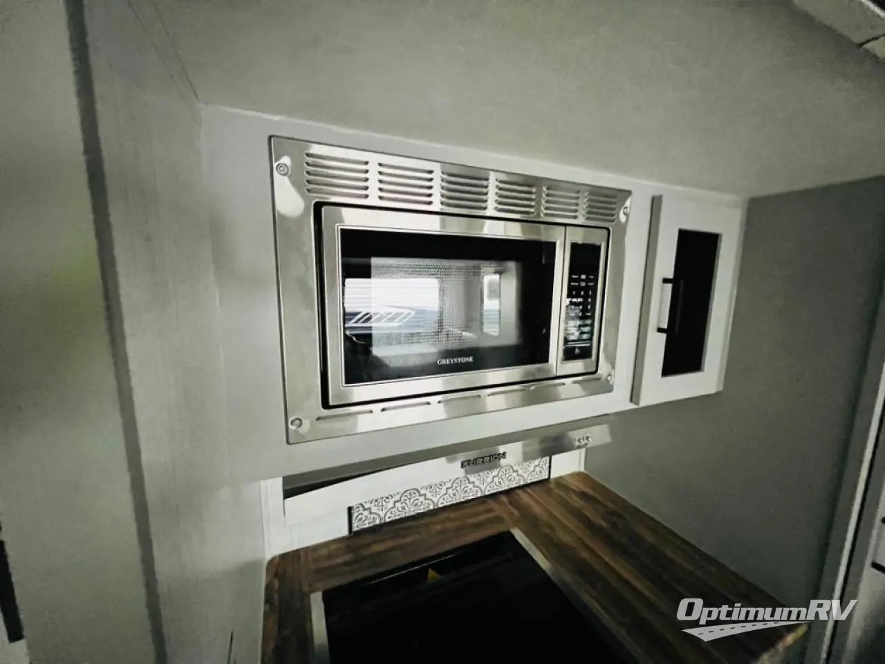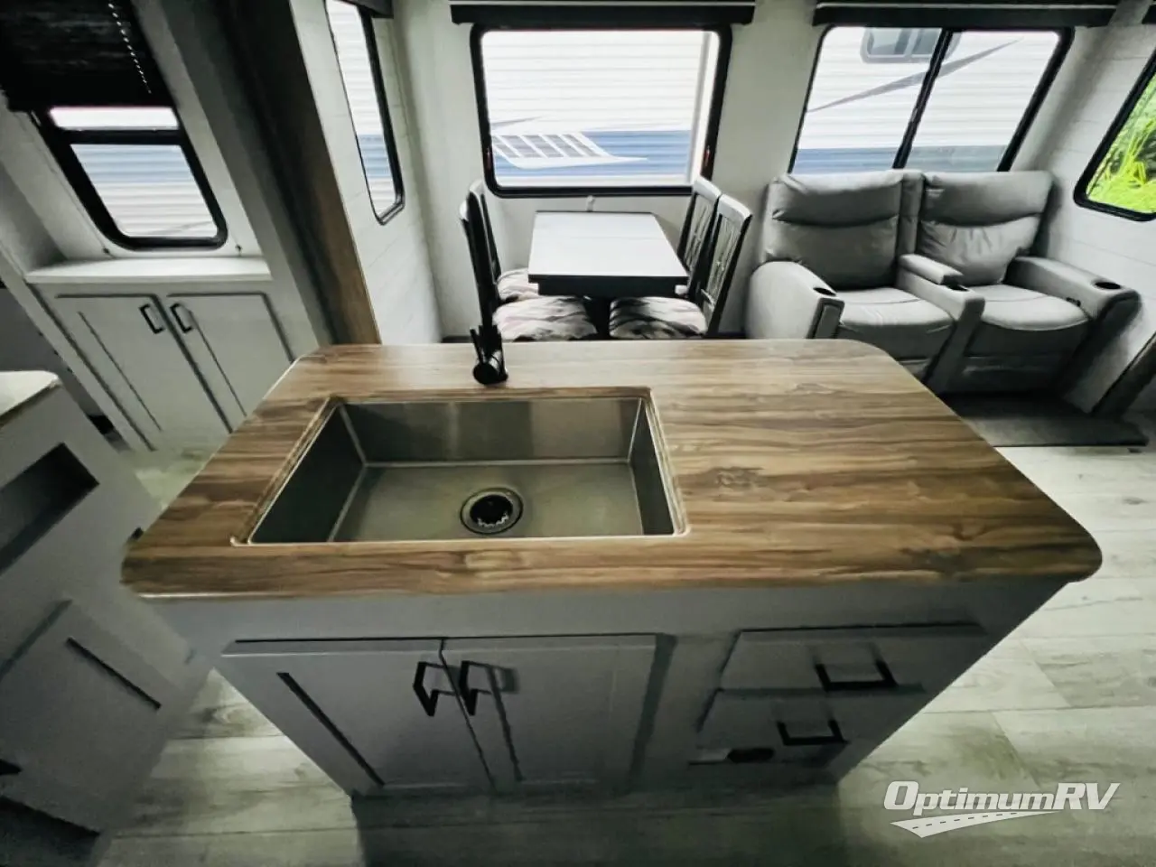 You'll feel right at home in this spacious travel trailer. Once you arrive at your destination, set up the 14' power awning, and enjoy a cold drink before unpacking. The rear living area includes a sofa with end tables, a table with chairs, plus theater seats right across from the entertainment center. The chef of your group will appreciate the extra counter space provided by the kitchen island, plus there is a hutch with even more storage and counter space. Meals can be prepared on the three burner range, and snacks can be stored in the large pantry. This model also includes a dual entry bath that will create a front master bedroom you are sure to love. Here, you'll find a slide out king bed, a dresser with overhead cabinets, plus a walk-in closet that also includes washer and dryer prep. Going full-time has never been easier than in this travel trailer!