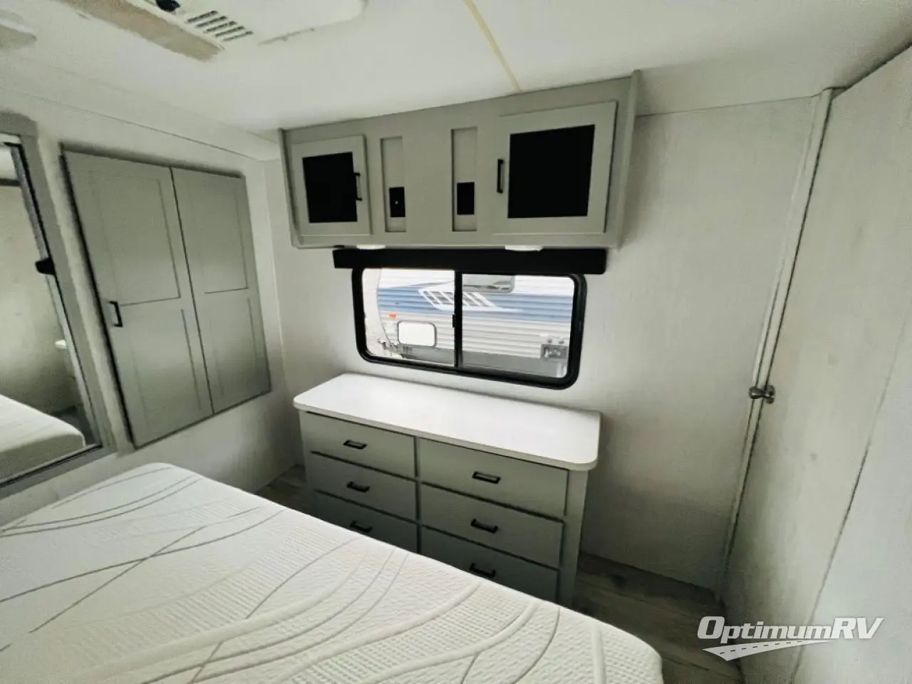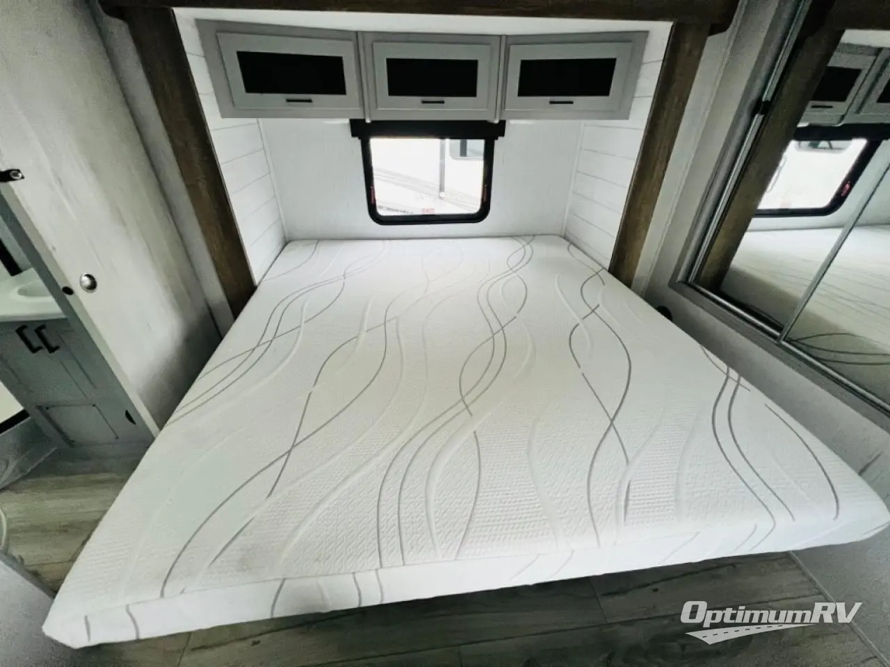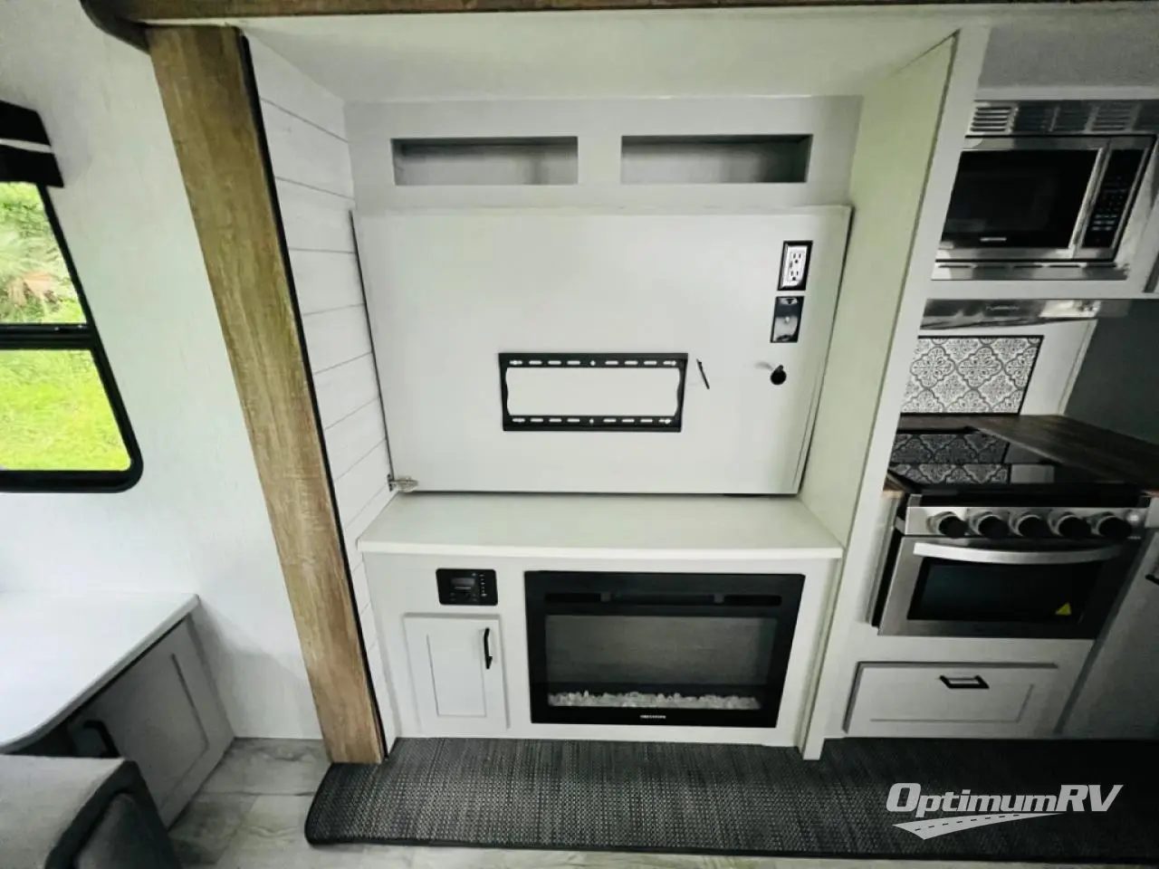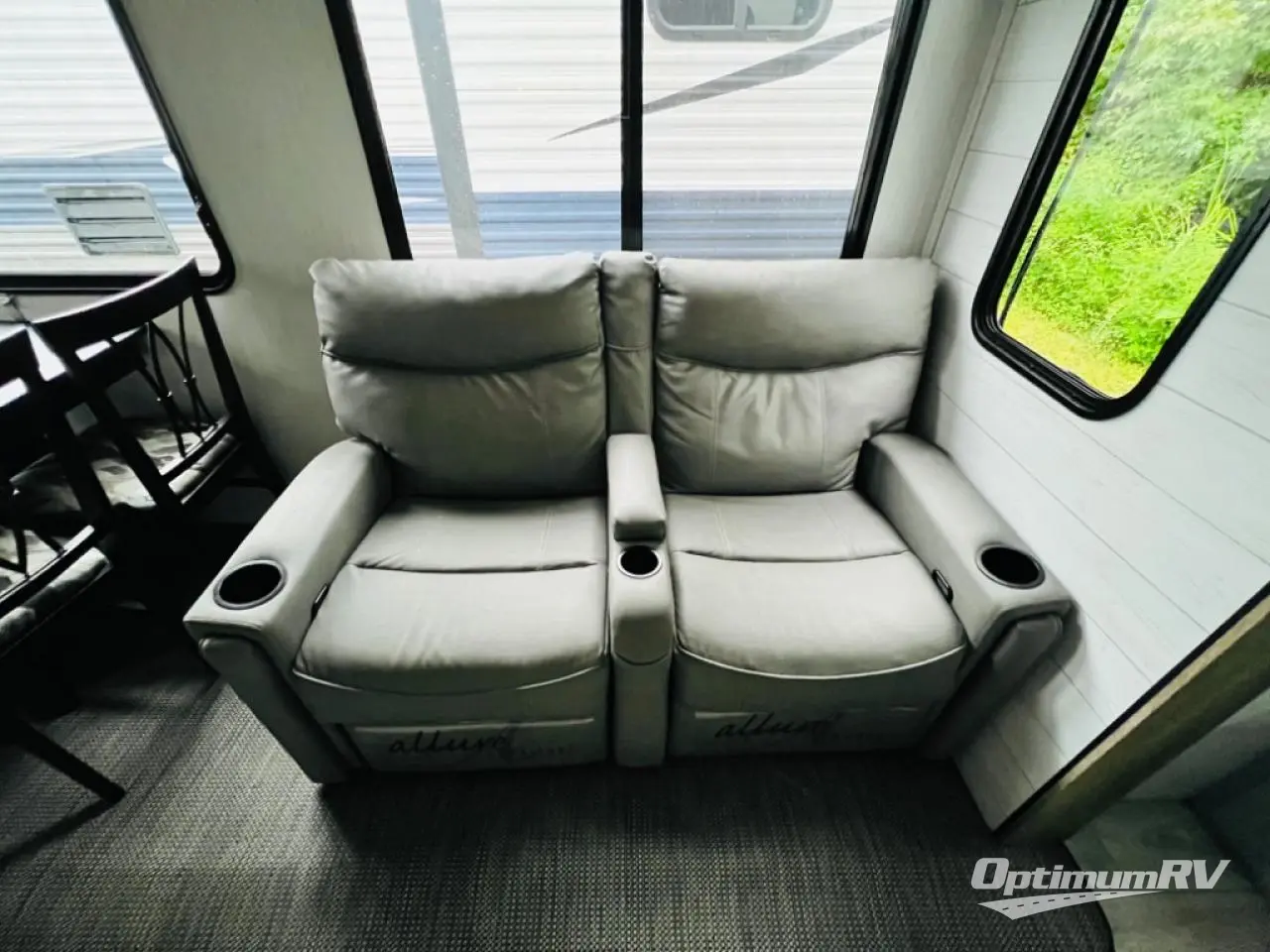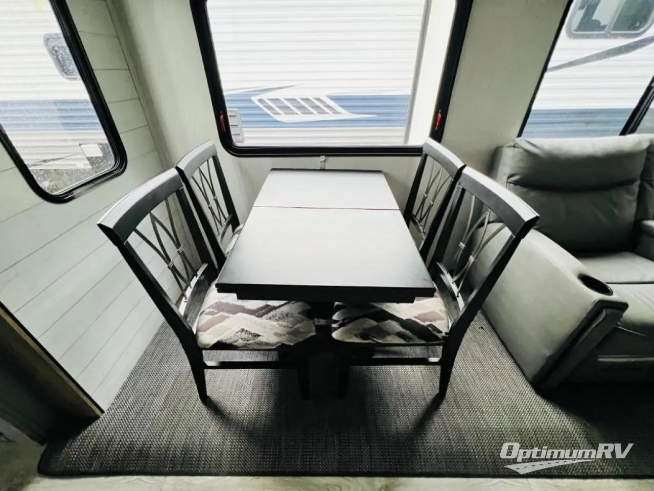 You'll feel right at home in this spacious travel trailer. Once you arrive at your destination, set up the 14' power awning, and enjoy a cold drink before unpacking. The rear living area includes a sofa with end tables, a table with chairs, plus theater seats right across from the entertainment center. The chef of your group will appreciate the extra counter space provided by the kitchen island, plus there is a hutch with even more storage and counter space. Meals can be prepared on the three burner range, and snacks can be stored in the large pantry. This model also includes a dual entry bath that will create a front master bedroom you are sure to love. Here, you'll find a slide out king bed, a dresser with overhead cabinets, plus a walk-in closet that also includes washer and dryer prep. Going full-time has never been easier than in this travel trailer!