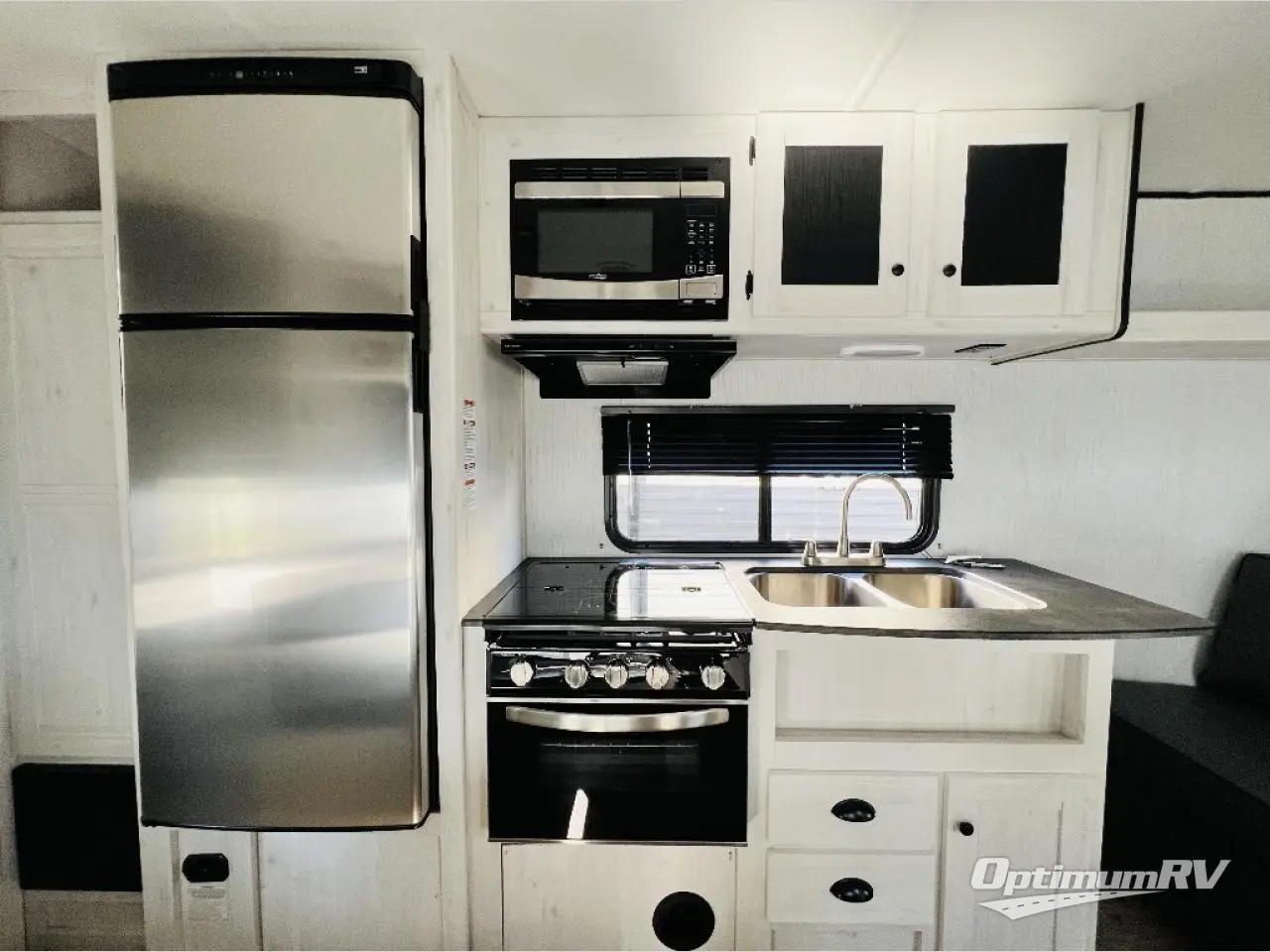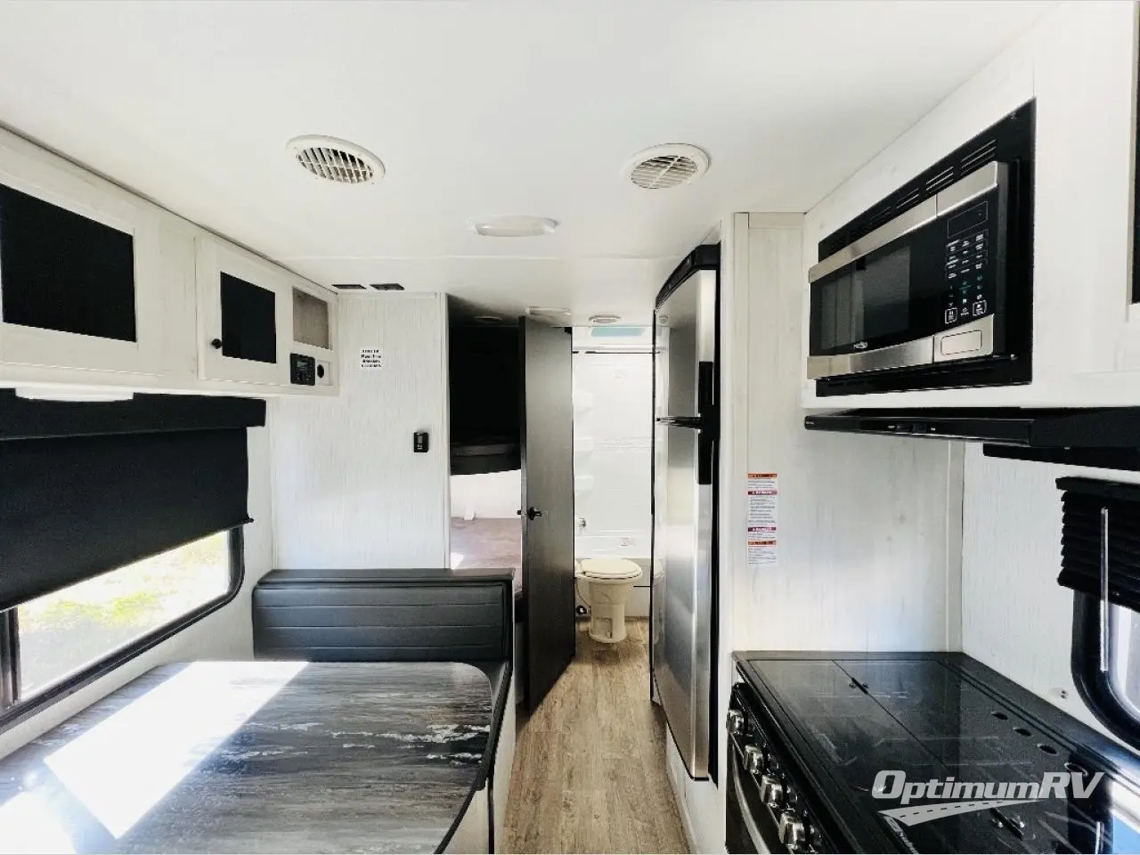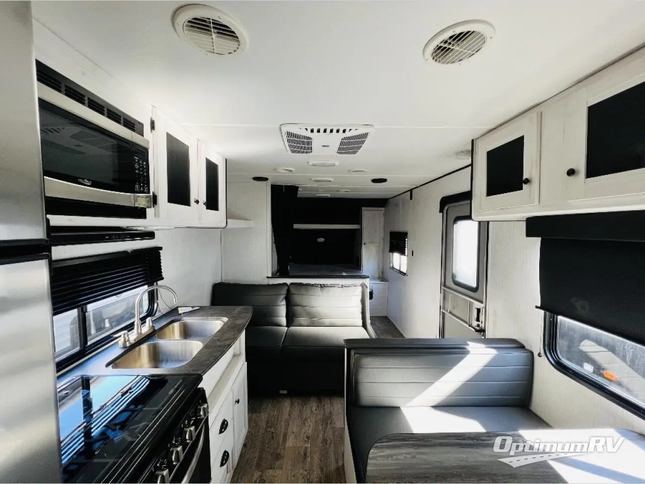 The whole family will love camping in this travel trailer! It has everything you need from a set of double bunk beds to a 14' power awning with LED light strip and outside shower. The front queen bed has under-bed storage to keep extra blankets or suitcases out of the way. After getting a good night's rest, head to the rear corner bathroom to freshen up in the ABS tub/shower surround with skylight above and then fry some eggs up on the three burner cooktop. You can enjoy your meals at the booth dinette and even convert it into an extra sleeping space, plus there is a sofa to take an afternoon nap!