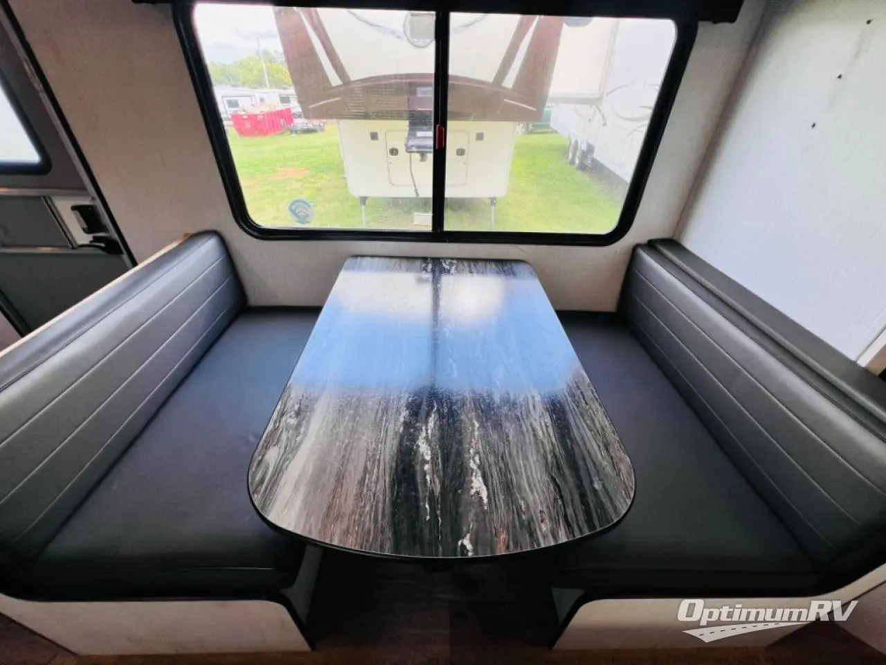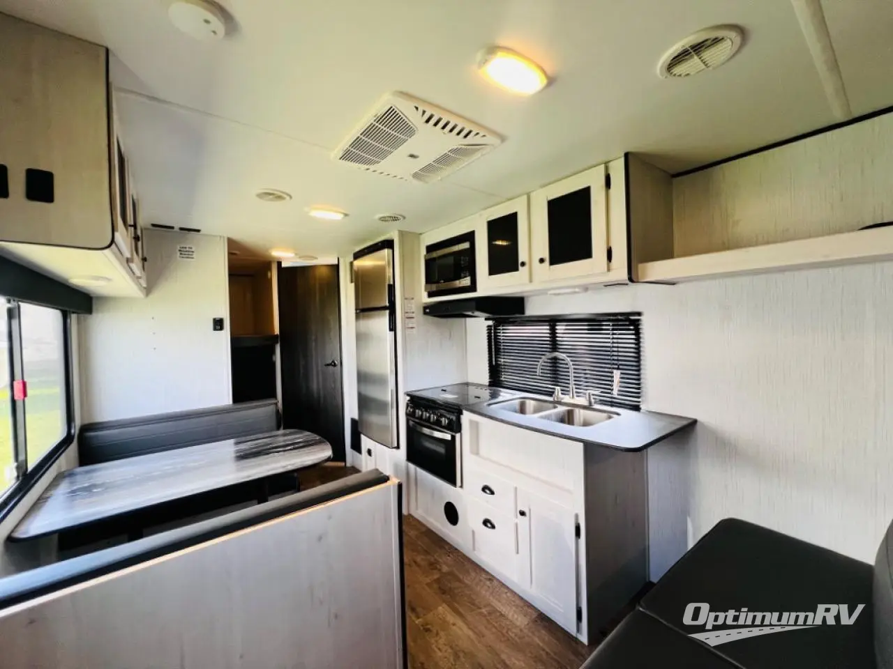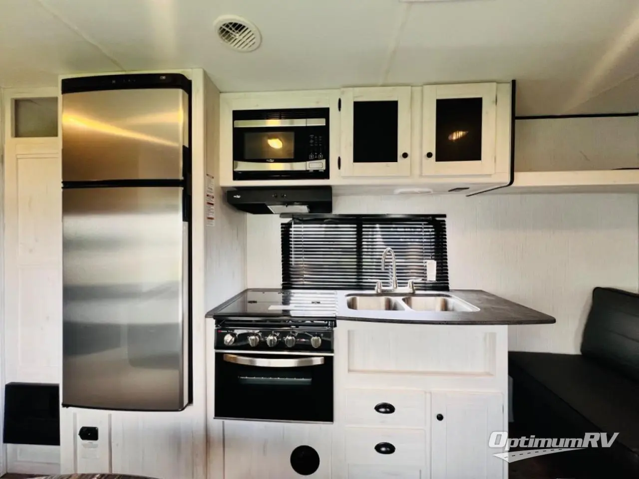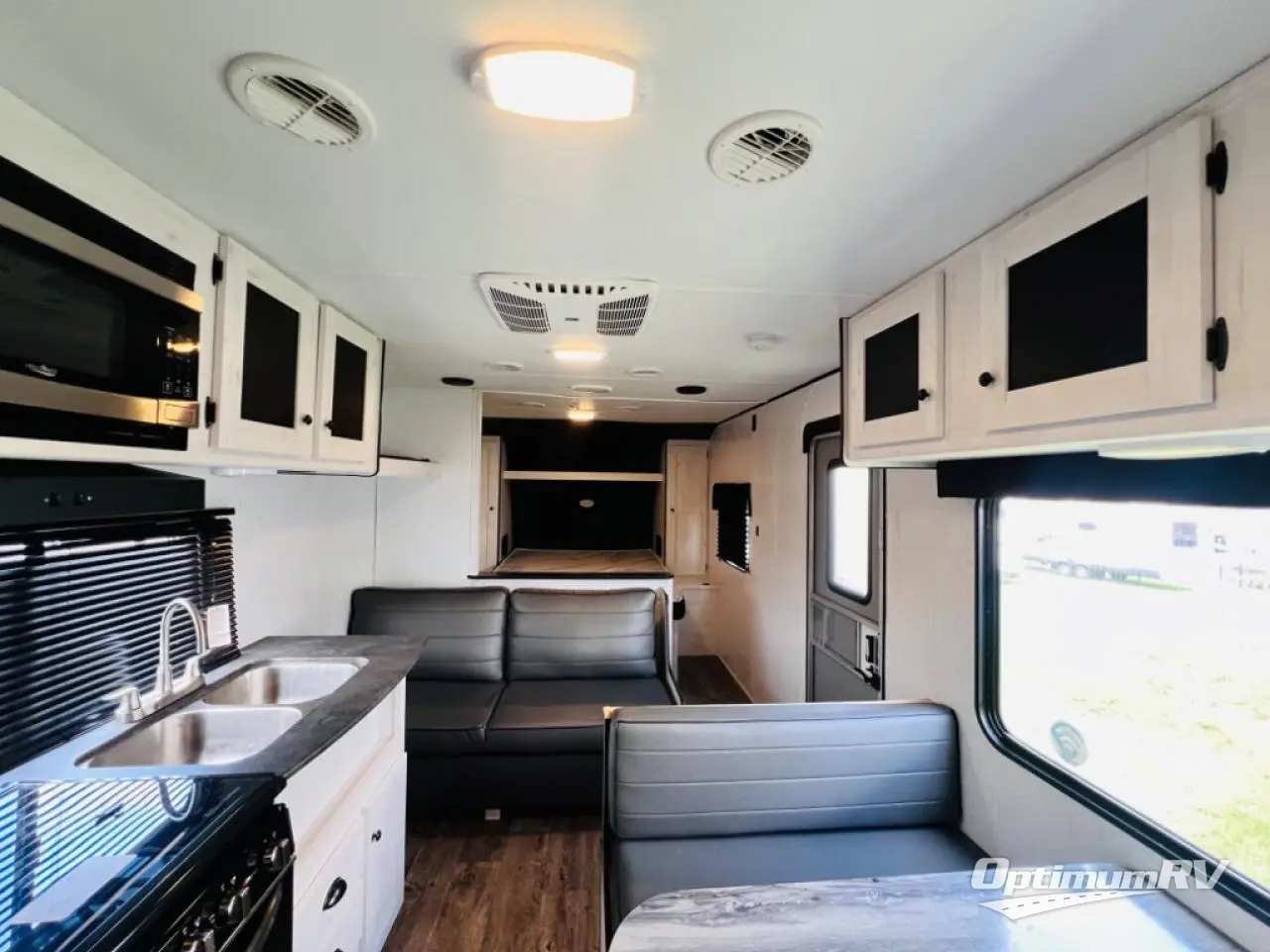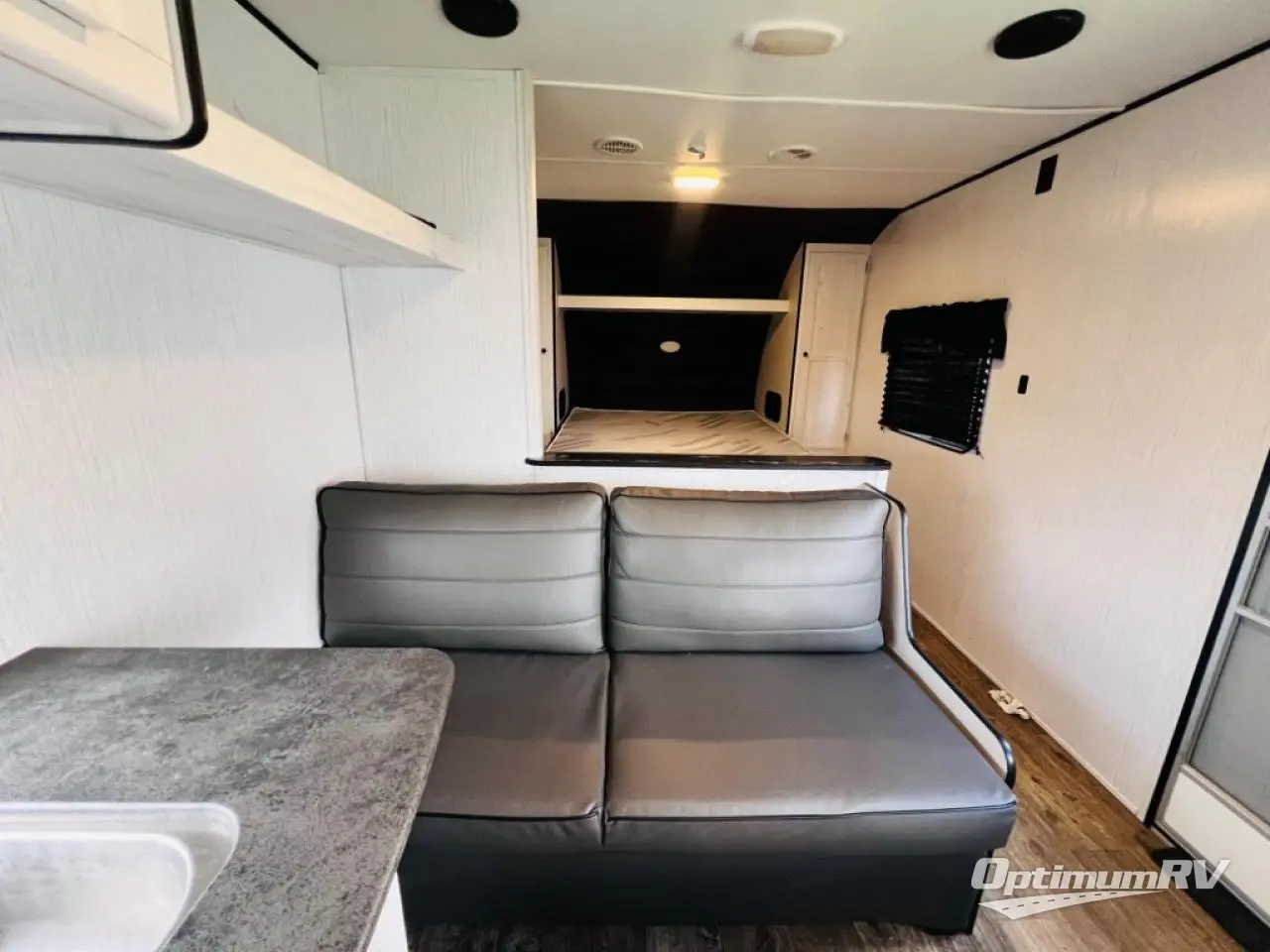 The whole family will love camping in this travel trailer! It has everything you need from a set of double bunk beds to a 14' power awning with LED light strip and outside shower. The front queen bed has under-bed storage to keep extra blankets or suitcases out of the way. After getting a good night's rest, head to the rear corner bathroom to freshen up in the ABS tub/shower surround with skylight above and then fry some eggs up on the three burner cooktop. You can enjoy your meals at the booth dinette and even convert it into an extra sleeping space, plus there is a sofa to take an afternoon nap!