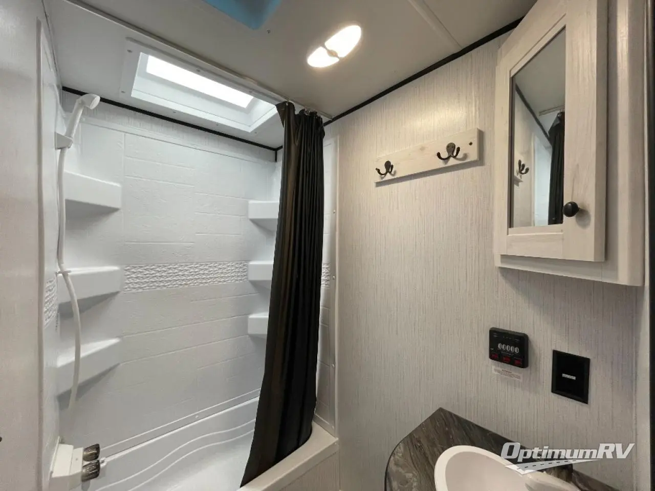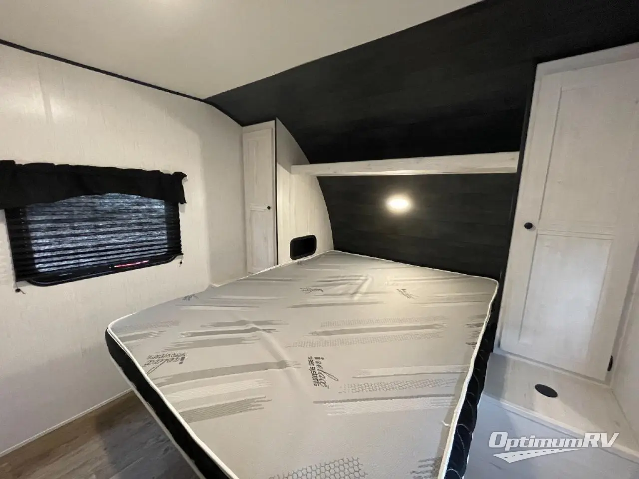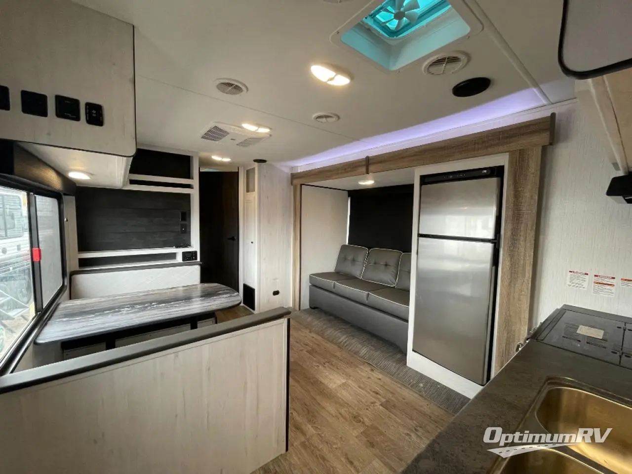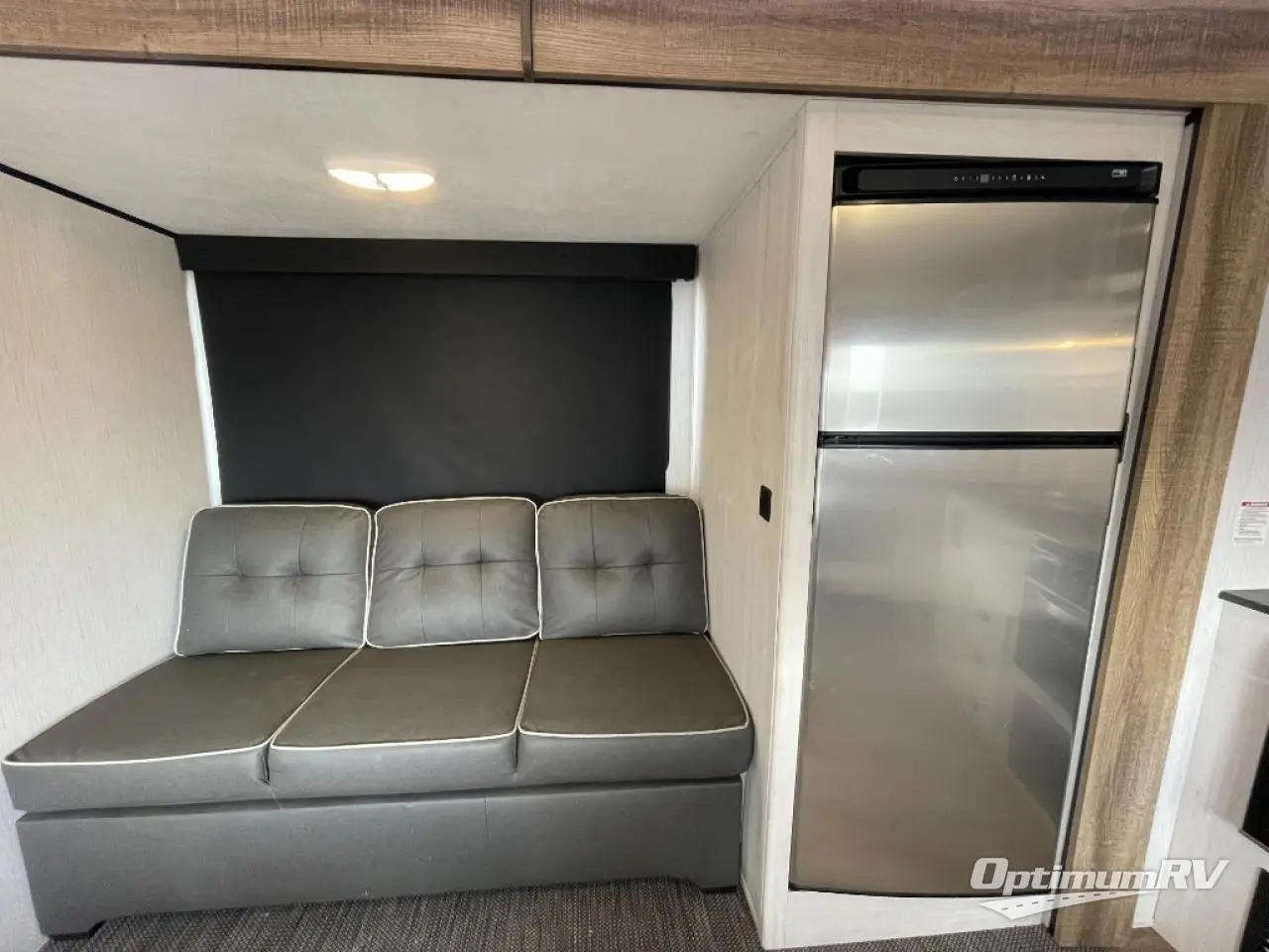 No one will be left behind with this travel trailer! The kiddos can sleep on the set of double bunk beds and you will have your own privacy with the front private bedroom which has a queen bed with under-bed storage and wireless cell charging stations for one less thing to bring with you. The chef can whip up their best meals with the three burner cooktop and everyone can enjoy them together at the booth dinette then play a card game or two. If you're not big into card games then you can relax on the sofa while you enjoy a cold drink stored in the 10 cu. ft. stainless steel refrigerator. Freshen up each day in the rear corner bathroom with the ABS tub/shower surround with a skylight above it!