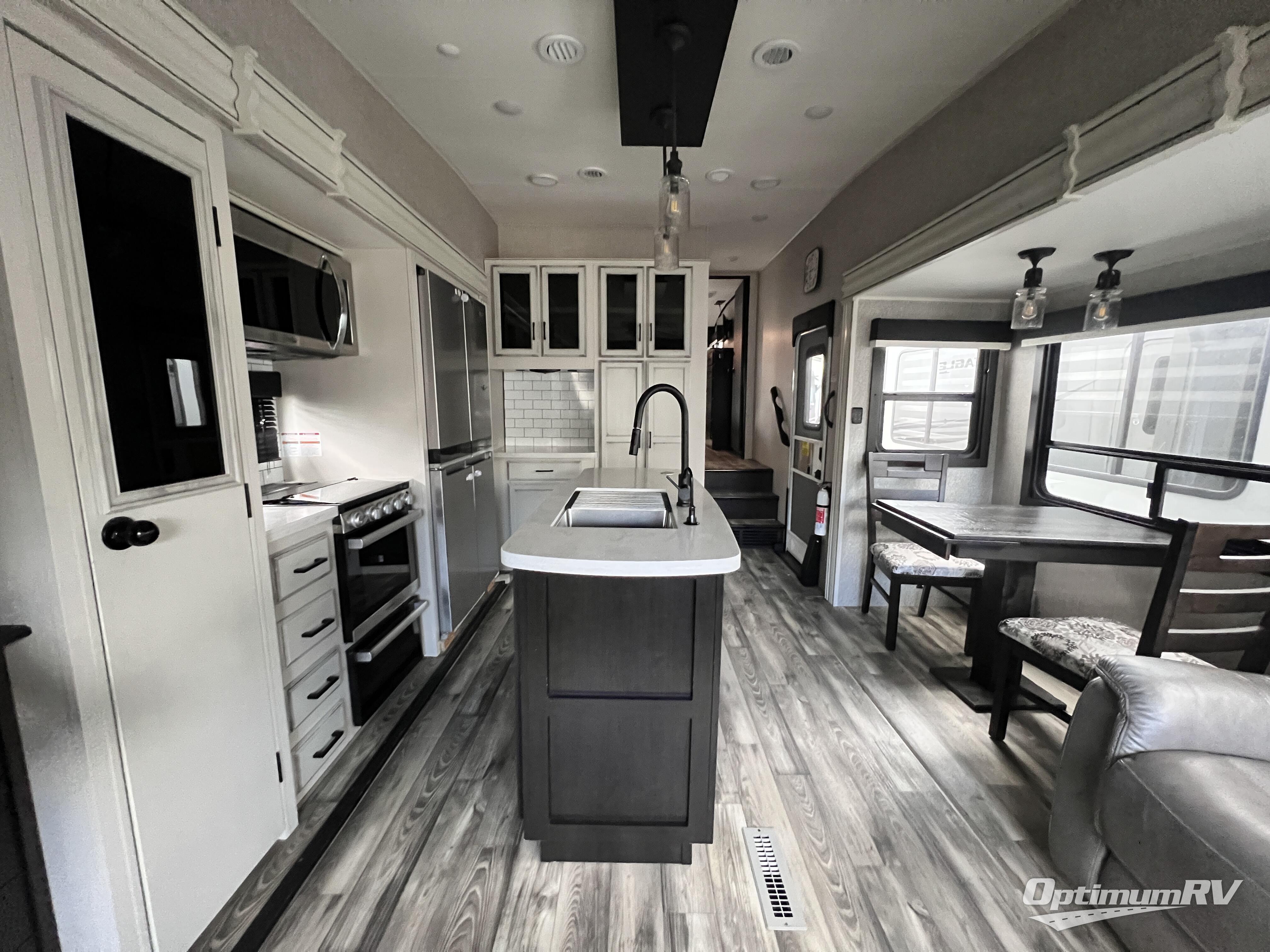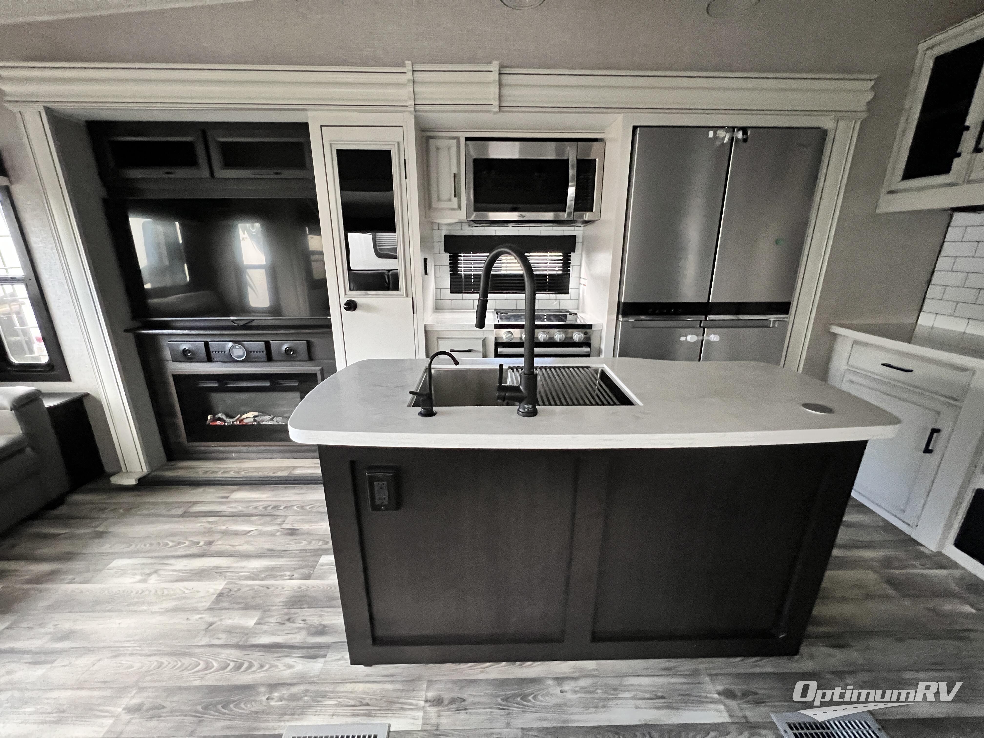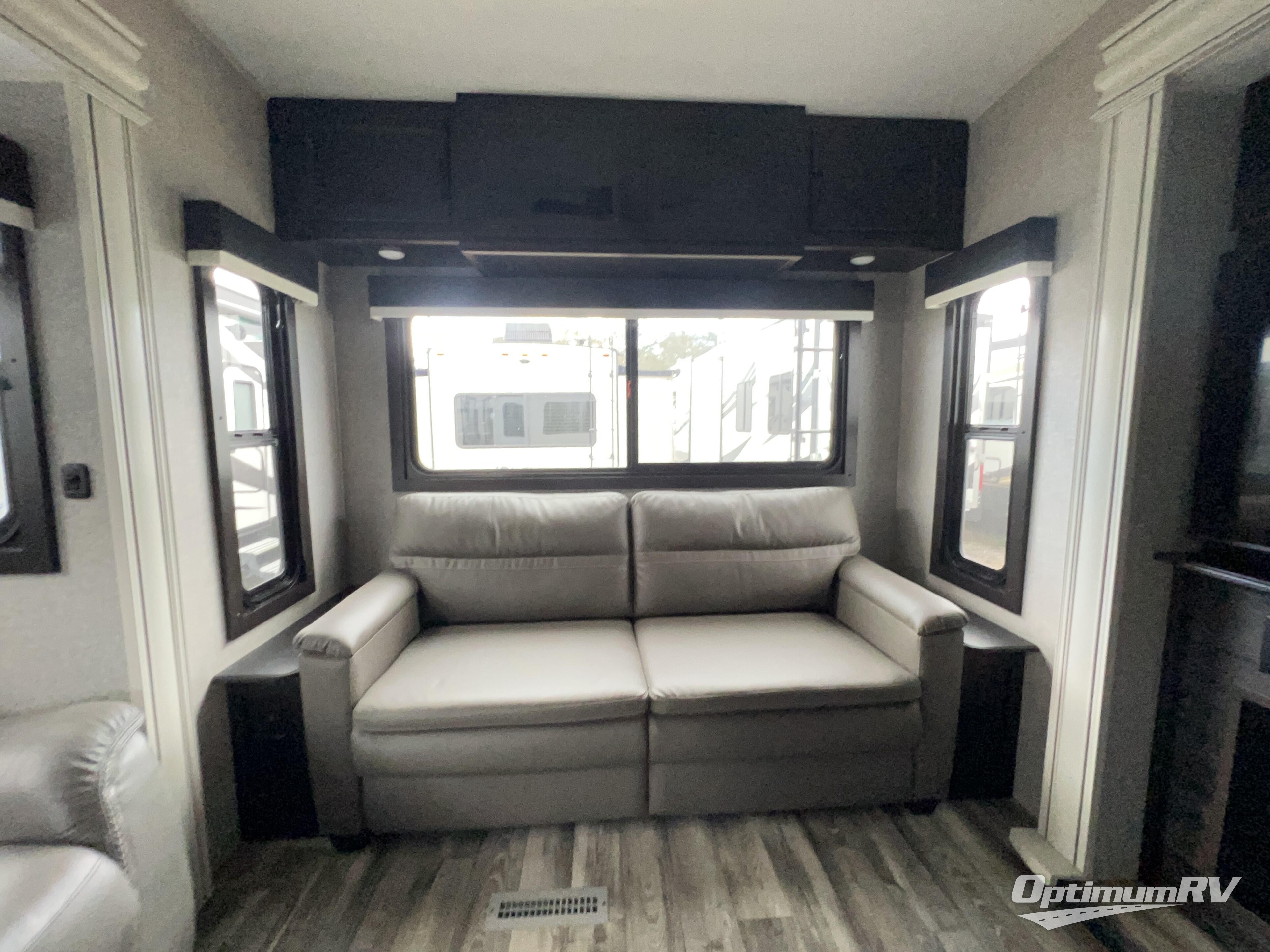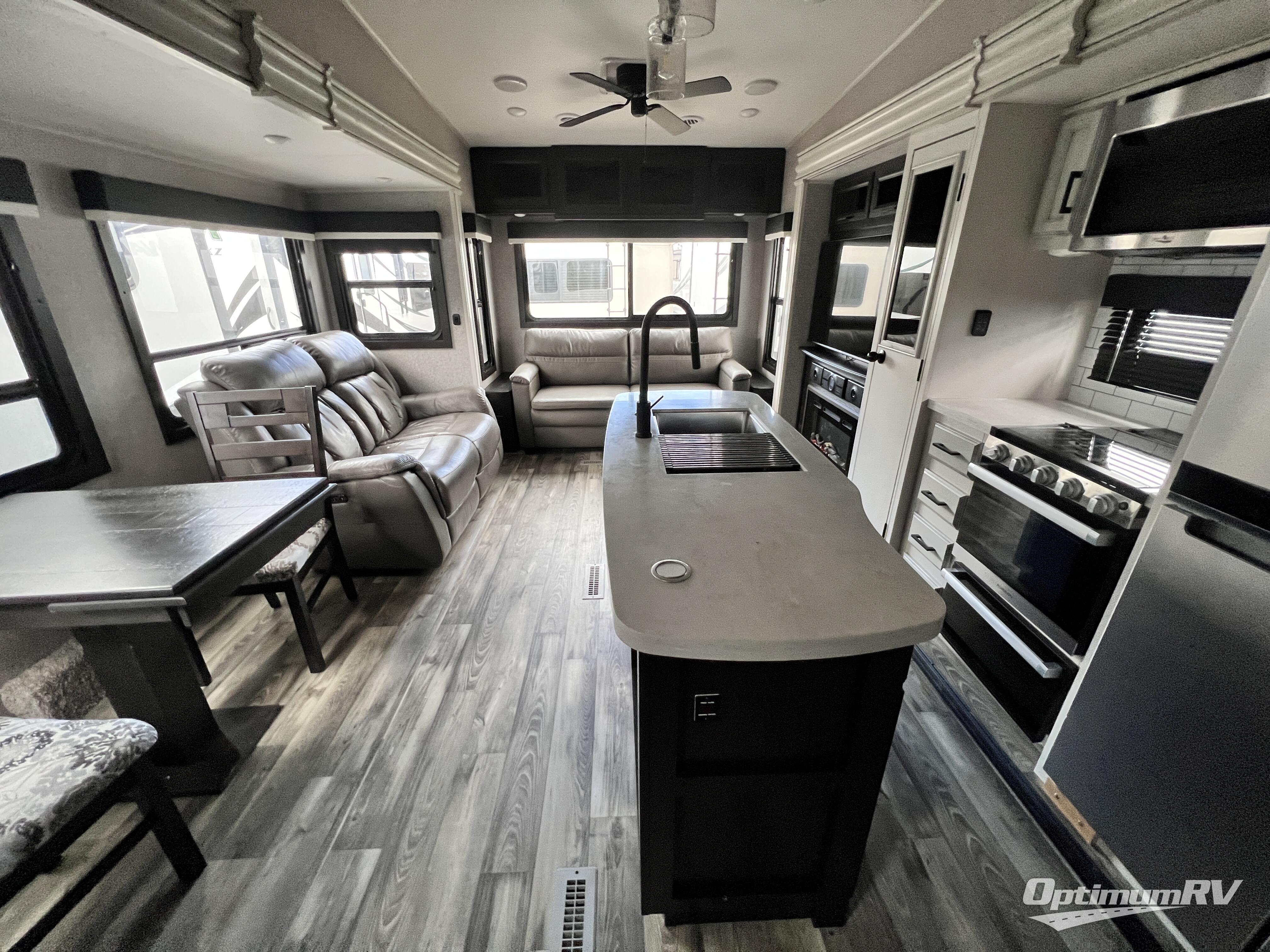 Triple slides for space, plenty of seating spaces, plus a spacious private bedroom make this fifth wheel one you won't want to pass up! You can freshen up each day in the full bath that includes a shower with a seat, a bathroom skylight, plus blue LED nightlights the little ones are sure to love. Once you've cut up some fresh fruit at the kitchen island, whip up some eggs and bacon for breakfast, or just grab the cereal from the walk-in pantry. There is a spacious 21 cu. ft. residential refrigerator, plus a hutch where you can store your own coffee machine. Relax on the tri-fold sofa, theater seat, or free-standing table before heading out for the day. The queen bed slide out in the front private bedroom will be waiting for you when you return, or you can choose the optional king bed for more space to stretch out!